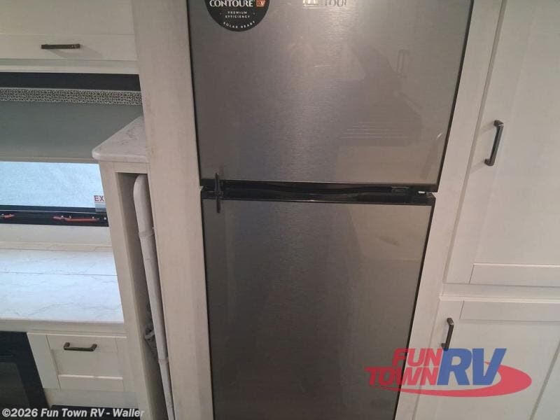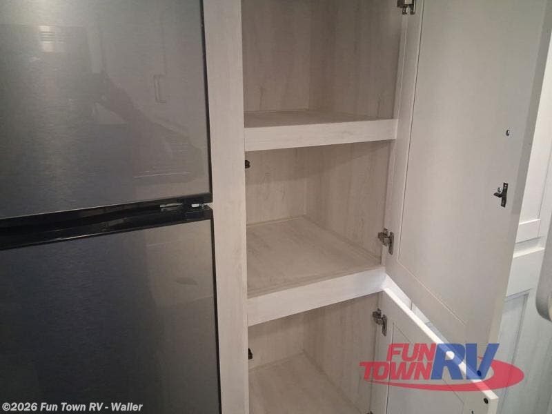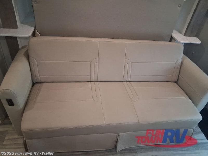 You will love this versatile coach for two! The slide out contains the sofa that converts to a Murphy bed at night, giving you more floor space during the day! There is a 40" LED HDTV across from the sofa for easy viewing, and you can even add an optional fireplace here if you want more comfort. A three-burner range with an oven will let you make your best meals, and there is a 10-cu. ft. 12V double door refrigerator to keep your cold items fresh. The back of this coach is shared with the private toilet and shower, with the sink just outside the door plus a spacious wardrobe for your clothes!