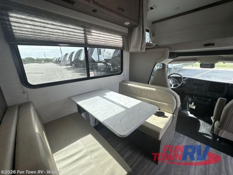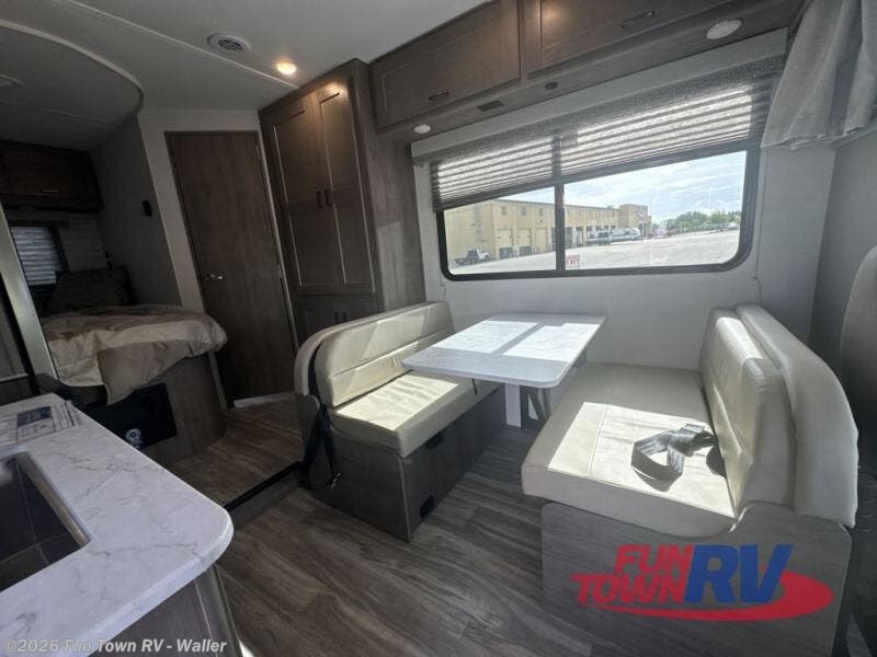 Enjoy a home on wheels with this motorhome! It features an overhead bunk with an insert and an optional TV with swing arm for extra entertainment. The booth dinette offers a comfortable place to enjoy your meals and play card games, as well as transform into an extra sleeping space. The other sleeping space is the corner 60" x 74" queen bed with basement storage underneath and overhead cabinets for your items. A rear corner bathroom lets you get squeaky clean each morning, and you can prepare your best meals with the three-burner cooktop and the 10-cu. ft. 12V double door refrigerator/freezer!