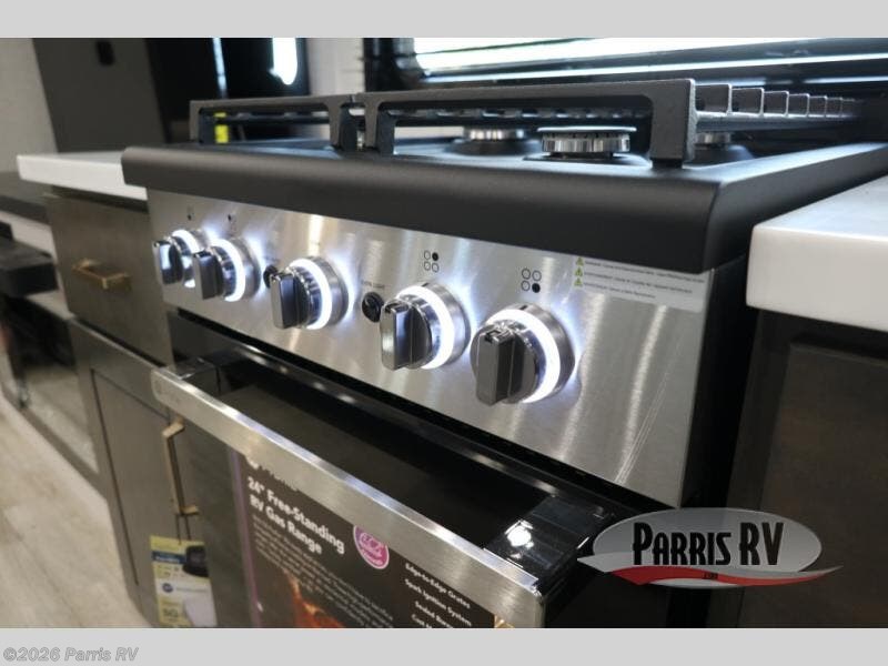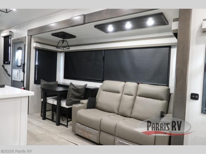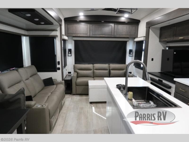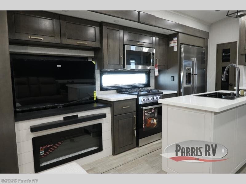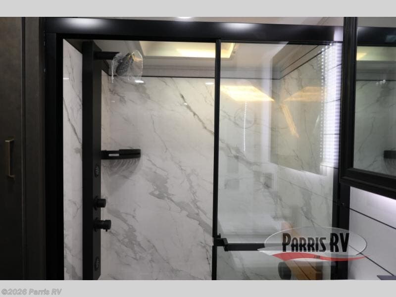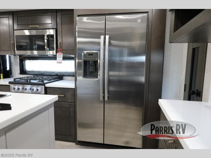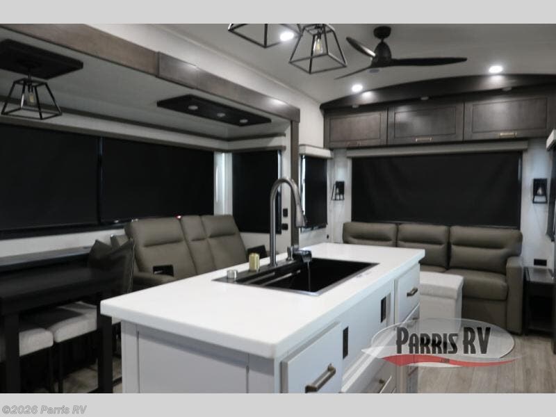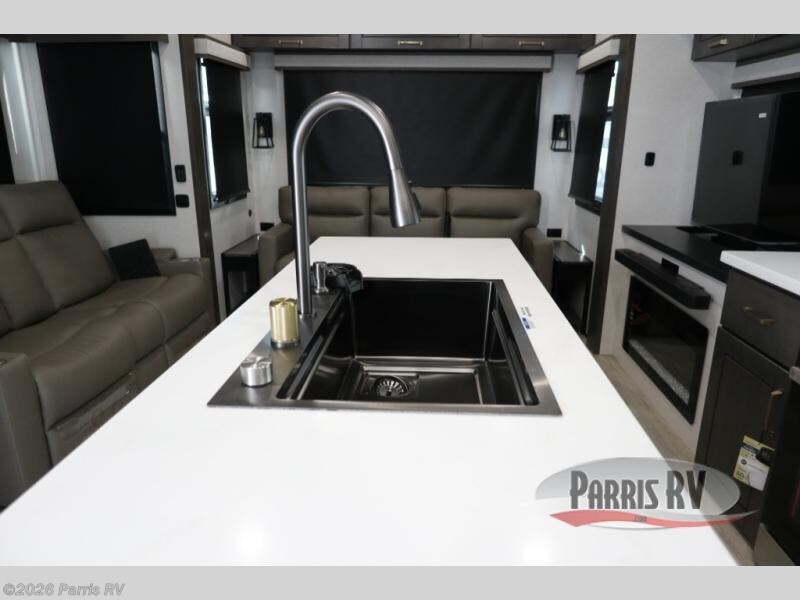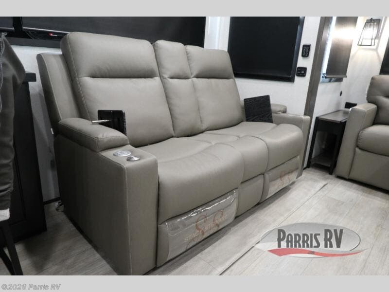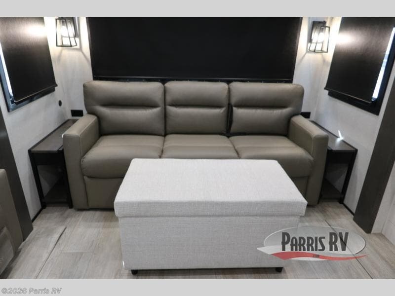 At the front of the unit, the spacious main bedroom offers a 72" x 80" king bed, providing ample room to relax and unwind. A wardrobe with drawers and a built-in hamper ensures plenty of organized storage for clothing and essentials, while a flip-up dresser across from the bed adds even more convenience. Moving down the hall, you’ll find a full bathroom featuring a large 36" x 48" shower with a built-in seat for added comfort. Toward the rear, the main living area has dual opposing slides that open up the space for maximum comfort and functionality. One slide hosts the fully equipped kitchen, complete with overhead cabinets, a convection microwave with built-in air fryer, a 24" range, and a 21-cu. ft. residential refrigerator, everything you need to cook in comfort. The central kitchen island features a residential “Do-It-All” sink with a pull-out faucet, glass rinse, vegetable rinse, and a pull-out cutting board for easy meal prep, while the corner pantry provides generous storage. Opposite the kitchen, you can relax in the theater seating or enjoy meals at the roll-out table. At the rear, a 78" hide-a-bed sofa offers additional lounging space or converts into extra-sleeping accommodations when needed.