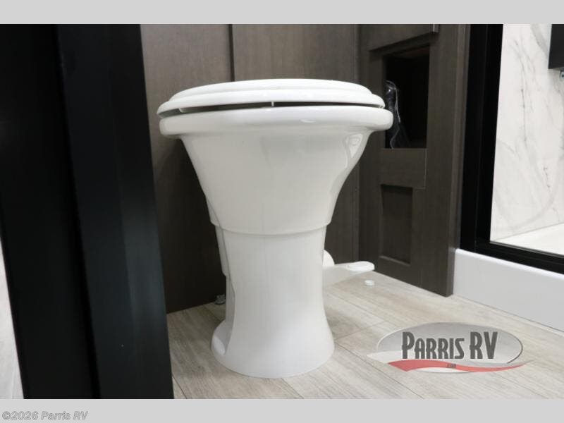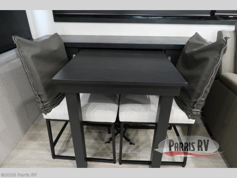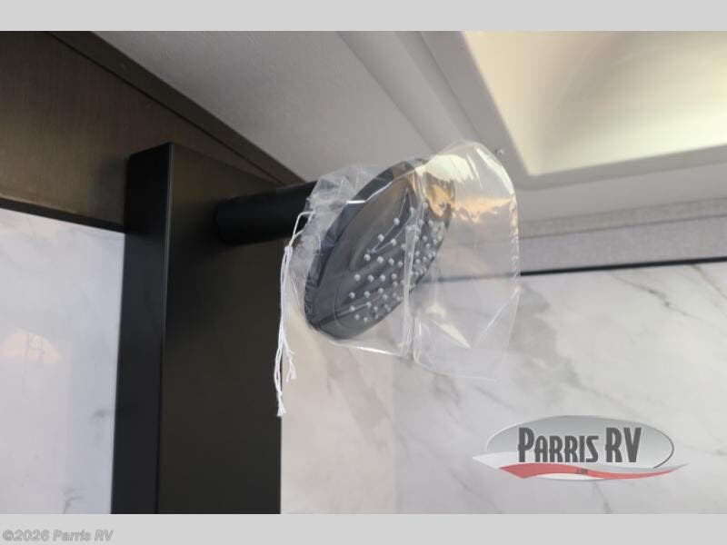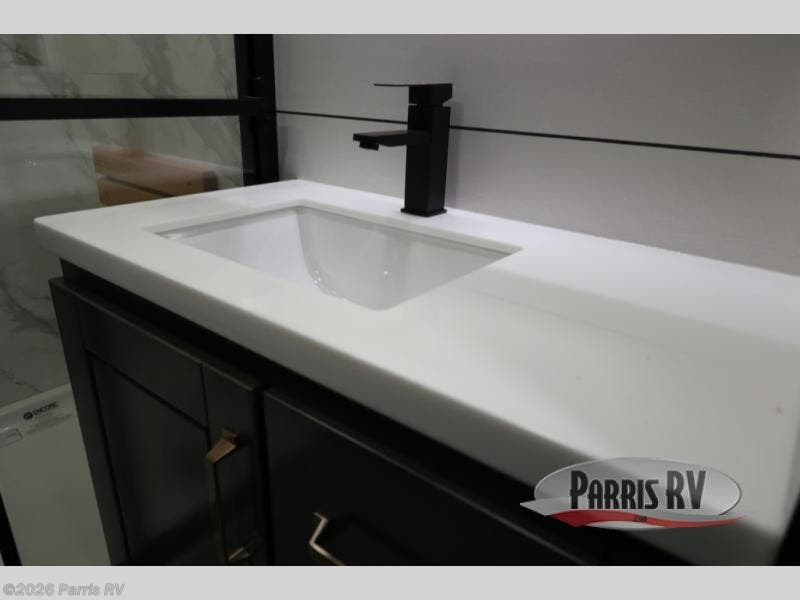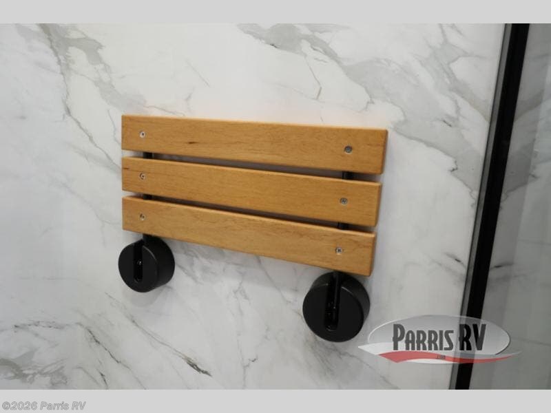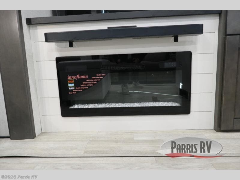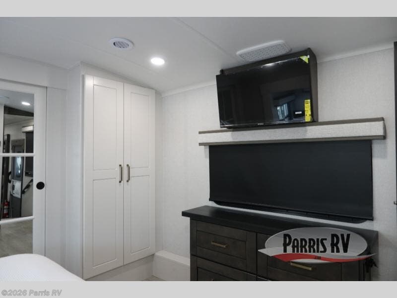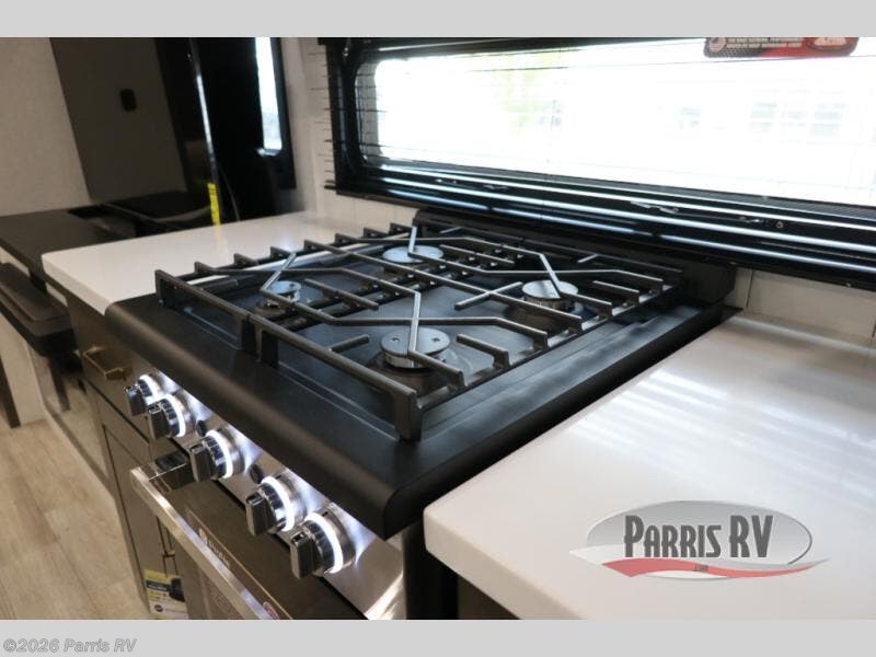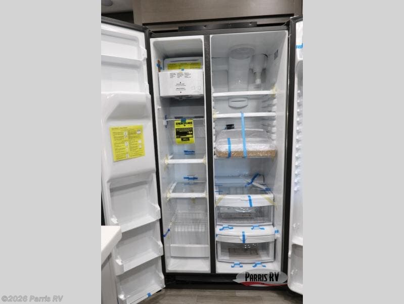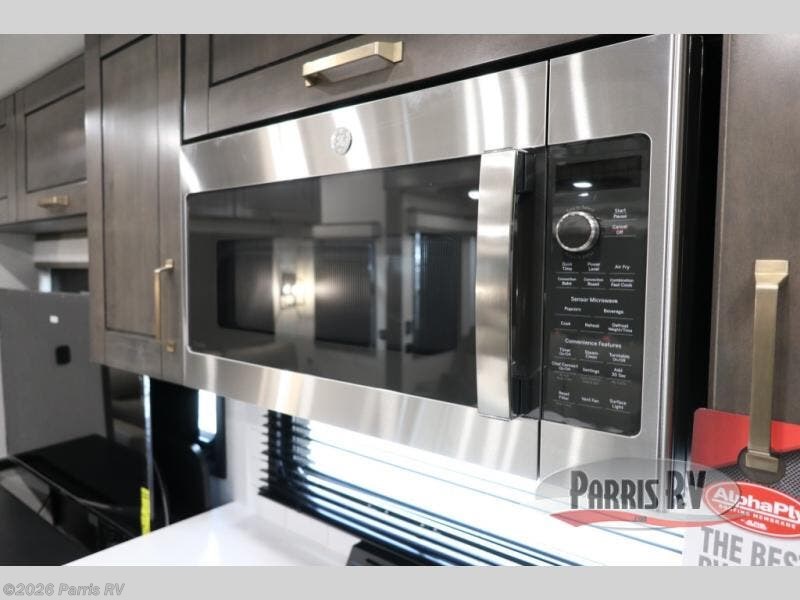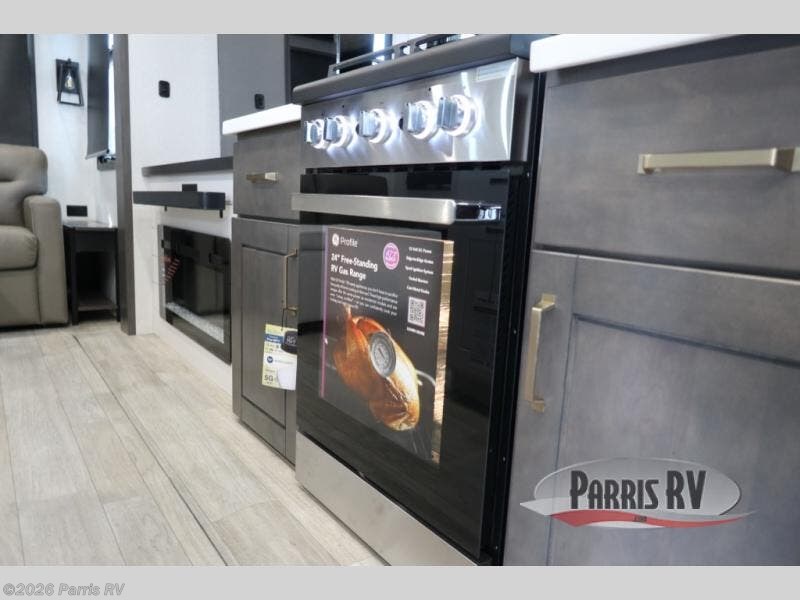 At the front of the unit, the spacious main bedroom offers a 72" x 80" king bed, providing ample room to relax and unwind. A wardrobe with drawers and a built-in hamper ensures plenty of organized storage for clothing and essentials, while a flip-up dresser across from the bed adds even more convenience. Moving down the hall, you’ll find a full bathroom featuring a large 36" x 48" shower with a built-in seat for added comfort. Toward the rear, the main living area has dual opposing slides that open up the space for maximum comfort and functionality. One slide hosts the fully equipped kitchen, complete with overhead cabinets, a convection microwave with built-in air fryer, a 24" range, and a 21-cu. ft. residential refrigerator, everything you need to cook in comfort. The central kitchen island features a residential “Do-It-All” sink with a pull-out faucet, glass rinse, vegetable rinse, and a pull-out cutting board for easy meal prep, while the corner pantry provides generous storage. Opposite the kitchen, you can relax in the theater seating or enjoy meals at the roll-out table. At the rear, a 78" hide-a-bed sofa offers additional lounging space or converts into extra-sleeping accommodations when needed.