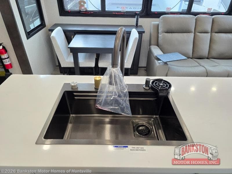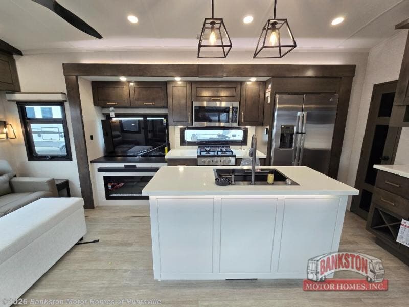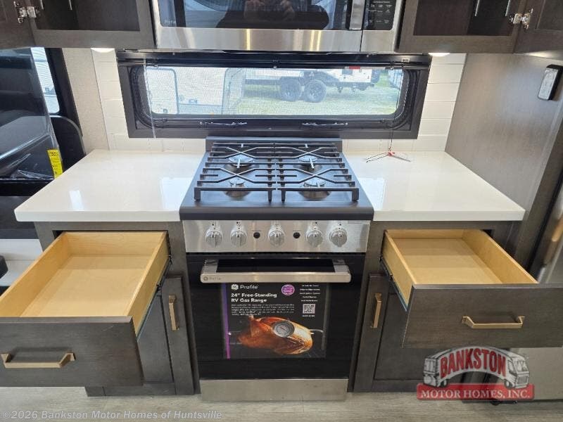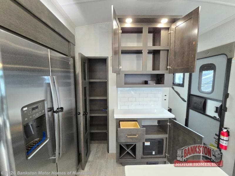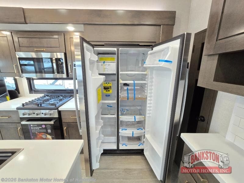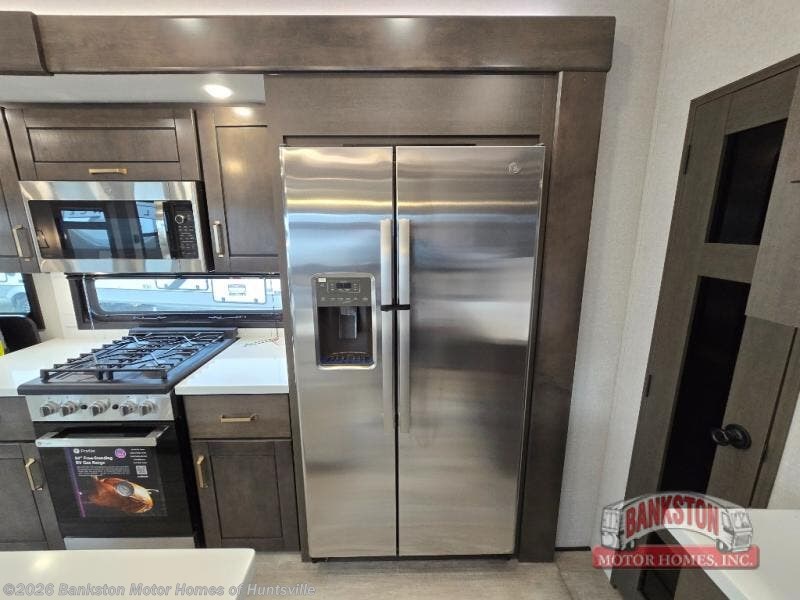 At the front of the unit, the spacious main bedroom offers a 72" x 80" king bed, providing ample room to relax and unwind. A wardrobe with drawers and a built-in hamper ensures plenty of organized storage for clothing and essentials, while a flip-up dresser across from the bed adds even more convenience. Moving down the hall, you’ll find a full bathroom featuring a large 36" x 48" shower with a built-in seat for added comfort. Toward the rear, the main living area has dual opposing slides that open up the space for maximum comfort and functionality. One slide hosts the fully equipped kitchen, complete with overhead cabinets, a convection microwave with built-in air fryer, a 24" range, and a 21-cu. ft. residential refrigerator, everything you need to cook in comfort. The central kitchen island features a residential “Do-It-All” sink with a pull-out faucet, glass rinse, vegetable rinse, and a pull-out cutting board for easy meal prep, while the corner pantry provides generous storage. Opposite the kitchen, you can relax in the theater seating or enjoy meals at the roll-out table. At the rear, a 78" hide-a-bed sofa offers additional lounging space or converts into extra-sleeping accommodations when needed.