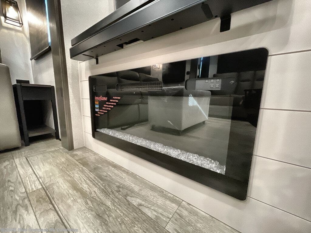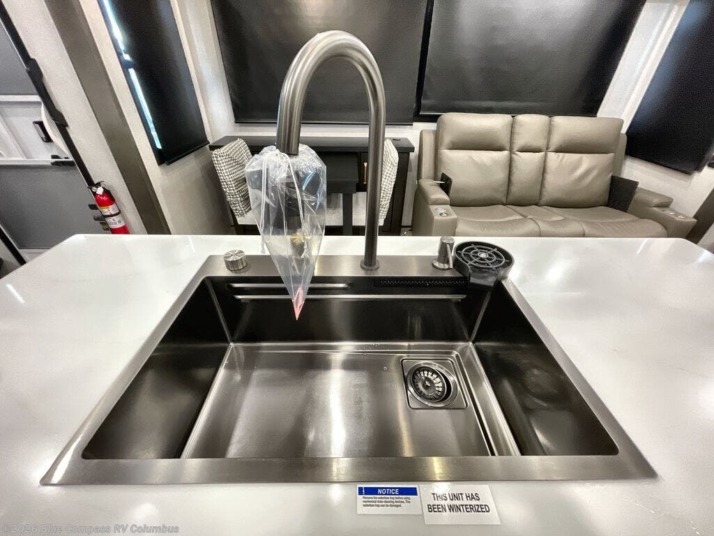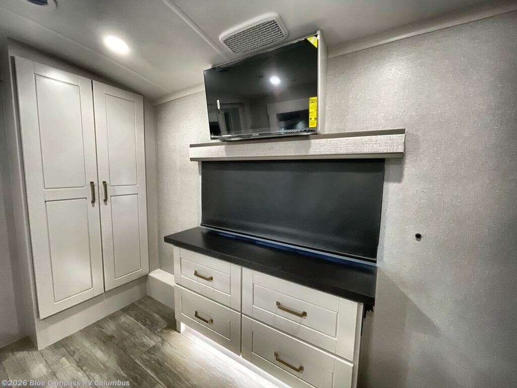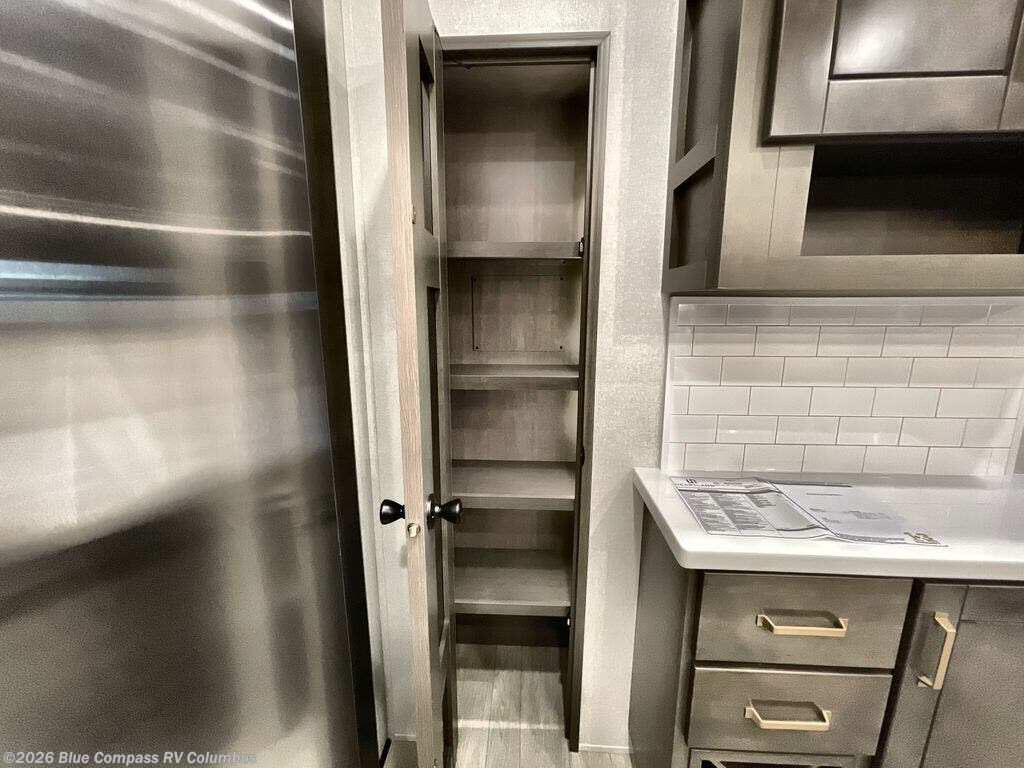 At the front of the unit, the spacious main bedroom offers a 72" x 80" king bed, providing ample room to relax and unwind. A wardrobe with drawers and a built-in hamper ensures plenty of organized storage for clothing and essentials, while a flip-up dresser across from the bed adds even more convenience. Moving down the hall, you’ll find a full bathroom featuring a large 36" x 48" shower with a built-in seat for added comfort. Toward the rear, the main living area has dual opposing slides that open up the space for maximum comfort and functionality. One slide hosts the fully equipped kitchen, complete with overhead cabinets, a convection microwave with built-in air fryer, a 24" range, and a 21-cu. ft. residential refrigerator, everything you need to cook in comfort. The central kitchen island features a residential “Do-It-All” sink with a pull-out faucet, glass rinse, vegetable rinse, and a pull-out cutting board for easy meal prep, while the corner pantry provides generous storage. Opposite the kitchen, you can relax in the theater seating or enjoy meals at the roll-out table. At the rear, a 78" hide-a-bed sofa offers additional lounging space or converts into extra-sleeping accommodations when needed.