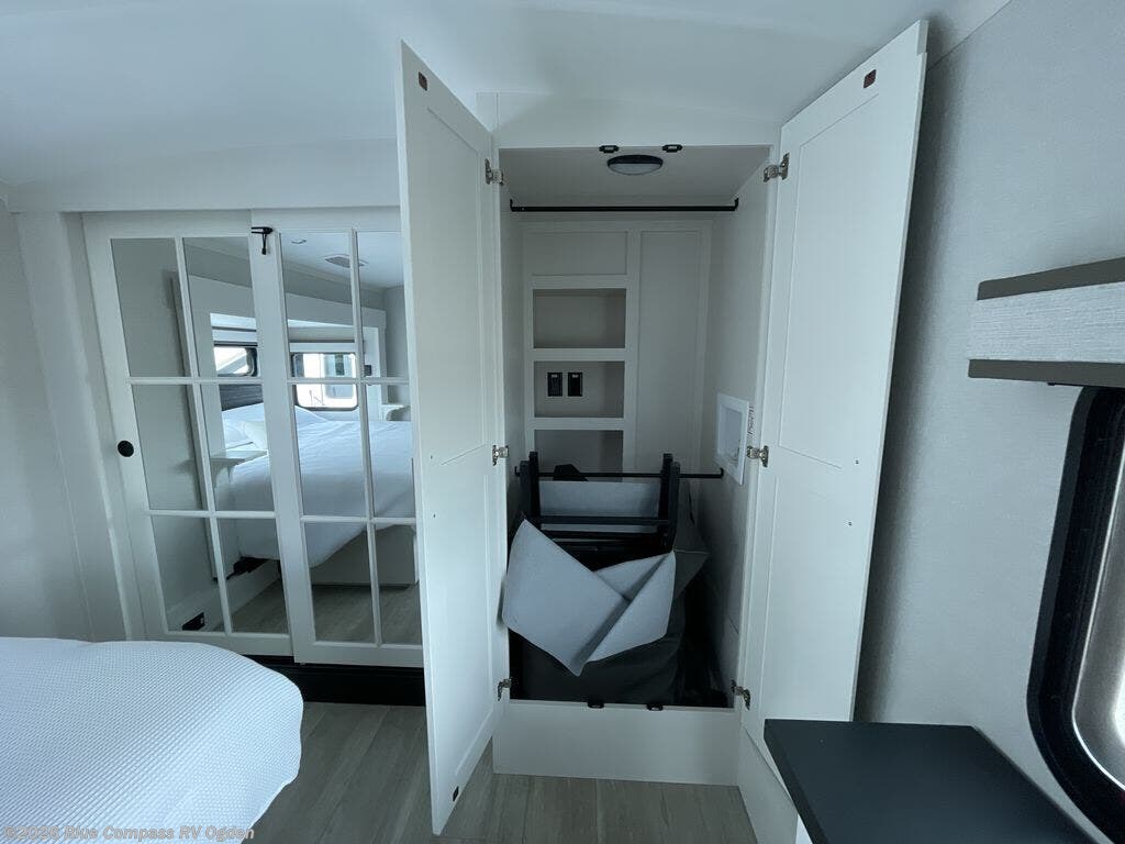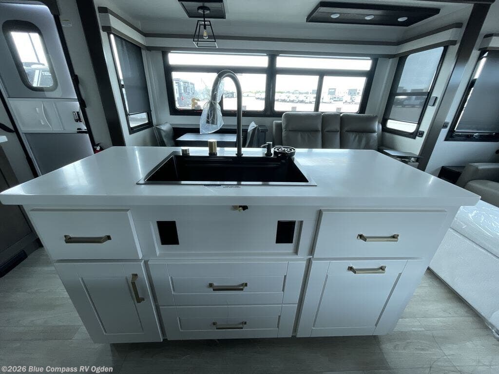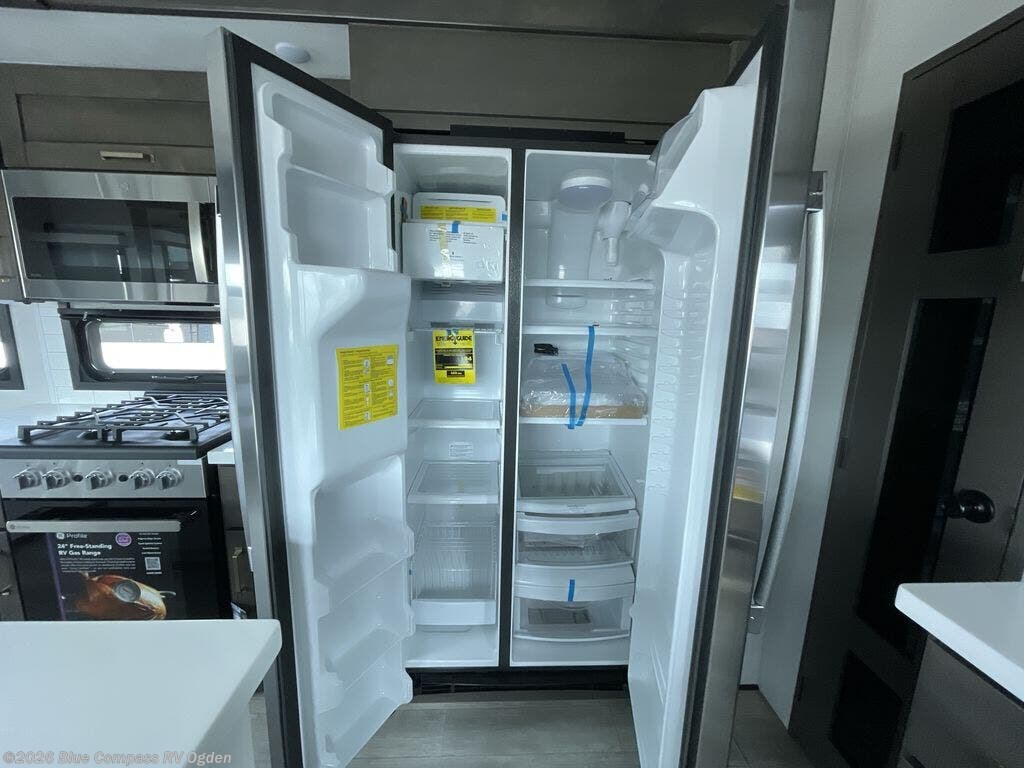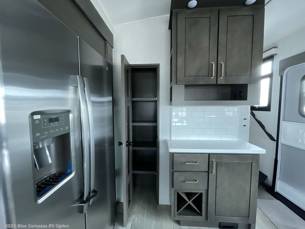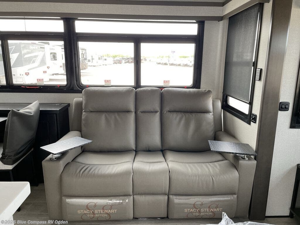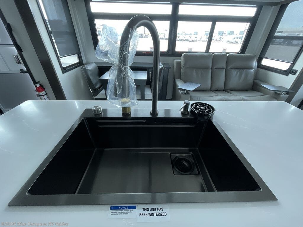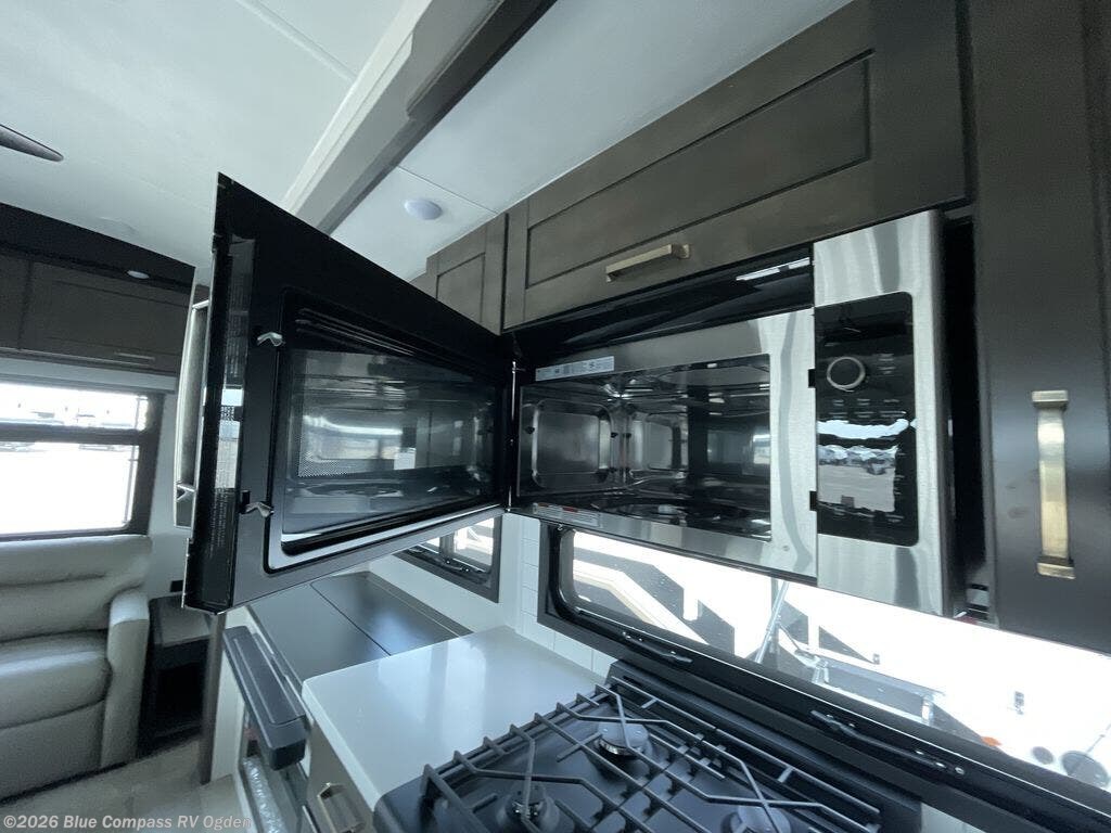 At the front of the unit, the spacious main bedroom offers a 72" x 80" king bed, providing ample room to relax and unwind. A wardrobe with drawers and a built-in hamper ensures plenty of organized storage for clothing and essentials, while a flip-up dresser across from the bed adds even more convenience. Moving down the hall, you’ll find a full bathroom featuring a large 36" x 48" shower with a built-in seat for added comfort. Toward the rear, the main living area has dual opposing slides that open up the space for maximum comfort and functionality. One slide hosts the fully equipped kitchen, complete with overhead cabinets, a convection microwave with built-in air fryer, a 24" range, and a 21-cu. ft. residential refrigerator, everything you need to cook in comfort. The central kitchen island features a residential “Do-It-All” sink with a pull-out faucet, glass rinse, vegetable rinse, and a pull-out cutting board for easy meal prep, while the corner pantry provides generous storage. Opposite the kitchen, you can relax in the theater seating or enjoy meals at the roll-out table. At the rear, a 78" hide-a-bed sofa offers additional lounging space or converts into extra-sleeping accommodations when needed.