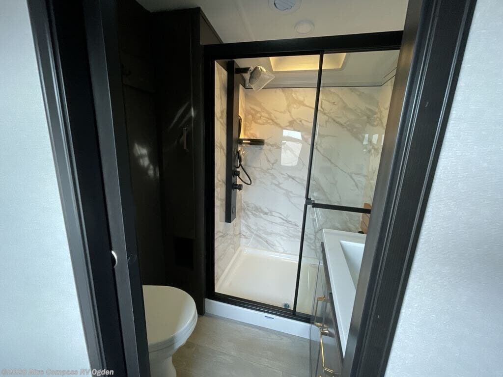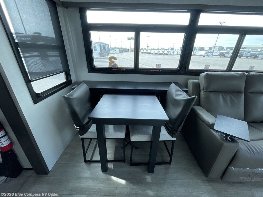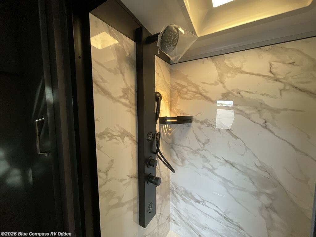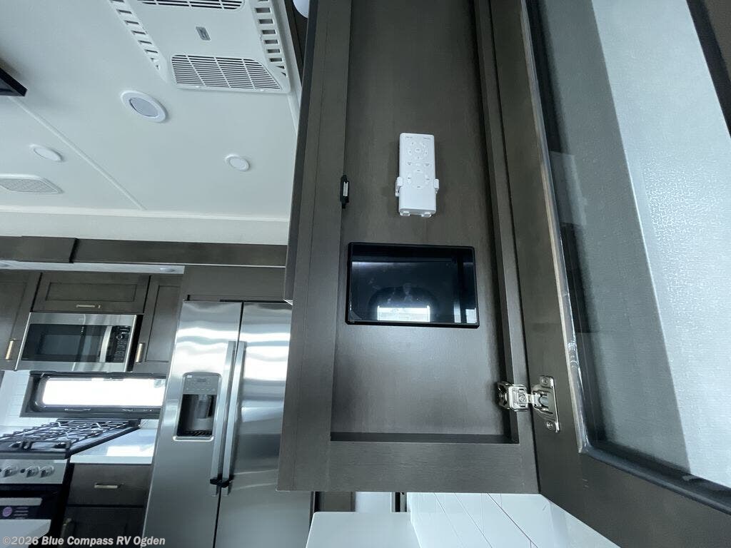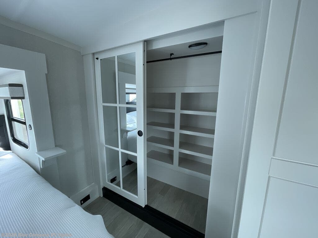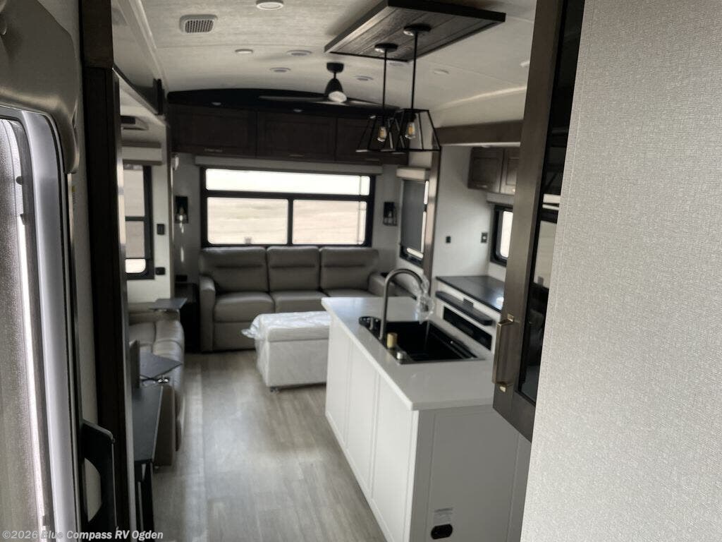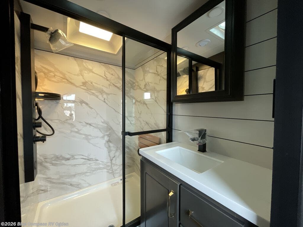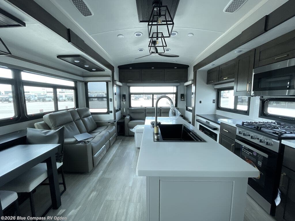 At the front of the unit, the spacious main bedroom offers a 72" x 80" king bed, providing ample room to relax and unwind. A wardrobe with drawers and a built-in hamper ensures plenty of organized storage for clothing and essentials, while a flip-up dresser across from the bed adds even more convenience. Moving down the hall, you’ll find a full bathroom featuring a large 36" x 48" shower with a built-in seat for added comfort. Toward the rear, the main living area has dual opposing slides that open up the space for maximum comfort and functionality. One slide hosts the fully equipped kitchen, complete with overhead cabinets, a convection microwave with built-in air fryer, a 24" range, and a 21-cu. ft. residential refrigerator, everything you need to cook in comfort. The central kitchen island features a residential “Do-It-All” sink with a pull-out faucet, glass rinse, vegetable rinse, and a pull-out cutting board for easy meal prep, while the corner pantry provides generous storage. Opposite the kitchen, you can relax in the theater seating or enjoy meals at the roll-out table. At the rear, a 78" hide-a-bed sofa offers additional lounging space or converts into extra-sleeping accommodations when needed.