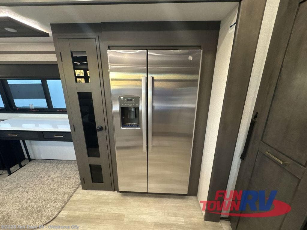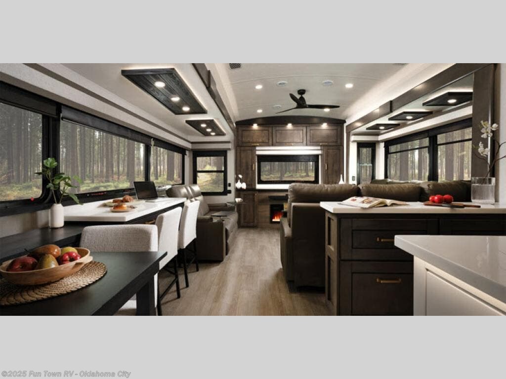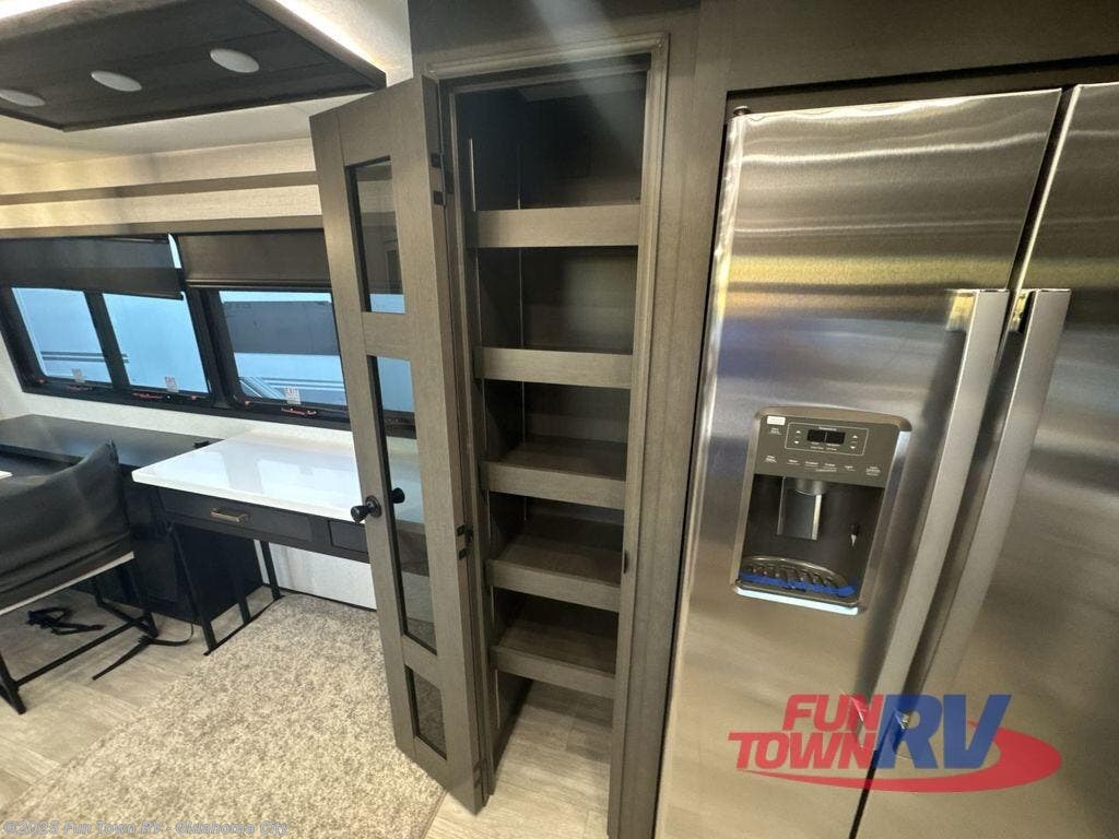 At the front of the 36RK model we have the spacious bedroom featuring a luxurious 72" x 80" king bed, providing ample room to relax and unwind after a long day. A wardrobe and dresser, complete with a TV mounted above, offer generous storage for clothing and personal essentials. Moving down the hall, the full bathroom includes a large 36" x 48" shower with a built-in seat for added comfort, as well as a linen closet for convenient storage. Toward the center and rear of the unit, the open living area expands with dual opposing slides, creating an inviting and comfortable space. One slide houses a 100" L-shaped sofa and theater seating across from the entertainment center with a cozy fireplace, perfect for relaxing evenings. The opposite slide features a pull-out table ideal for dining or game nights, alongside a versatile desk and coffee bar. This same slide also includes a 21-cu. ft. residential refrigerator and a shelved pantry for effortless organization. At the very rear, the U-shaped kitchen is designed for function and style, boasting solid-surface countertops, abundant overhead cabinets, a pull-out pantry, and a pull-out cutting board making meal prep, cooking, and snacking both easy and enjoyable.