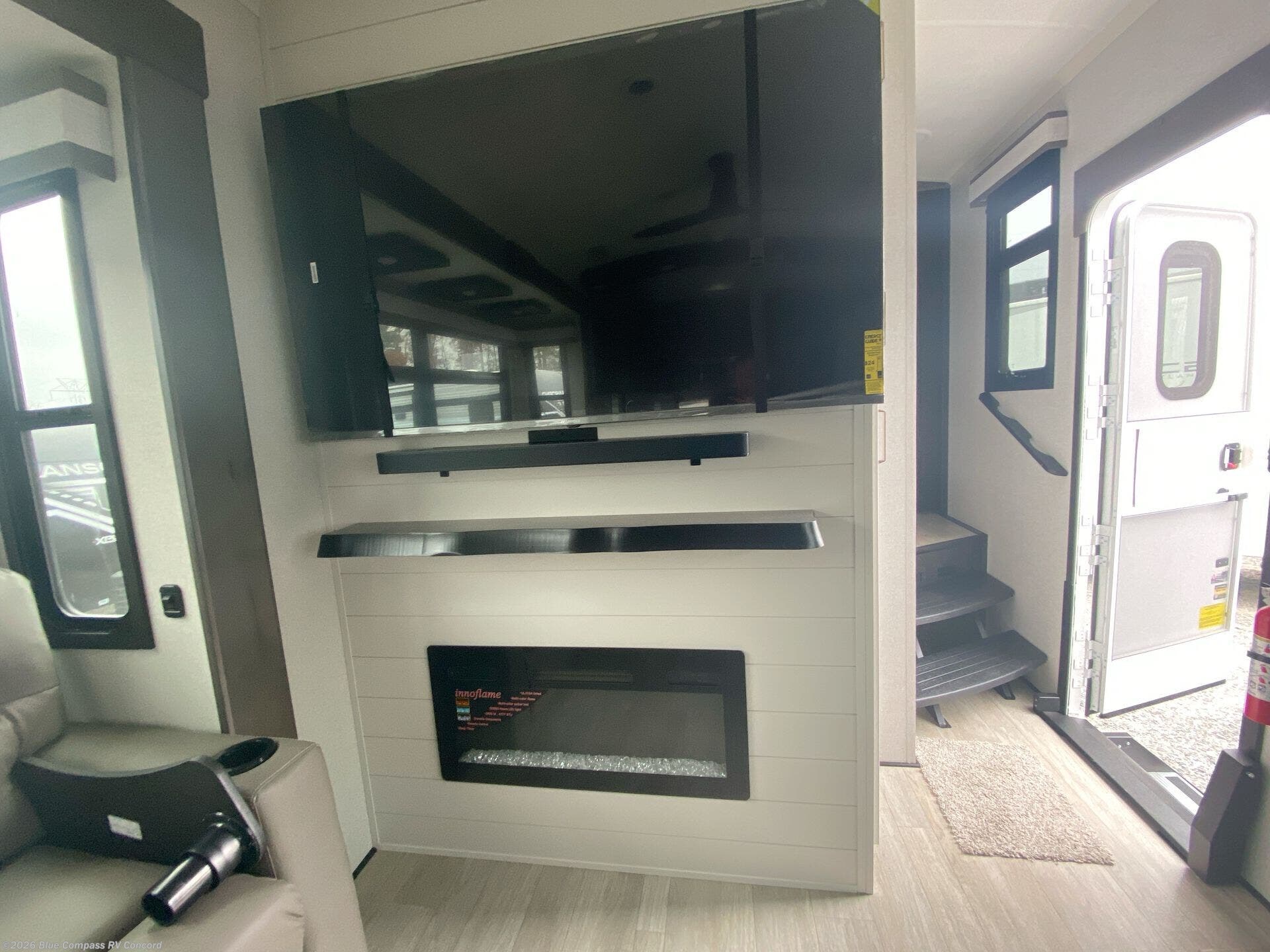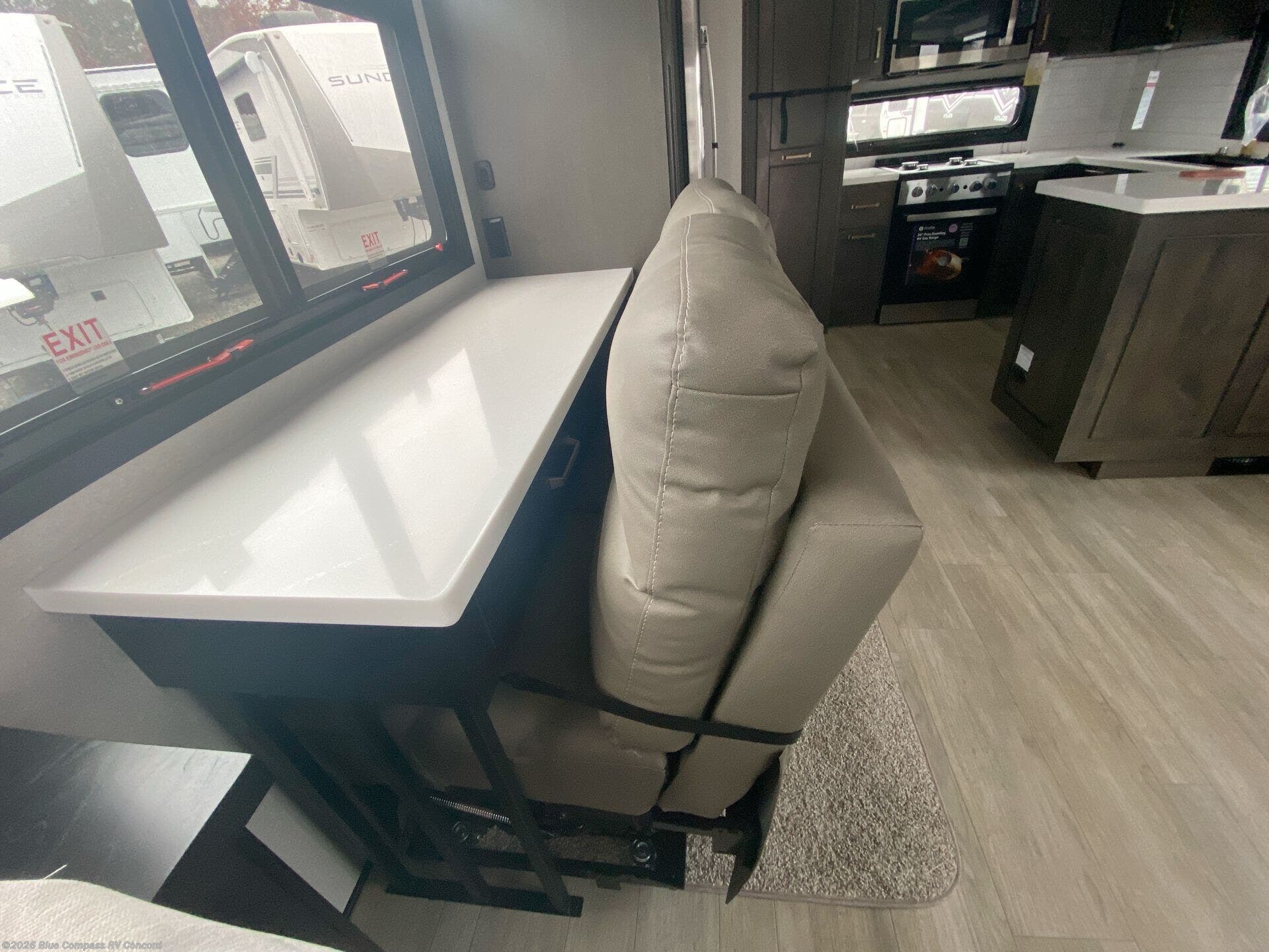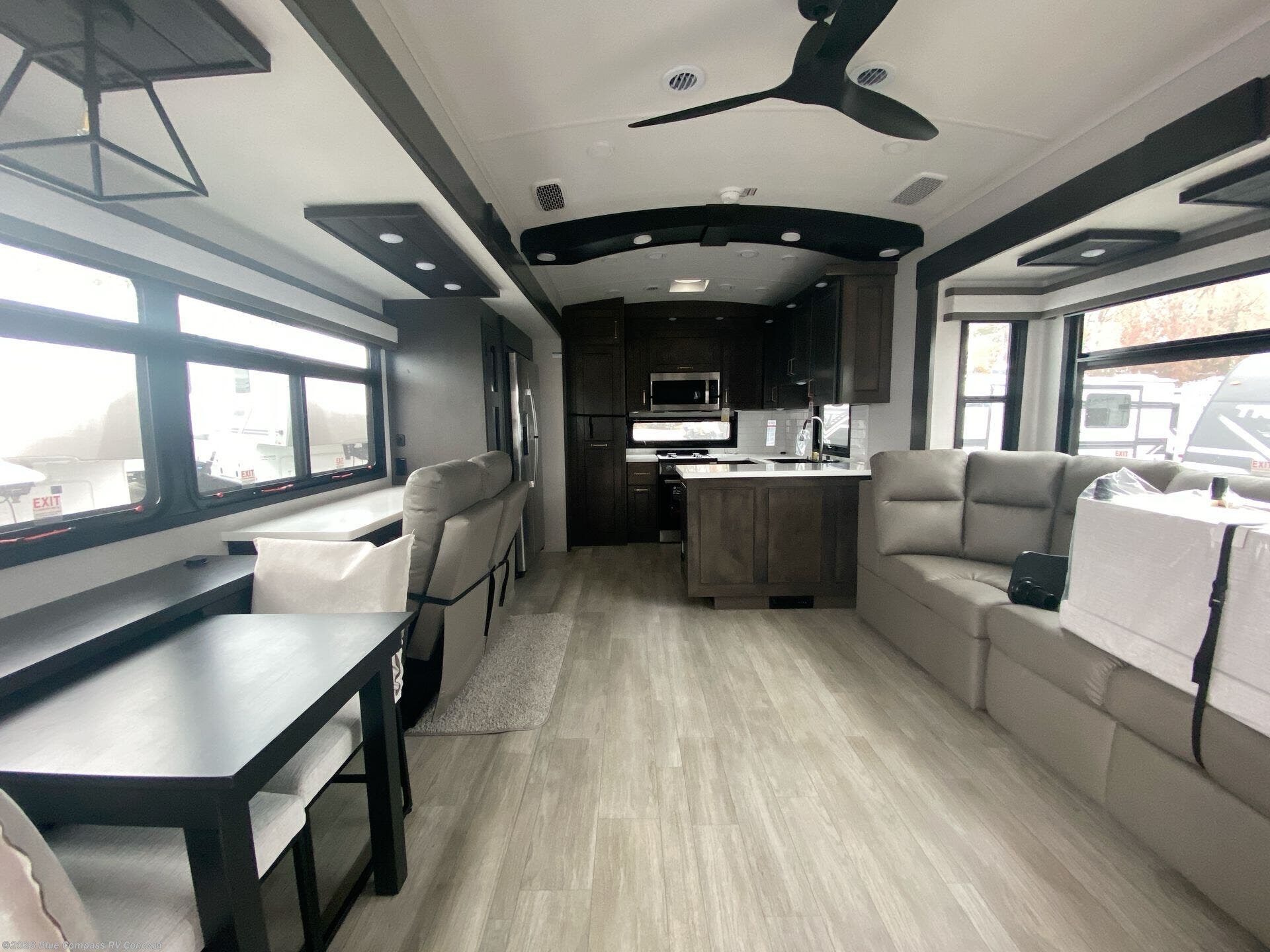 At the front of the 36RK model we have the spacious bedroom featuring a luxurious 72" x 80" king bed, providing ample room to relax and unwind after a long day. A wardrobe and dresser, complete with a TV mounted above, offer generous storage for clothing and personal essentials. Moving down the hall, the full bathroom includes a large 36" x 48" shower with a built-in seat for added comfort, as well as a linen closet for convenient storage. Toward the center and rear of the unit, the open living area expands with dual opposing slides, creating an inviting and comfortable space. One slide houses a 100" L-shaped sofa and theater seating across from the entertainment center with a cozy fireplace, perfect for relaxing evenings. The opposite slide features a pull-out table ideal for dining or game nights, alongside a versatile desk and coffee bar. This same slide also includes a 21-cu. ft. residential refrigerator and a shelved pantry for effortless organization. At the very rear, the U-shaped kitchen is designed for function and style, boasting solid-surface countertops, abundant overhead cabinets, a pull-out pantry, and a pull-out cutting board making meal prep, cooking, and snacking both easy and enjoyable.