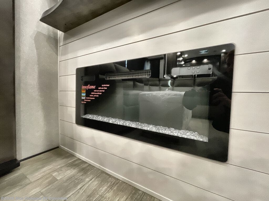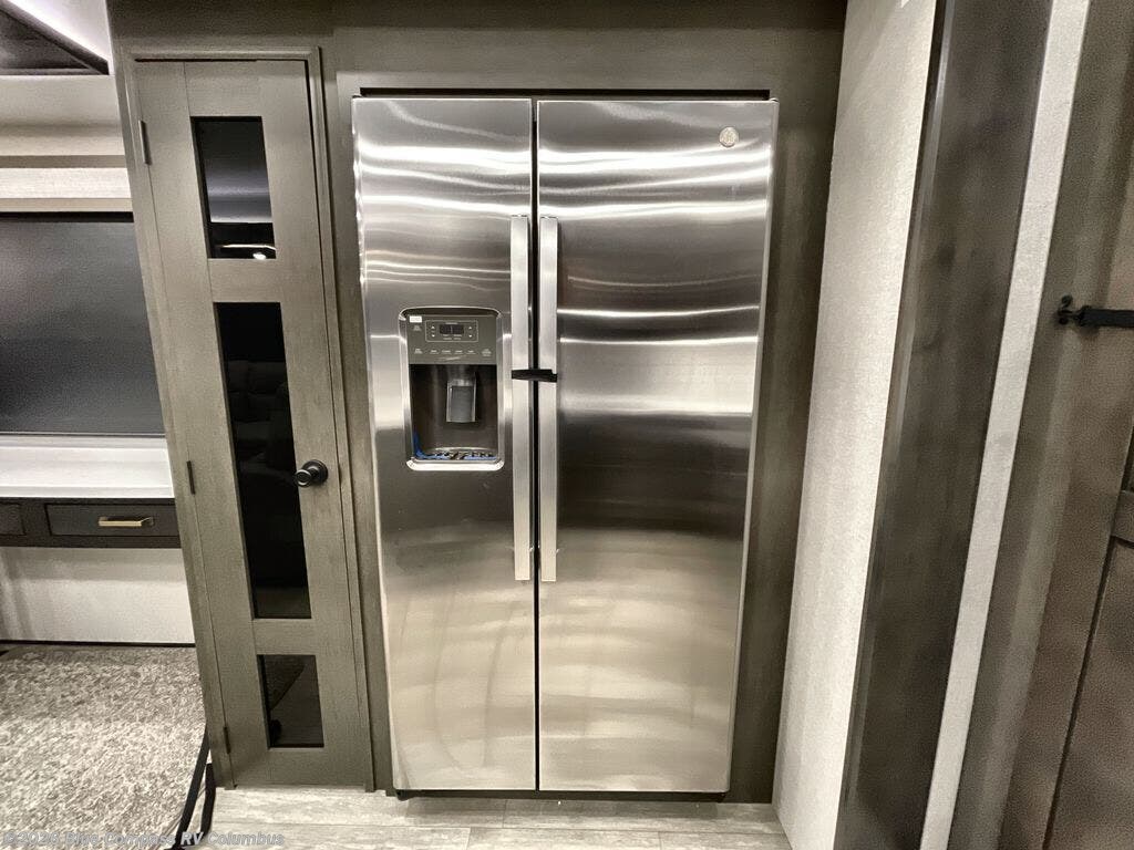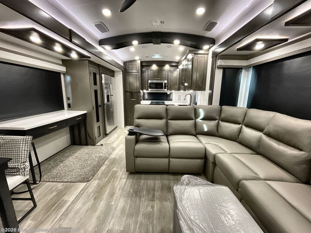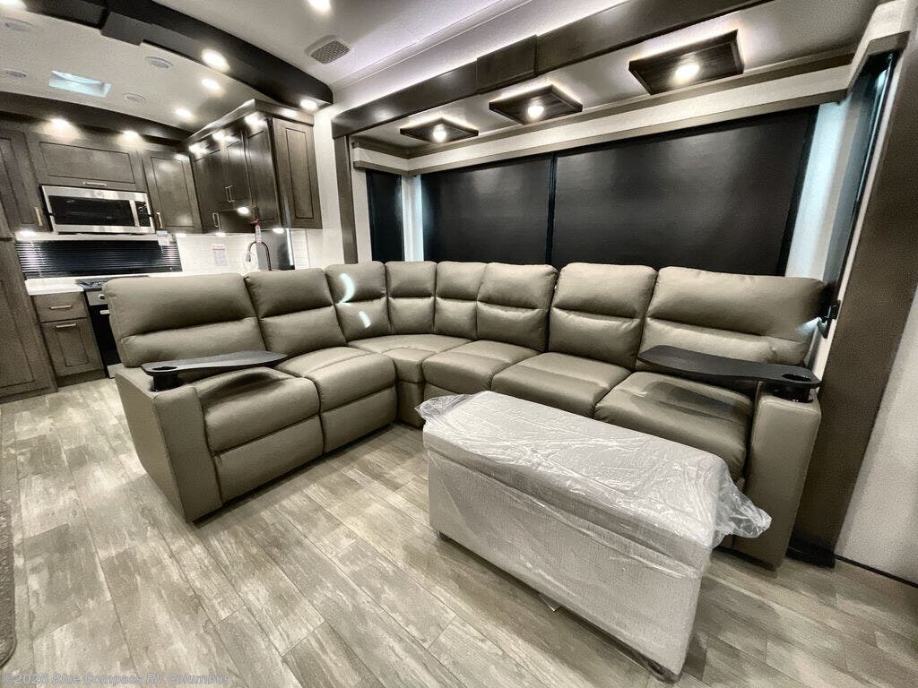 At the front of the 36RK model we have the spacious bedroom featuring a luxurious 72" x 80" king bed, providing ample room to relax and unwind after a long day. A wardrobe and dresser, complete with a TV mounted above, offer generous storage for clothing and personal essentials. Moving down the hall, the full bathroom includes a large 36" x 48" shower with a built-in seat for added comfort, as well as a linen closet for convenient storage. Toward the center and rear of the unit, the open living area expands with dual opposing slides, creating an inviting and comfortable space. One slide houses a 100" L-shaped sofa and theater seating across from the entertainment center with a cozy fireplace, perfect for relaxing evenings. The opposite slide features a pull-out table ideal for dining or game nights, alongside a versatile desk and coffee bar. This same slide also includes a 21-cu. ft. residential refrigerator and a shelved pantry for effortless organization. At the very rear, the U-shaped kitchen is designed for function and style, boasting solid-surface countertops, abundant overhead cabinets, a pull-out pantry, and a pull-out cutting board making meal prep, cooking, and snacking both easy and enjoyable.
