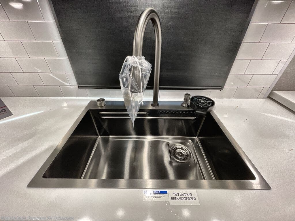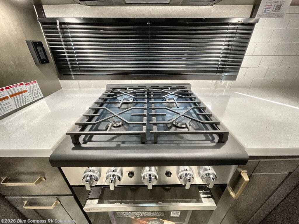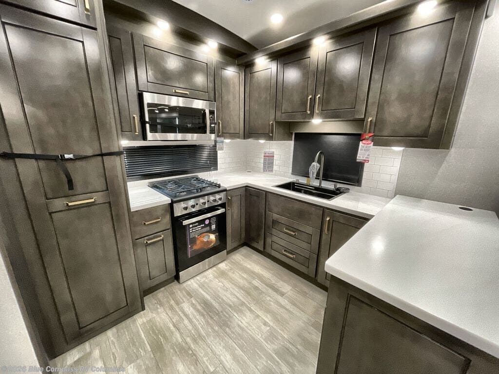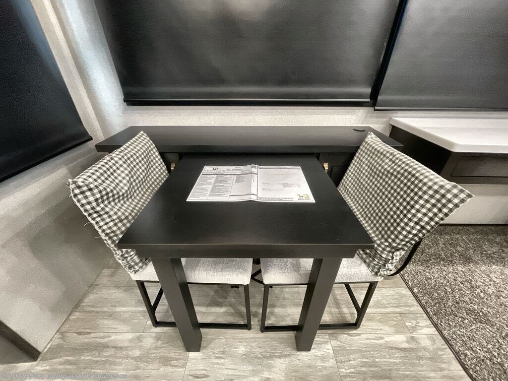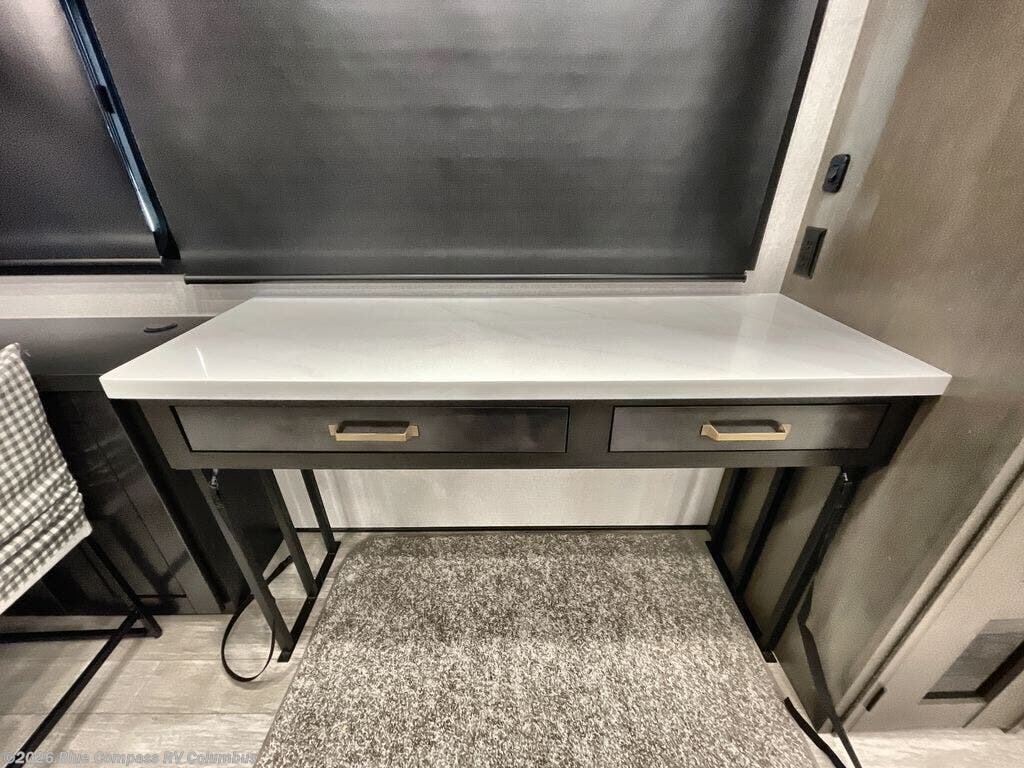 At the front of the 36RK model we have the spacious bedroom featuring a luxurious 72" x 80" king bed, providing ample room to relax and unwind after a long day. A wardrobe and dresser, complete with a TV mounted above, offer generous storage for clothing and personal essentials. Moving down the hall, the full bathroom includes a large 36" x 48" shower with a built-in seat for added comfort, as well as a linen closet for convenient storage. Toward the center and rear of the unit, the open living area expands with dual opposing slides, creating an inviting and comfortable space. One slide houses a 100" L-shaped sofa and theater seating across from the entertainment center with a cozy fireplace, perfect for relaxing evenings. The opposite slide features a pull-out table ideal for dining or game nights, alongside a versatile desk and coffee bar. This same slide also includes a 21-cu. ft. residential refrigerator and a shelved pantry for effortless organization. At the very rear, the U-shaped kitchen is designed for function and style, boasting solid-surface countertops, abundant overhead cabinets, a pull-out pantry, and a pull-out cutting board making meal prep, cooking, and snacking both easy and enjoyable.