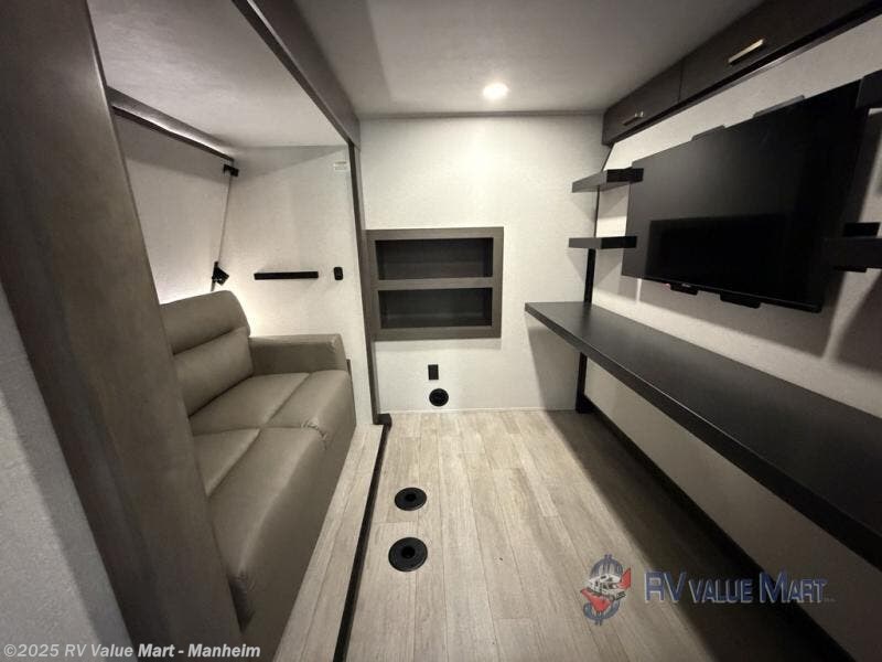 At the front of the unit, the private bedroom offers a retreat with a spacious 72" x 80" king bed, a wardrobe with drawers and a built-in hamper, and a dresser with a TV above, providing ample storage for clothing and essentials. Down the hall, the full bathroom features a 36" x 48" shower with a comfortable seat for added accessibility and relaxation. At the center of the unit, the versatile den serves perfectly as both an office and an additional sleeping area. It includes a 60" tri-fold sofa with a flip-up bunk above, a removable table for work or leisure, and across the room, a 60" x 74" Murphy bed complemented by a desk, shelves, and even a loft above, ideal for accommodating guests or creating a productive workspace on the road. Toward the rear, the open concept living area expands with dual opposing slides for a spacious and inviting atmosphere. One slide features the fully equipped kitchen with a hidden pantry, shelving for dry goods, a convection microwave with a built-in air fryer, a 21-cu. ft. refrigerator, and a 24" range. At the center, the kitchen island includes a sink and a pull-out cutting board, making meal prep both easy and enjoyable. Opposite the kitchen, you’ll find a theater seat and a roll-top dining table perfect for lounging or dining, while at the very back, a 78" sofa provides extra seating or converts into additional sleeping space when needed.