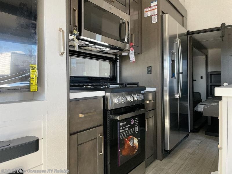At the front of the unit, the private bedroom offers a retreat with a spacious 72" x 80" king bed, a wardrobe with drawers and a built-in hamper, and a dresser with a TV above, providing ample storage for clothing and essentials. Down the hall, the full bathroom features a 36" x 48" shower with a comfortable seat for added accessibility and relaxation. At the center of the unit, the versatile den serves perfectly as both an office and an additional sleeping area. It includes a 60" tri-fold sofa with a flip-up bunk above, a removable table for work or leisure, and across the room, a 60" x 74" Murphy bed complemented by a desk, shelves, and even a loft above, ideal for accommodating guests or creating a productive workspace on the road. Toward the rear, the open concept living area expands with dual opposing slides for a spacious and inviting atmosphere. One slide features the fully equipped kitchen with a hidden pantry, shelving for dry goods, a convection microwave with a built-in air fryer, a 21-cu. ft. refrigerator, and a 24" range. At the center, the kitchen island includes a sink and a pull-out cutting board, making meal prep both easy and enjoyable. Opposite the kitchen, you’ll find a theater seat and a roll-top dining table perfect for lounging or dining, while at the very back, a 78" sofa provides extra seating or converts into additional sleeping space when needed.