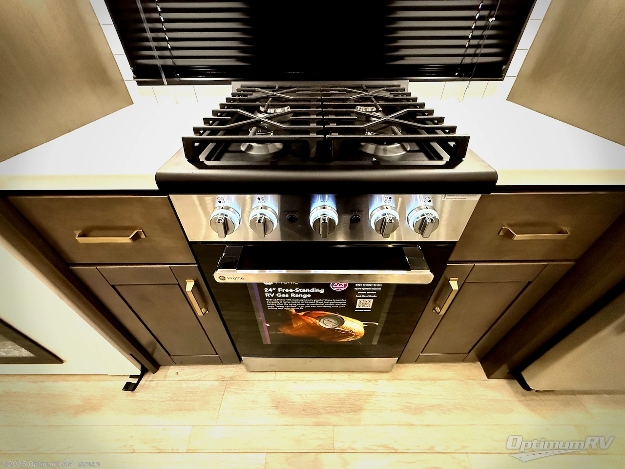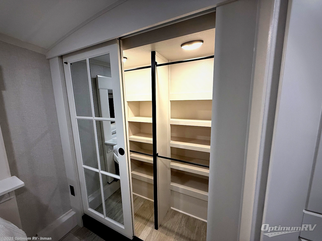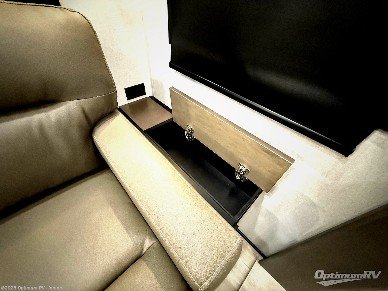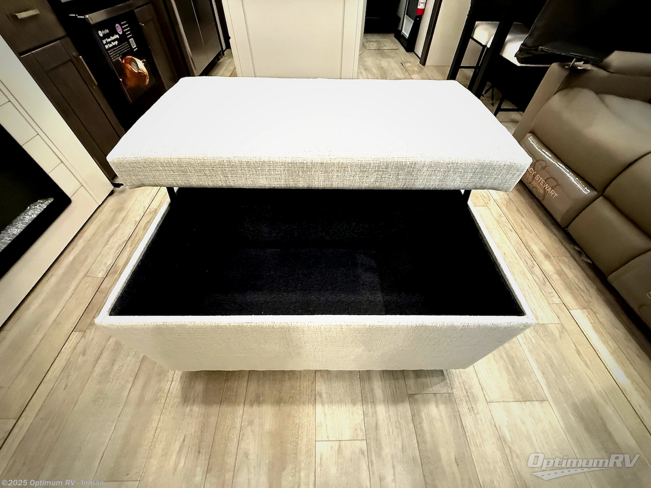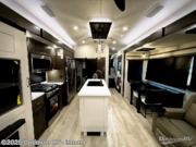 At the front of the unit, the private bedroom offers a retreat with a spacious 72" x 80" king bed, a wardrobe with drawers and a built-in hamper, and a dresser with a TV above, providing ample storage for clothing and essentials. Down the hall, the full bathroom features a 36" x 48" shower with a comfortable seat for added accessibility and relaxation. At the center of the unit, the versatile den serves perfectly as both an office and an additional sleeping area. It includes a 60" tri-fold sofa with a flip-up bunk above, a removable table for work or leisure, and across the room, a 60" x 74" Murphy bed complemented by a desk, shelves, and even a loft above, ideal for accommodating guests or creating a productive workspace on the road. Toward the rear, the open concept living area expands with dual opposing slides for a spacious and inviting atmosphere. One slide features the fully equipped kitchen with a hidden pantry, shelving for dry goods, a convection microwave with a built-in air fryer, a 21-cu. ft. refrigerator, and a 24" range. At the center, the kitchen island includes a sink and a pull-out cutting board, making meal prep both easy and enjoyable. Opposite the kitchen, you’ll find a theater seat and a roll-top dining table perfect for lounging or dining, while at the very back, a 78" sofa provides extra seating or converts into additional sleeping space when needed.