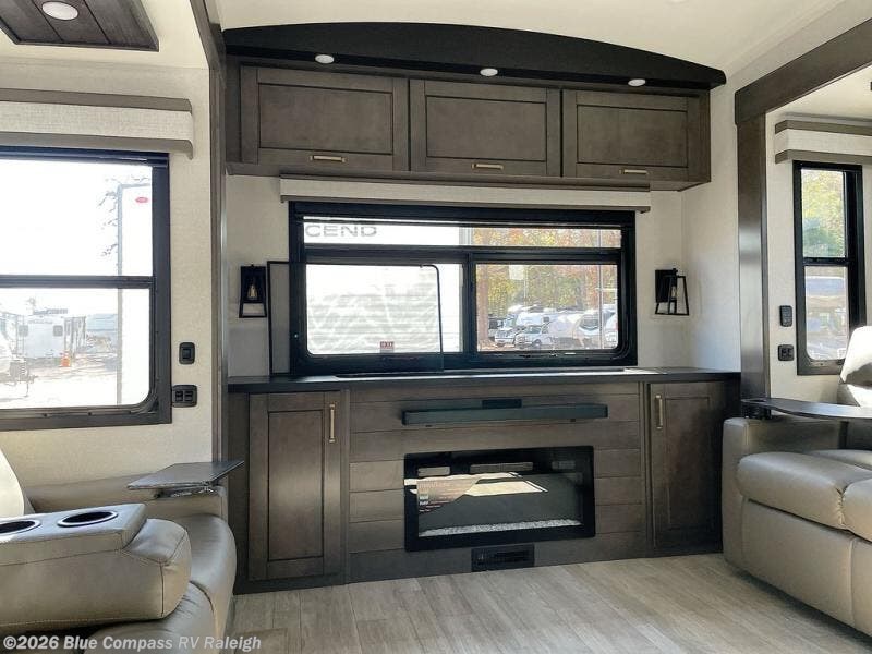 At the front of this 38RE layout, you’ll find a private bedroom featuring a spacious 72" x 80" king bed slide-out, creating a comfortable retreat to rest and recharge. The room also includes a wardrobe and dresser with a TV above, providing ample storage for clothing and essentials. Moving down the hall, the full bathroom offers both comfort and convenience with its 36" x 48" shower complete with a built-in seat for accessibility, plus linen shelves for added storage. At the heart of the unit, the kitchen is thoughtfully designed with everything needed to cook in comfort, including a pantry, a pull-out cutting board in the island, and a 21-cu. ft. refrigerator. Meal preparation is a breeze with the 24" range or the convection microwave featuring a built-in air fryer. Across from the kitchen, the large slide-out hosts a roll-out table perfect for dining or game nights, as well as a desk/coffee bar and cozy theater seating. At the rear, the entertainment center stands out with a TV lift and fireplace, while the L-shaped lounge and additional theater seat create the ultimate space to relax and enjoy movie nights in style.