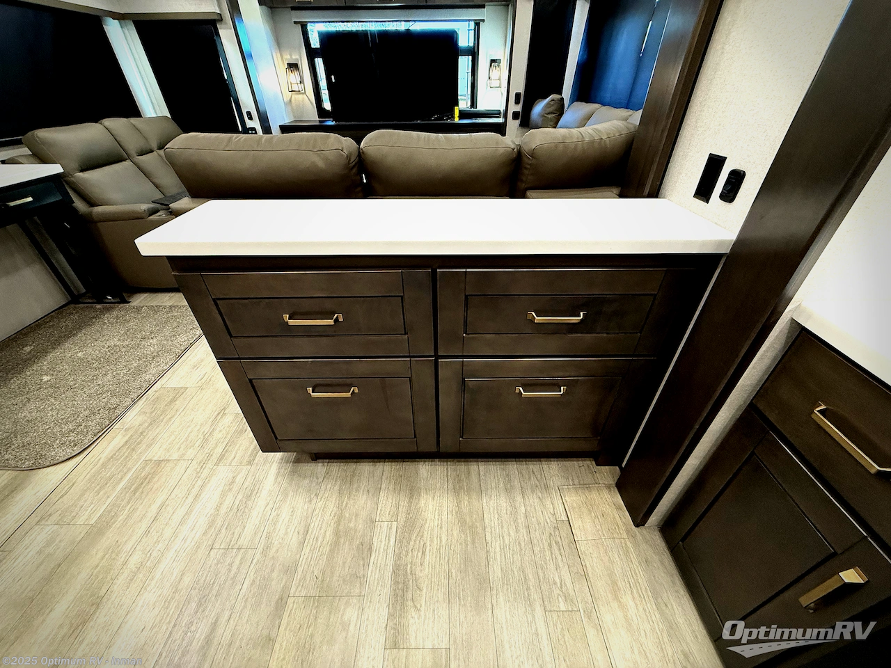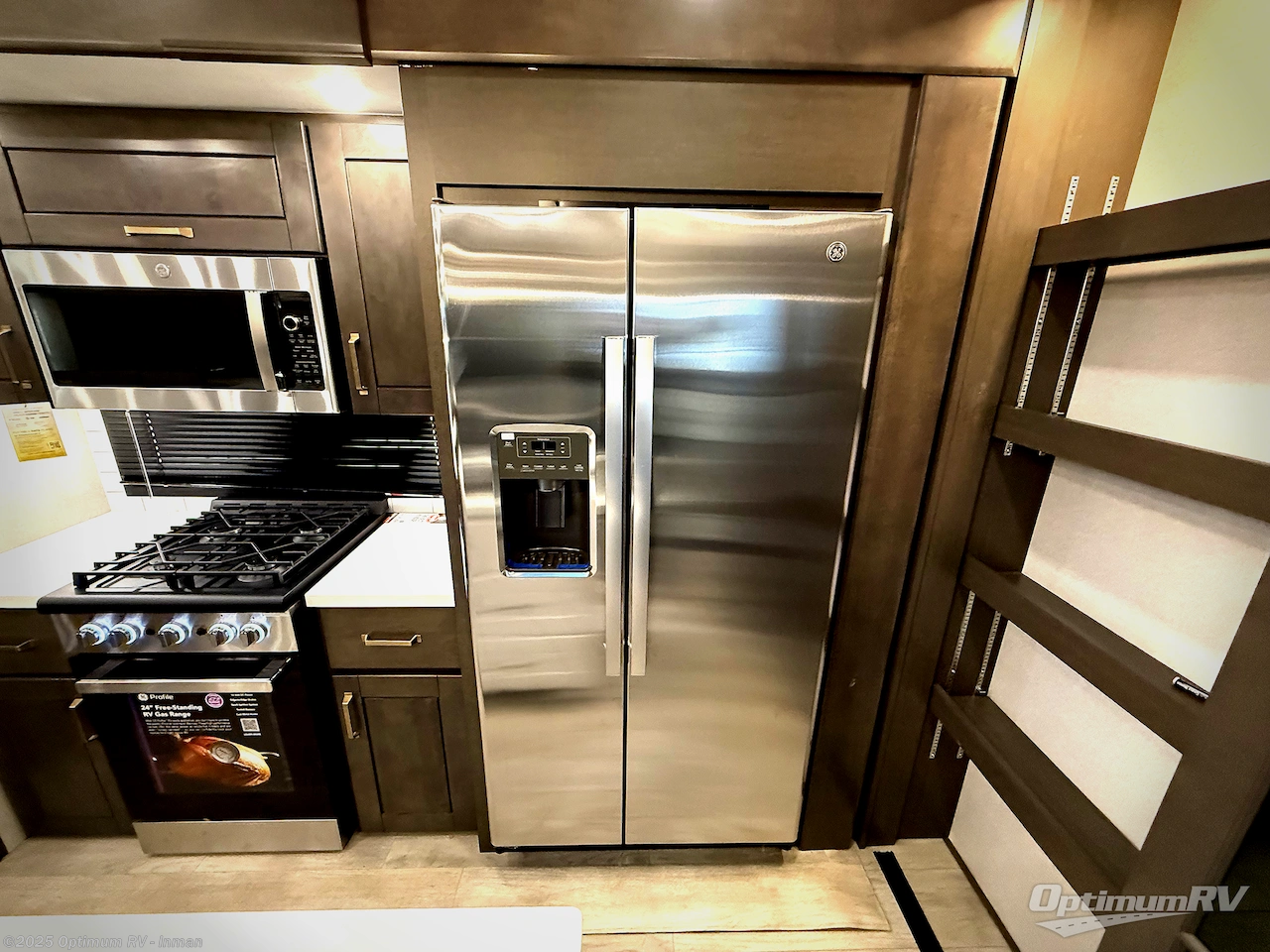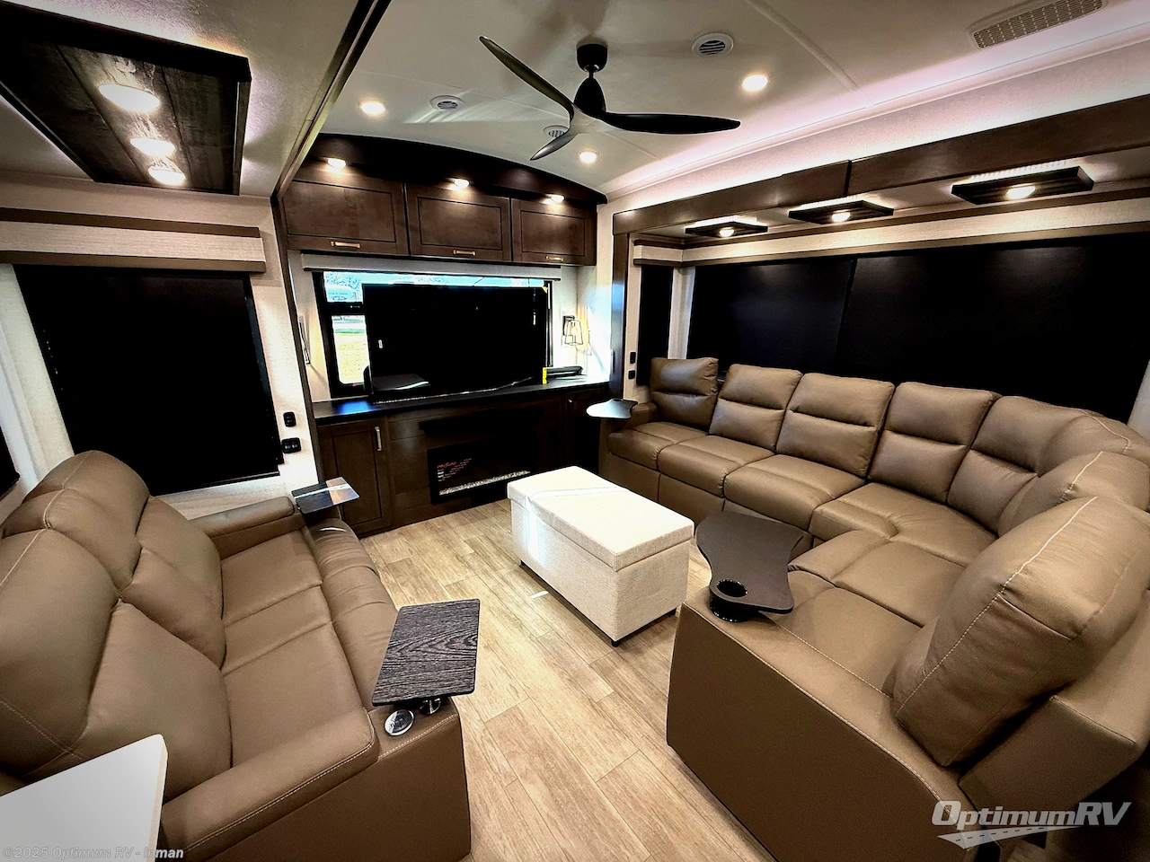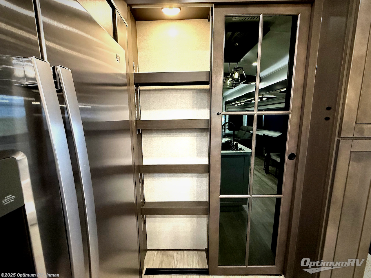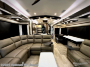 At the front of this 38RE layout, you’ll find a private bedroom featuring a spacious 72" x 80" king bed slide-out, creating a comfortable retreat to rest and recharge. The room also includes a wardrobe and dresser with a TV above, providing ample storage for clothing and essentials. Moving down the hall, the full bathroom offers both comfort and convenience with its 36" x 48" shower complete with a built-in seat for accessibility, plus linen shelves for added storage. At the heart of the unit, the kitchen is thoughtfully designed with everything needed to cook in comfort, including a pantry, a pull-out cutting board in the island, and a 21-cu. ft. refrigerator. Meal preparation is a breeze with the 24" range or the convection microwave featuring a built-in air fryer. Across from the kitchen, the large slide-out hosts a roll-out table perfect for dining or game nights, as well as a desk/coffee bar and cozy theater seating. At the rear, the entertainment center stands out with a TV lift and fireplace, while the L-shaped lounge and additional theater seat create the ultimate space to relax and enjoy movie nights in style.