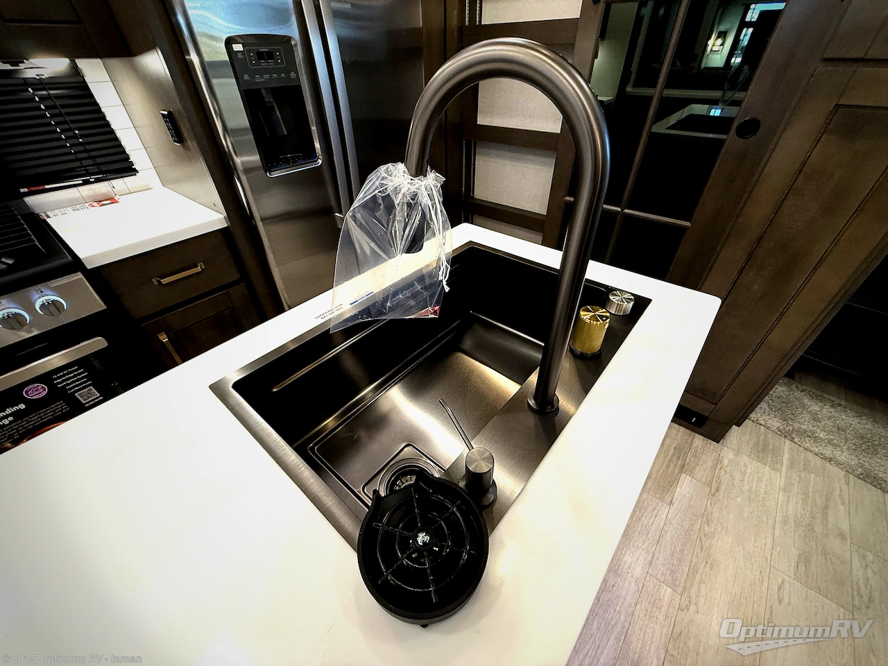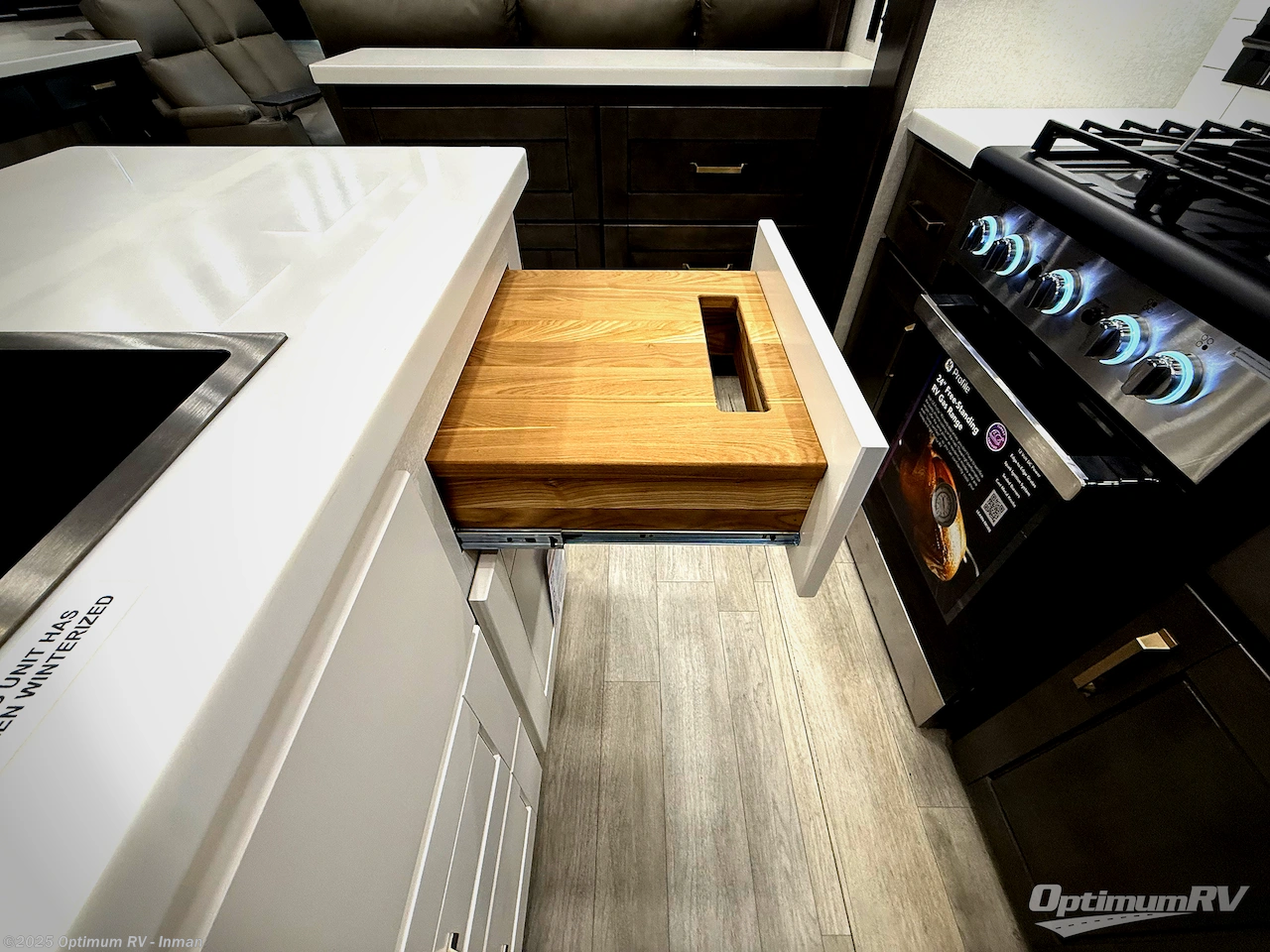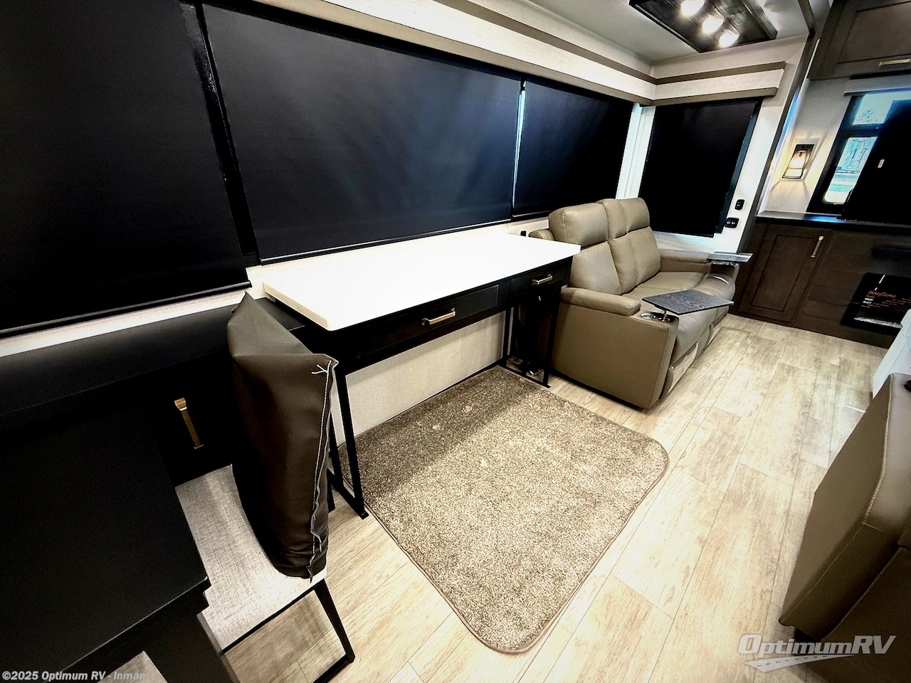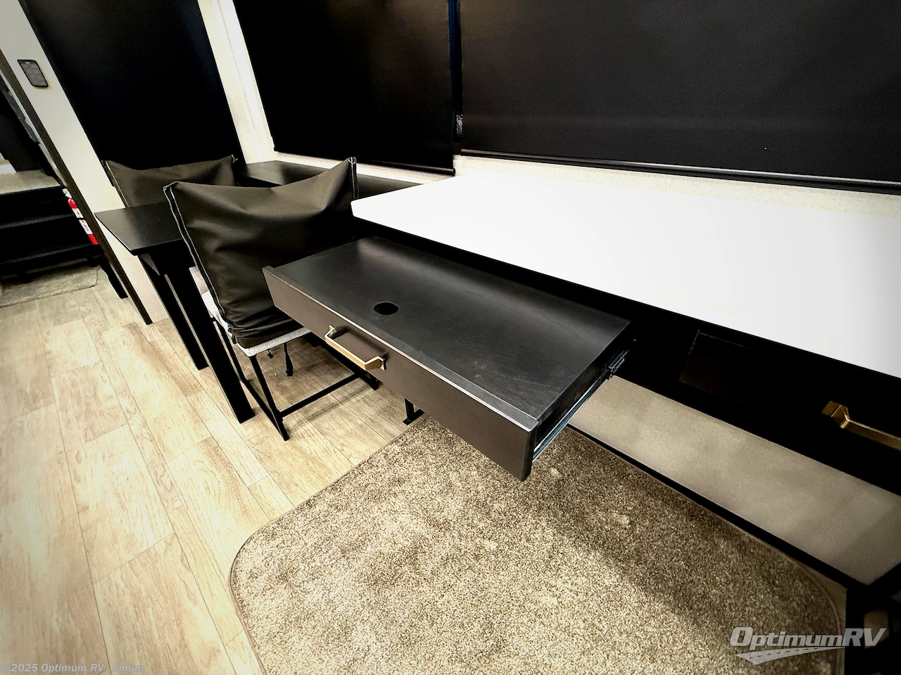At the front of this 38RE layout, you’ll find a private bedroom featuring a spacious 72" x 80" king bed slide-out, creating a comfortable retreat to rest and recharge. The room also includes a wardrobe and dresser with a TV above, providing ample storage for clothing and essentials. Moving down the hall, the full bathroom offers both comfort and convenience with its 36" x 48" shower complete with a built-in seat for accessibility, plus linen shelves for added storage. At the heart of the unit, the kitchen is thoughtfully designed with everything needed to cook in comfort, including a pantry, a pull-out cutting board in the island, and a 21-cu. ft. refrigerator. Meal preparation is a breeze with the 24" range or the convection microwave featuring a built-in air fryer. Across from the kitchen, the large slide-out hosts a roll-out table perfect for dining or game nights, as well as a desk/coffee bar and cozy theater seating. At the rear, the entertainment center stands out with a TV lift and fireplace, while the L-shaped lounge and additional theater seat create the ultimate space to relax and enjoy movie nights in style.