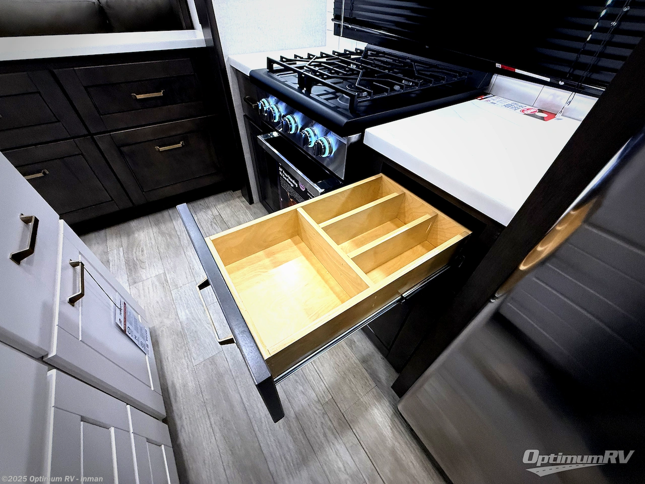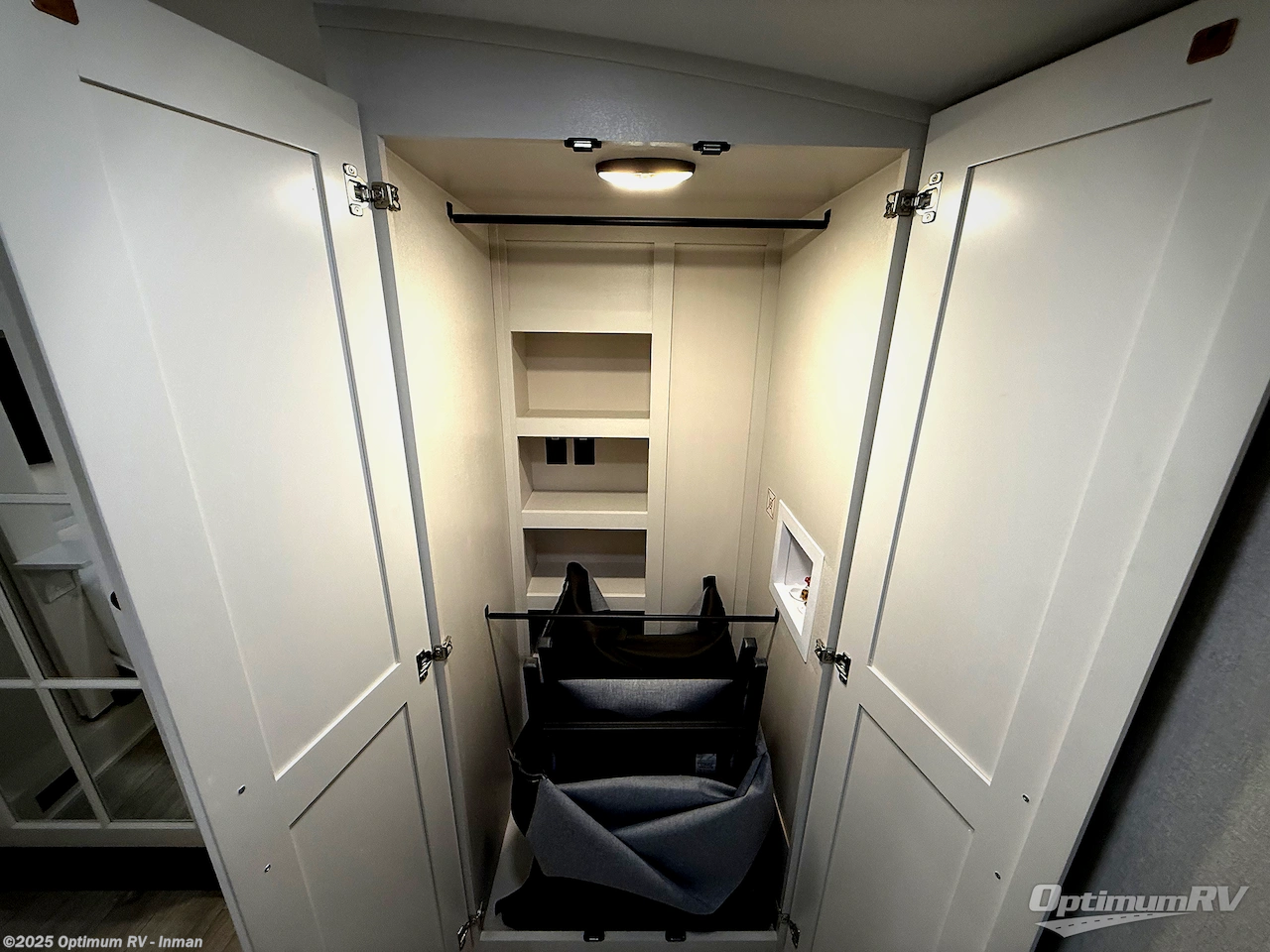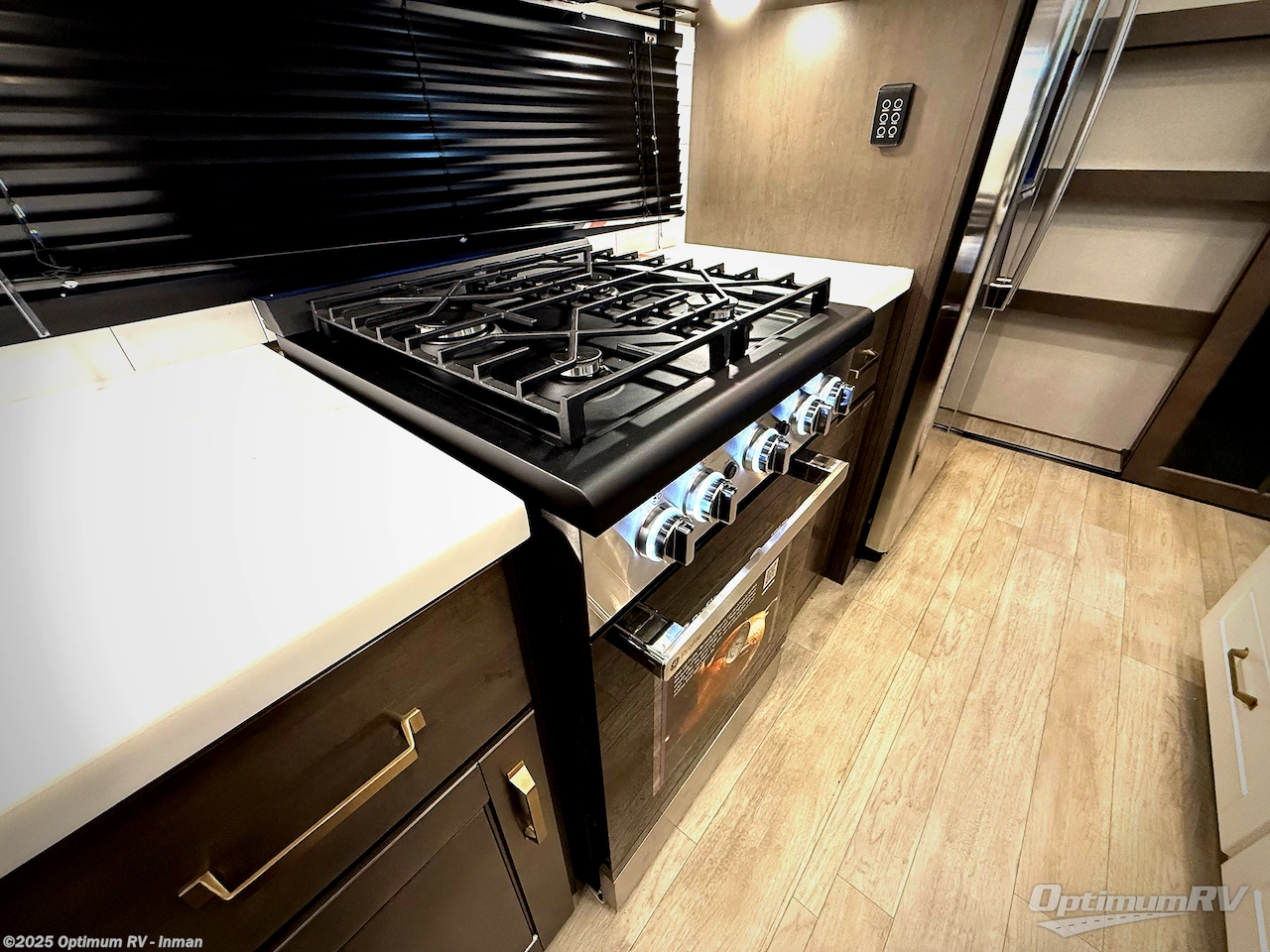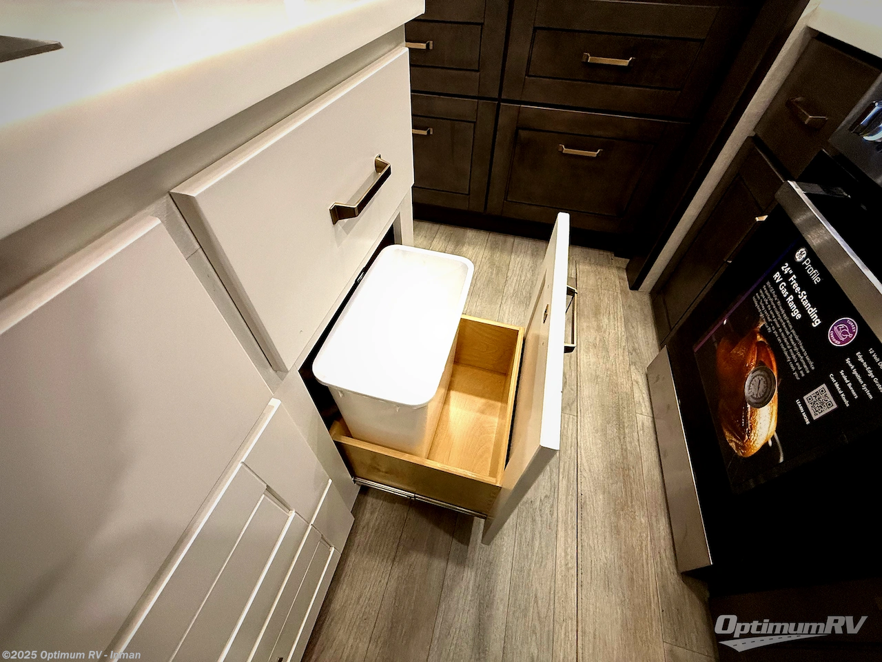 At the front of this 38RE layout, you’ll find a private bedroom featuring a spacious 72" x 80" king bed slide-out, creating a comfortable retreat to rest and recharge. The room also includes a wardrobe and dresser with a TV above, providing ample storage for clothing and essentials. Moving down the hall, the full bathroom offers both comfort and convenience with its 36" x 48" shower complete with a built-in seat for accessibility, plus linen shelves for added storage. At the heart of the unit, the kitchen is thoughtfully designed with everything needed to cook in comfort, including a pantry, a pull-out cutting board in the island, and a 21-cu. ft. refrigerator. Meal preparation is a breeze with the 24" range or the convection microwave featuring a built-in air fryer. Across from the kitchen, the large slide-out hosts a roll-out table perfect for dining or game nights, as well as a desk/coffee bar and cozy theater seating. At the rear, the entertainment center stands out with a TV lift and fireplace, while the L-shaped lounge and additional theater seat create the ultimate space to relax and enjoy movie nights in style.