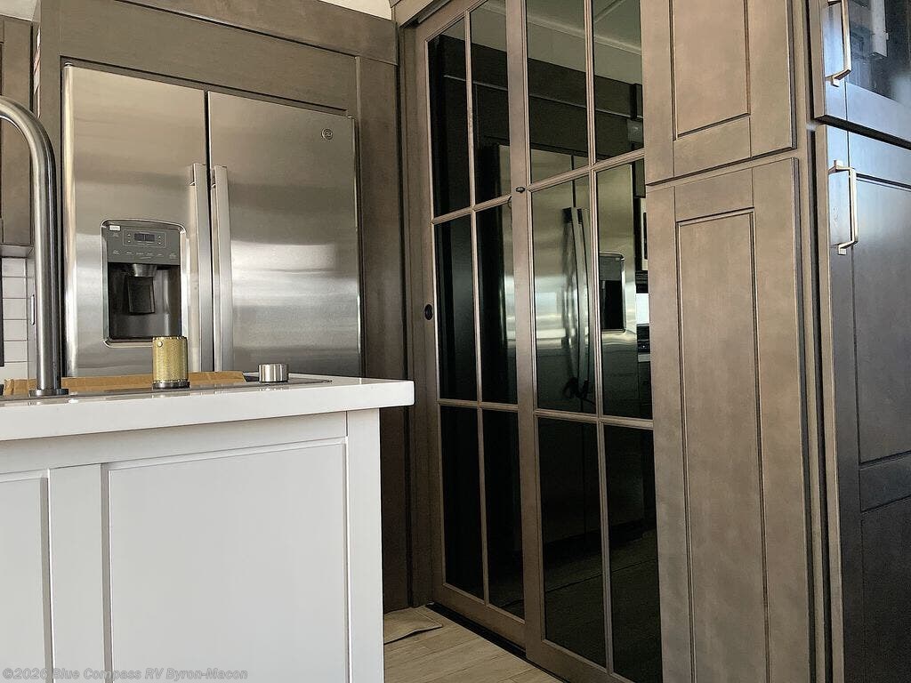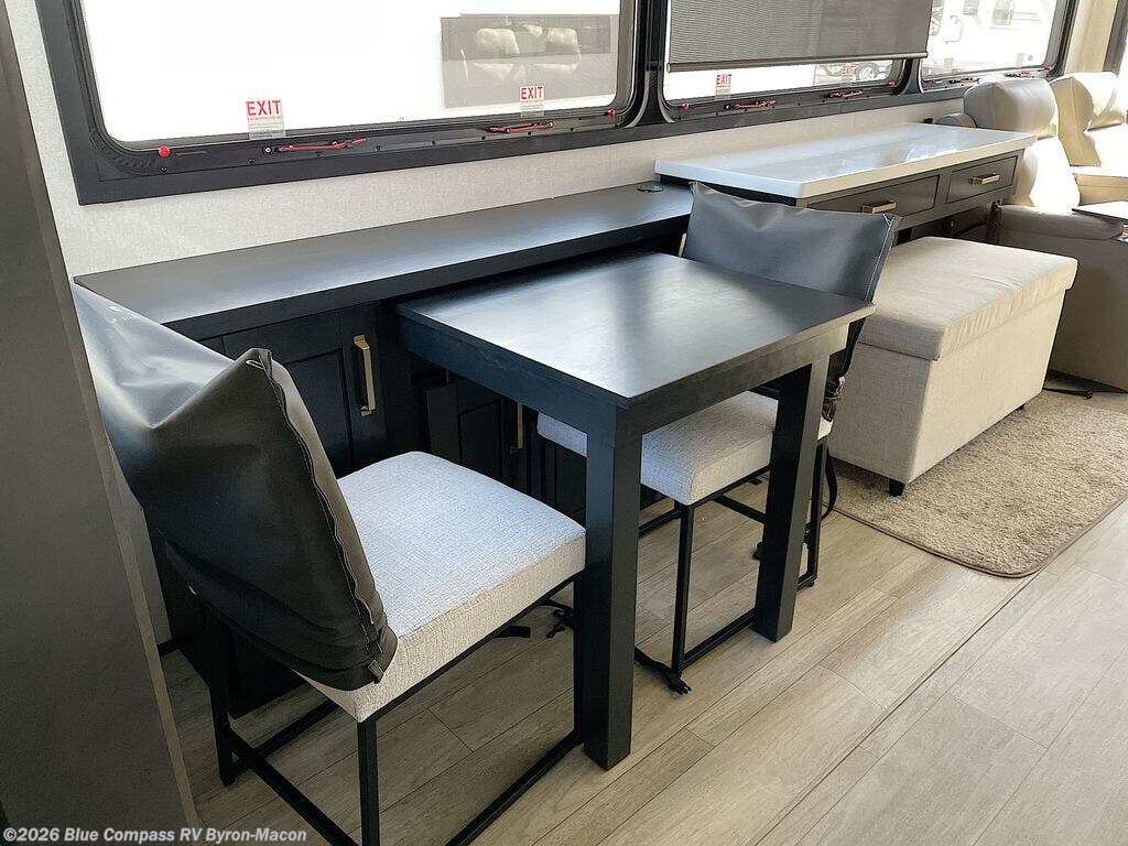 At the front of this 38RE layout, you’ll find a private bedroom featuring a spacious 72" x 80" king bed slide-out, creating a comfortable retreat to rest and recharge. The room also includes a wardrobe and dresser with a TV above, providing ample storage for clothing and essentials. Moving down the hall, the full bathroom offers both comfort and convenience with its 36" x 48" shower complete with a built-in seat for accessibility, plus linen shelves for added storage. At the heart of the unit, the kitchen is thoughtfully designed with everything needed to cook in comfort, including a pantry, a pull-out cutting board in the island, and a 21-cu. ft. refrigerator. Meal preparation is a breeze with the 24" range or the convection microwave featuring a built-in air fryer. Across from the kitchen, the large slide-out hosts a roll-out table perfect for dining or game nights, as well as a desk/coffee bar and cozy theater seating. At the rear, the entertainment center stands out with a TV lift and fireplace, while the L-shaped lounge and additional theater seat create the ultimate space to relax and enjoy movie nights in style.