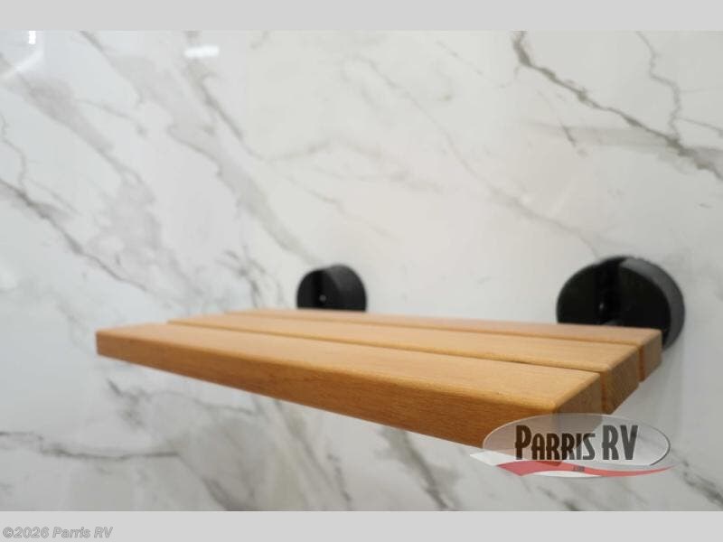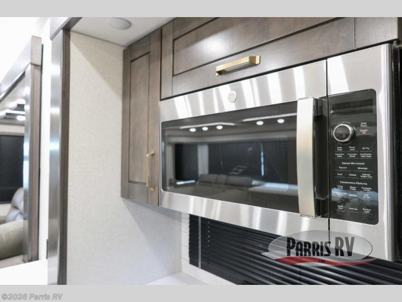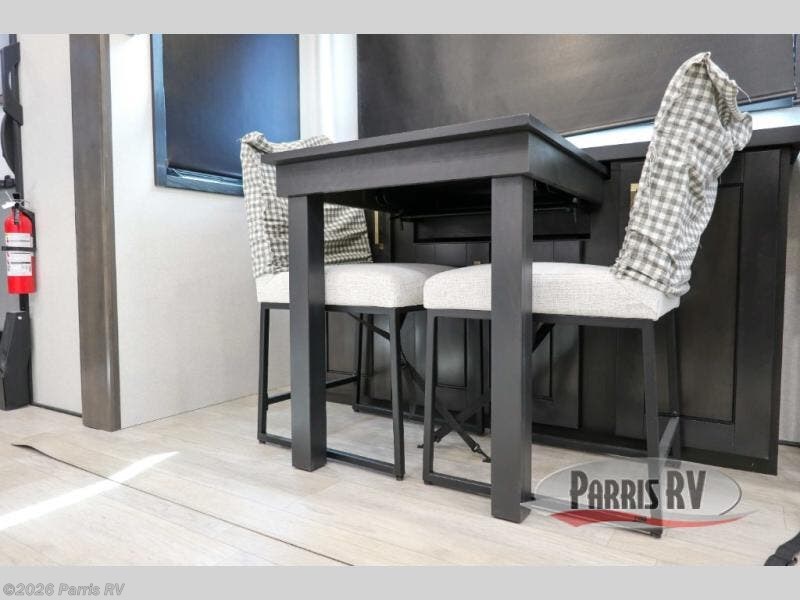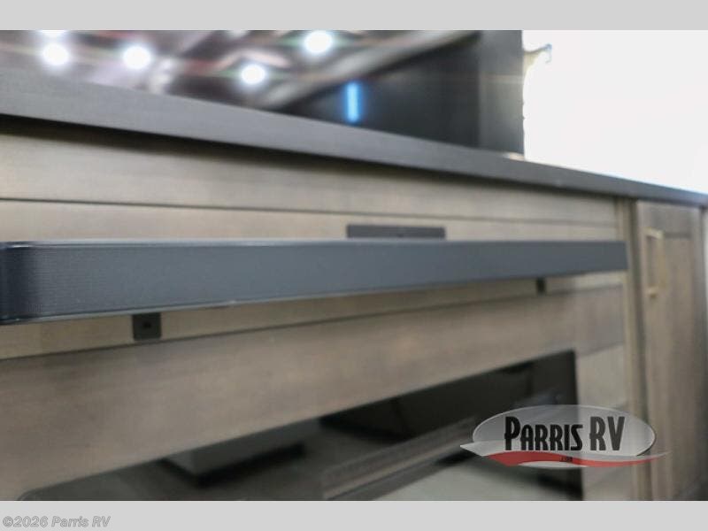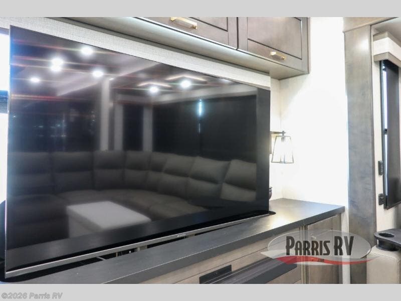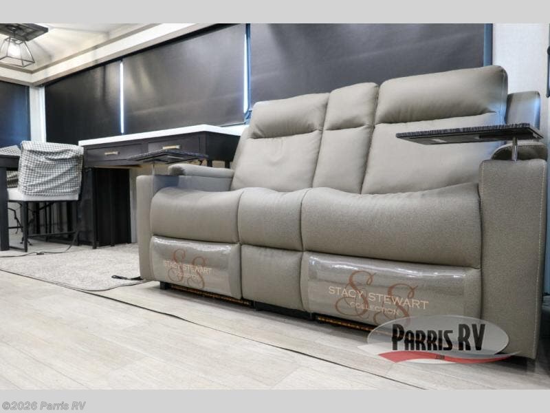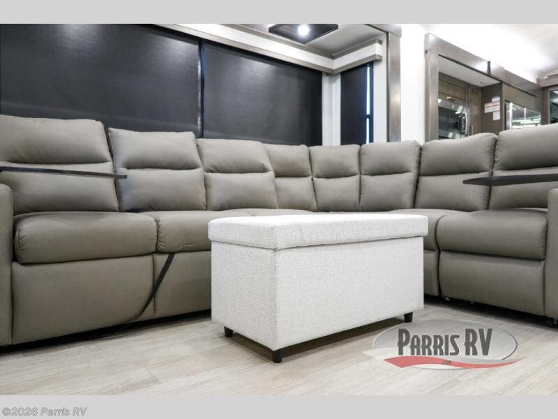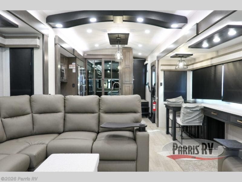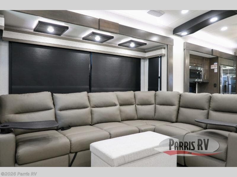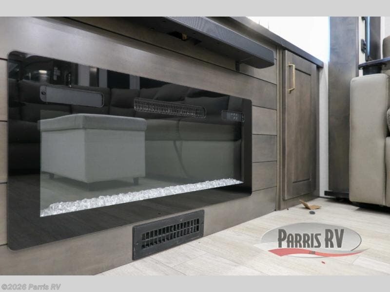 At the front of this 38RE layout, you’ll find a private bedroom featuring a spacious 72" x 80" king bed slide-out, creating a comfortable retreat to rest and recharge. The room also includes a wardrobe and dresser with a TV above, providing ample storage for clothing and essentials. Moving down the hall, the full bathroom offers both comfort and convenience with its 36" x 48" shower complete with a built-in seat for accessibility, plus linen shelves for added storage. At the heart of the unit, the kitchen is thoughtfully designed with everything needed to cook in comfort, including a pantry, a pull-out cutting board in the island, and a 21-cu. ft. refrigerator. Meal preparation is a breeze with the 24" range or the convection microwave featuring a built-in air fryer. Across from the kitchen, the large slide-out hosts a roll-out table perfect for dining or game nights, as well as a desk/coffee bar and cozy theater seating. At the rear, the entertainment center stands out with a TV lift and fireplace, while the L-shaped lounge and additional theater seat create the ultimate space to relax and enjoy movie nights in style.
