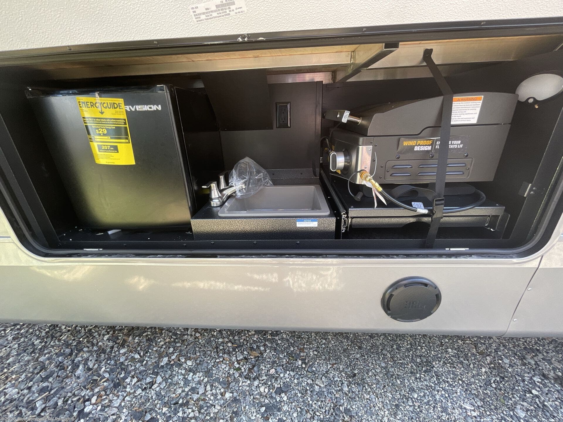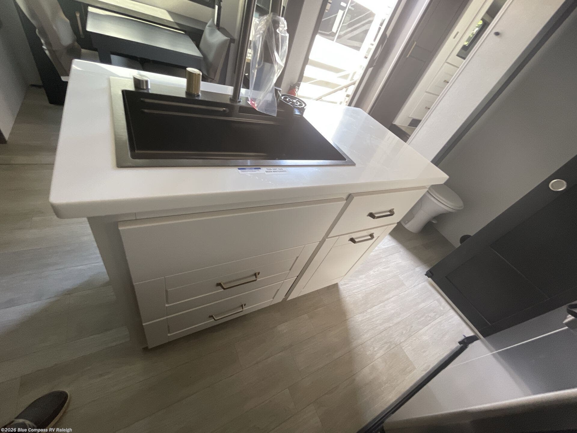 At the front of this 39FL fifth wheel, you’ll find a spacious front living area perfect for movie nights and relaxation. The dual opposing slides each feature an 82" sofa, providing both ample floor space and generous seating, while a theater seat at the very front offers even more comfort. Across the room, the entertainment center includes a cozy fireplace and convenient storage for board games. Moving to the center, the kitchen continues the open layout with its own dual opposing slides. One slide houses a 21-cu. ft. refrigerator, plenty of overhead cabinets, a 24" range, and a 30" convection microwave with a built-in air fryer, everything the on-the-road chef could need. The central kitchen island includes a sink and pull-out cutting board, while the opposite slide provides a dining table and chairs for enjoying meals together. A half bath and a pantry are also conveniently located here for added comfort. At the rear, the bedroom features a king-size 72" x 80" bed on the fifth slide, ensuring a restful night’s sleep. Across from the bed, a bench sits between two wardrobes, offering ample storage for clothing and essentials. Completing the layout, the full rear bathroom includes dual sinks set in an L-shaped counter, a spacious 36" x 48" shower with a seat for accessibility, and all the touches needed for comfort and ease on the road.