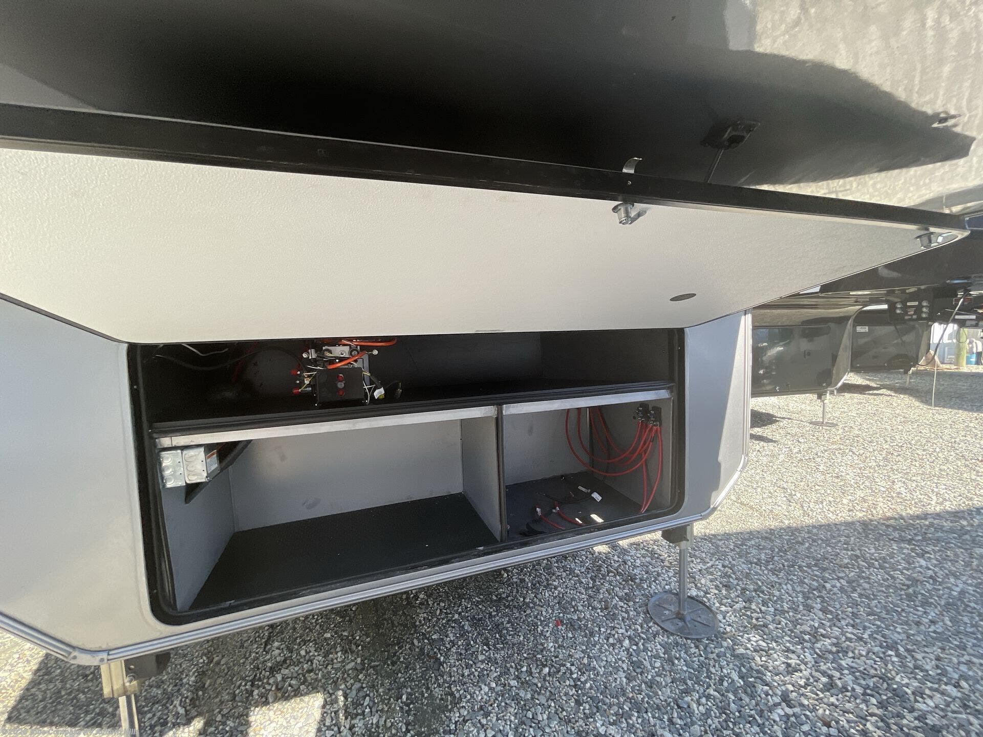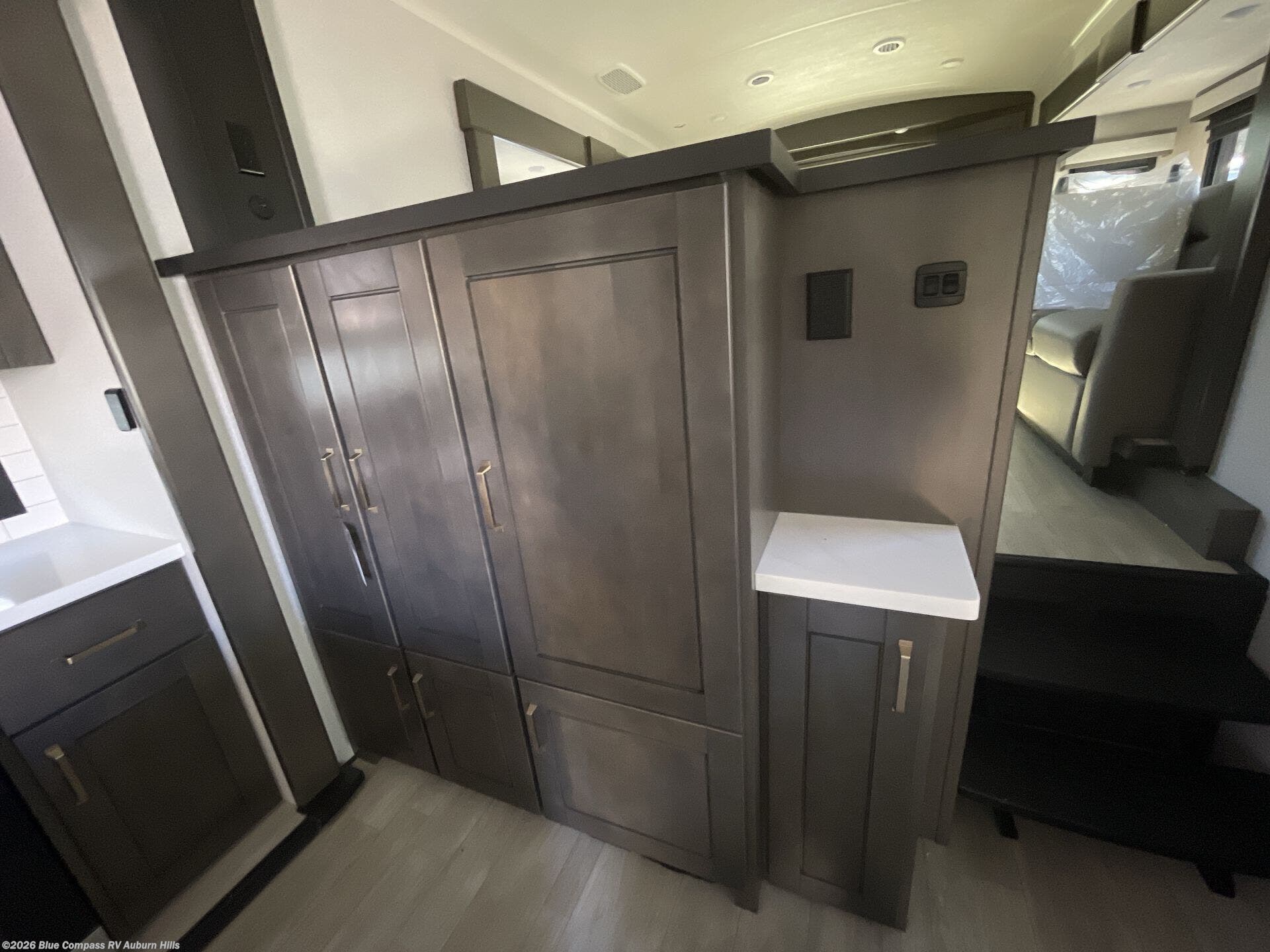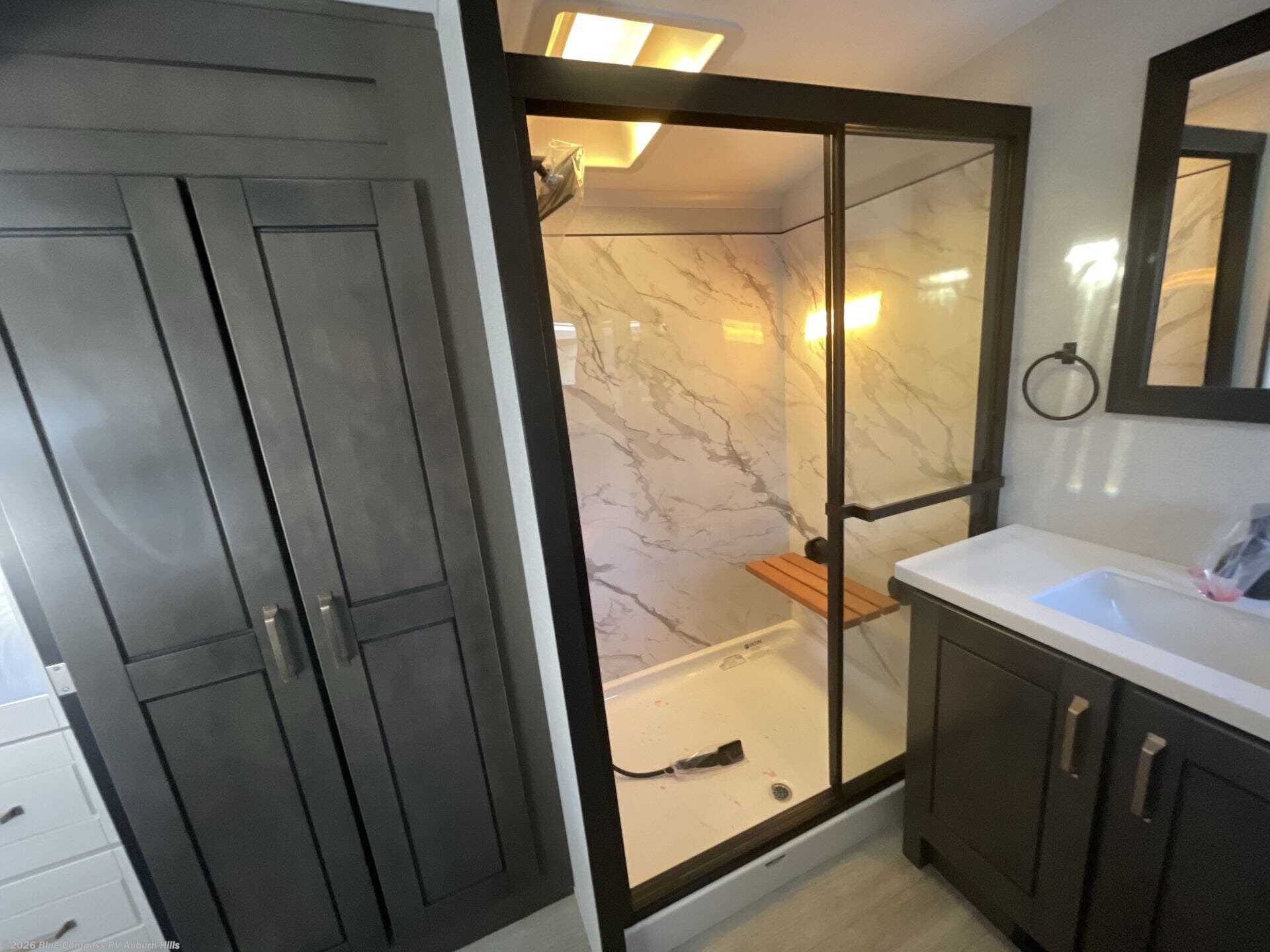 At the front of this 39FL fifth wheel, you’ll find a spacious front living area perfect for movie nights and relaxation. The dual opposing slides each feature an 82" sofa, providing both ample floor space and generous seating, while a theater seat at the very front offers even more comfort. Across the room, the entertainment center includes a cozy fireplace and convenient storage for board games. Moving to the center, the kitchen continues the open layout with its own dual opposing slides. One slide houses a 21-cu. ft. refrigerator, plenty of overhead cabinets, a 24" range, and a 30" convection microwave with a built-in air fryer, everything the on-the-road chef could need. The central kitchen island includes a sink and pull-out cutting board, while the opposite slide provides a dining table and chairs for enjoying meals together. A half bath and a pantry are also conveniently located here for added comfort. At the rear, the bedroom features a king-size 72" x 80" bed on the fifth slide, ensuring a restful night’s sleep. Across from the bed, a bench sits between two wardrobes, offering ample storage for clothing and essentials. Completing the layout, the full rear bathroom includes dual sinks set in an L-shaped counter, a spacious 36" x 48" shower with a seat for accessibility, and all the touches needed for comfort and ease on the road.
