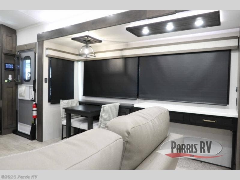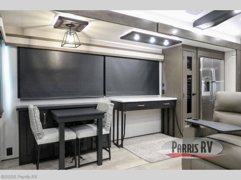 Starting from the back, this impressive 39RK features a rear kitchen designed in a convenient U-shape for easy accessibility and efficient meal prep. The kitchen is fully equipped with plenty of overhead cabinets, a convection microwave with an air fryer, a 24" range, and a pull-out pantry, perfect for the chef on the trip to cook in comfort. Across the kitchen, the large slide-out houses a 21-cu. ft. refrigerator and a second pantry with shelves, providing even more space to store groceries, snacks, and coffee essentials. The nearby desk/coffee bar and roll-out table create an inviting area to enjoy meals or unwind with a cup of coffee. The living area offers a spacious 100" L-shaped sofa and a theater seat facing the TV and fireplace, making it an ideal spot for relaxing or hosting movie nights. Moving forward, you’ll find a convenient half bathroom with linen shelves for added storage and accessibility. At the front, the private bedroom features a 72" x 80" king bed in a slide-out with a dresser across for ample storage. Finally, the full bathroom at the very front includes a 30" x 61" shower with a seat for comfort, a large sink, and a walk-in closet that provides generous space for all your clothing and gear.