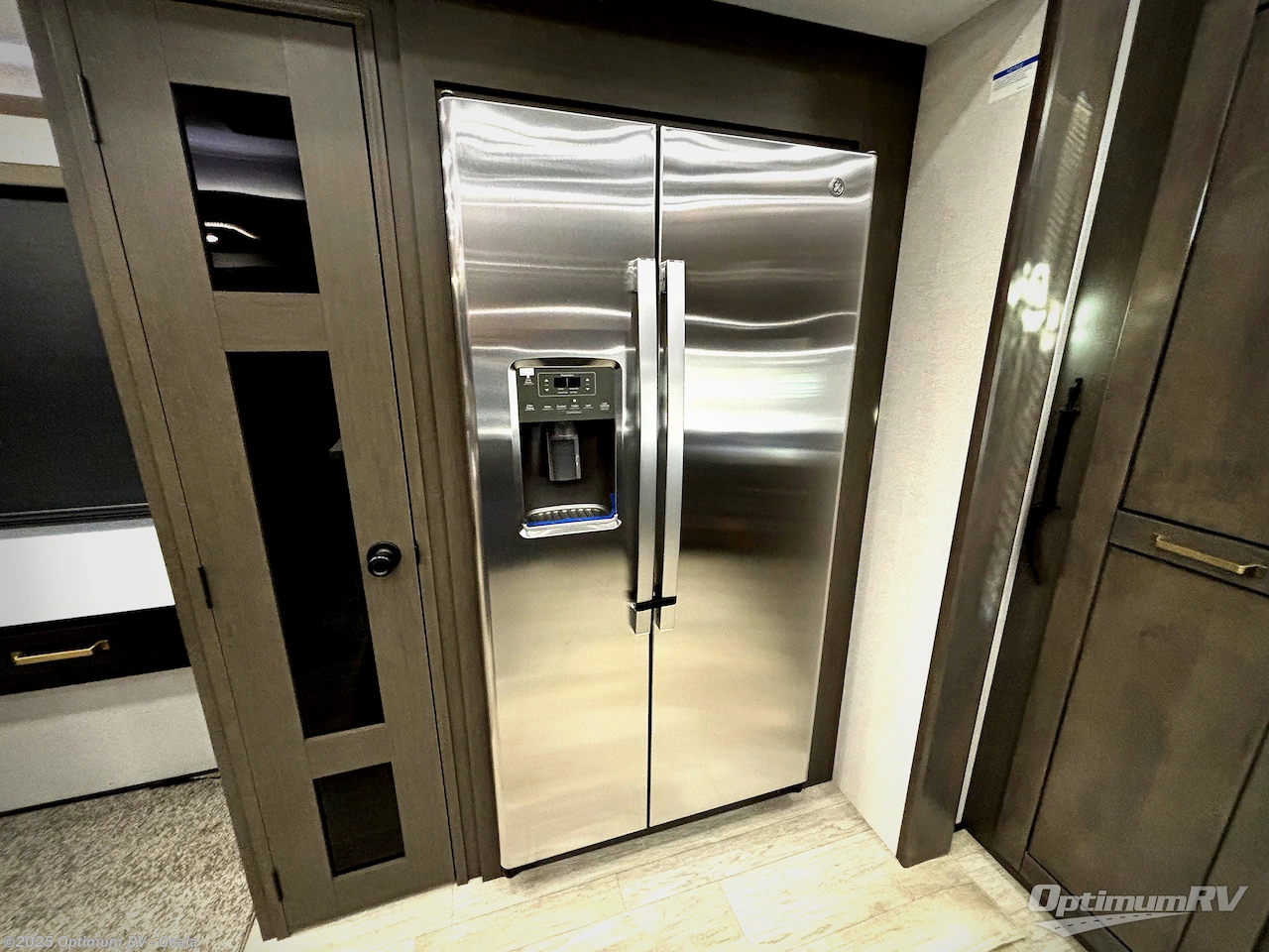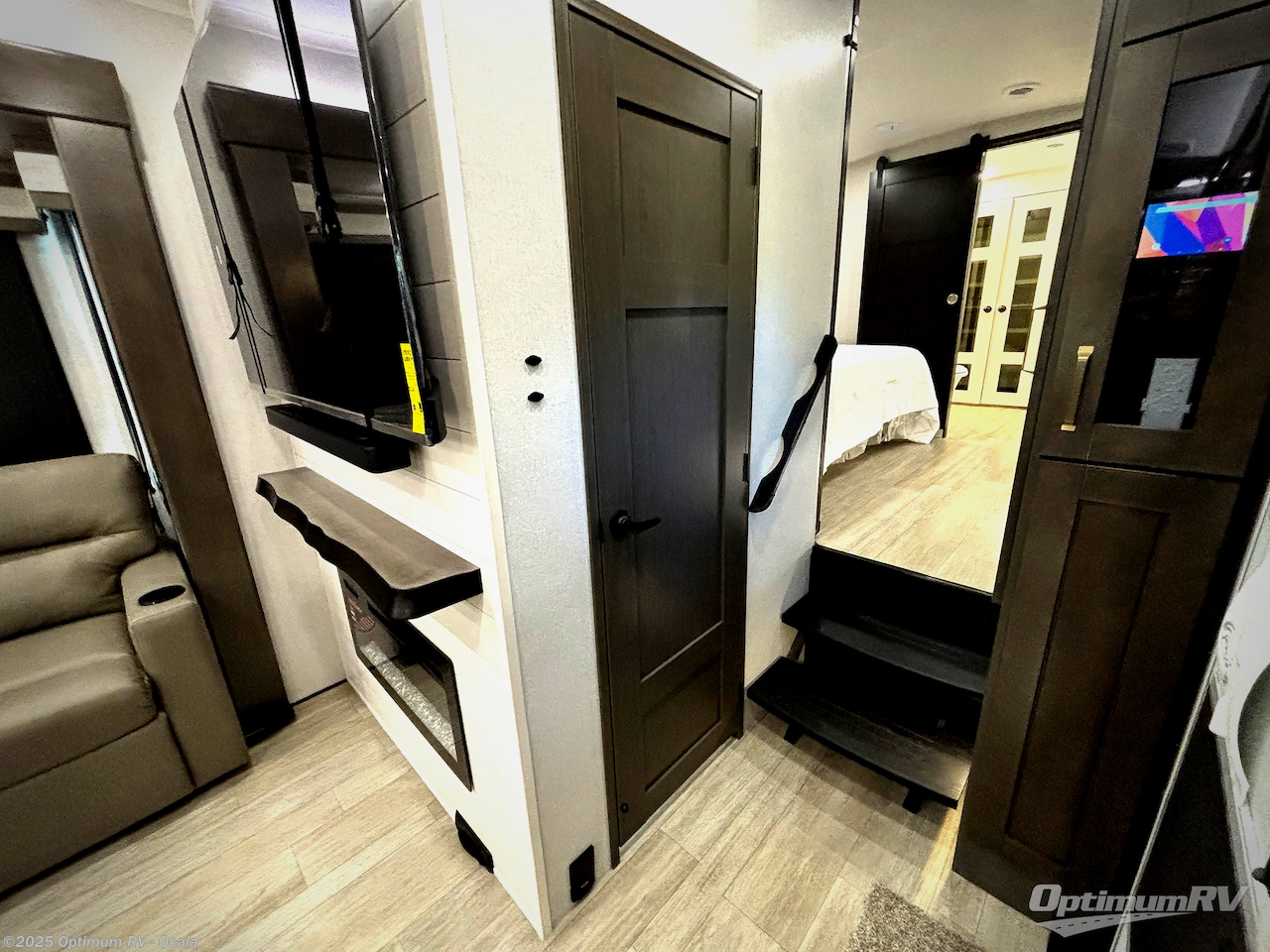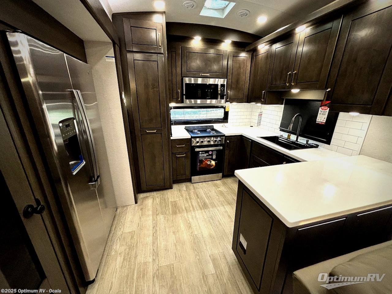 Starting from the back, this impressive 39RK features a rear kitchen designed in a convenient U-shape for easy accessibility and efficient meal prep. The kitchen is fully equipped with plenty of overhead cabinets, a convection microwave with an air fryer, a 24" range, and a pull-out pantry, perfect for the chef on the trip to cook in comfort. Across the kitchen, the large slide-out houses a 21-cu. ft. refrigerator and a second pantry with shelves, providing even more space to store groceries, snacks, and coffee essentials. The nearby desk/coffee bar and roll-out table create an inviting area to enjoy meals or unwind with a cup of coffee. The living area offers a spacious 100" L-shaped sofa and a theater seat facing the TV and fireplace, making it an ideal spot for relaxing or hosting movie nights. Moving forward, you’ll find a convenient half bathroom with linen shelves for added storage and accessibility. At the front, the private bedroom features a 72" x 80" king bed in a slide-out with a dresser across for ample storage. Finally, the full bathroom at the very front includes a 30" x 61" shower with a seat for comfort, a large sink, and a walk-in closet that provides generous space for all your clothing and gear.