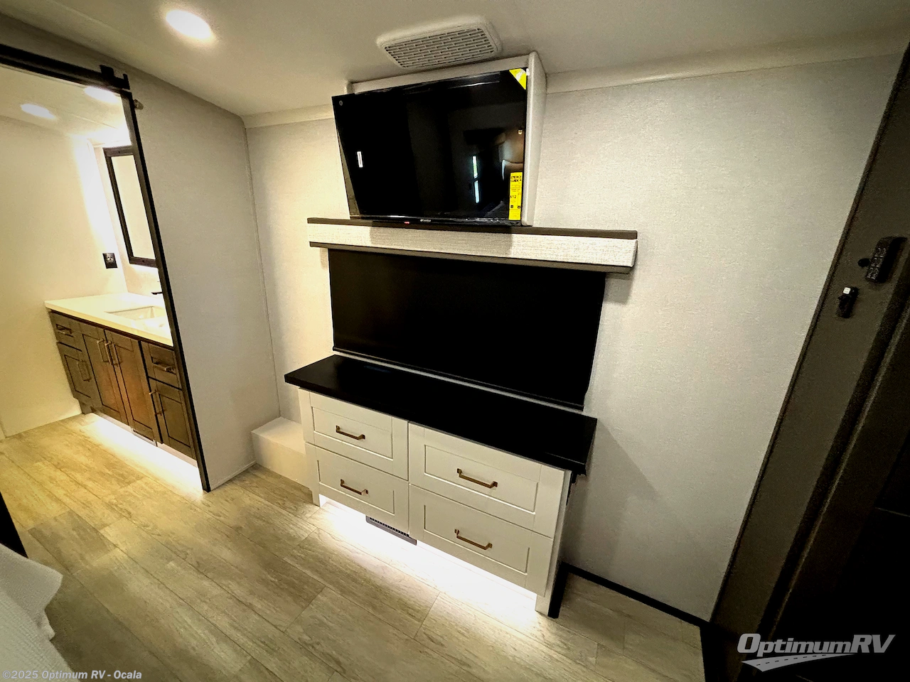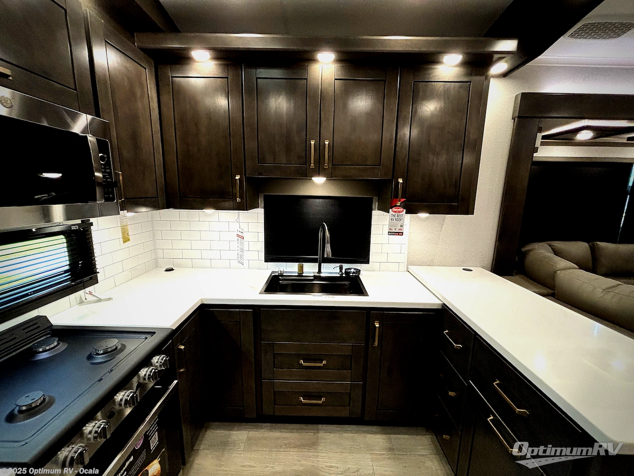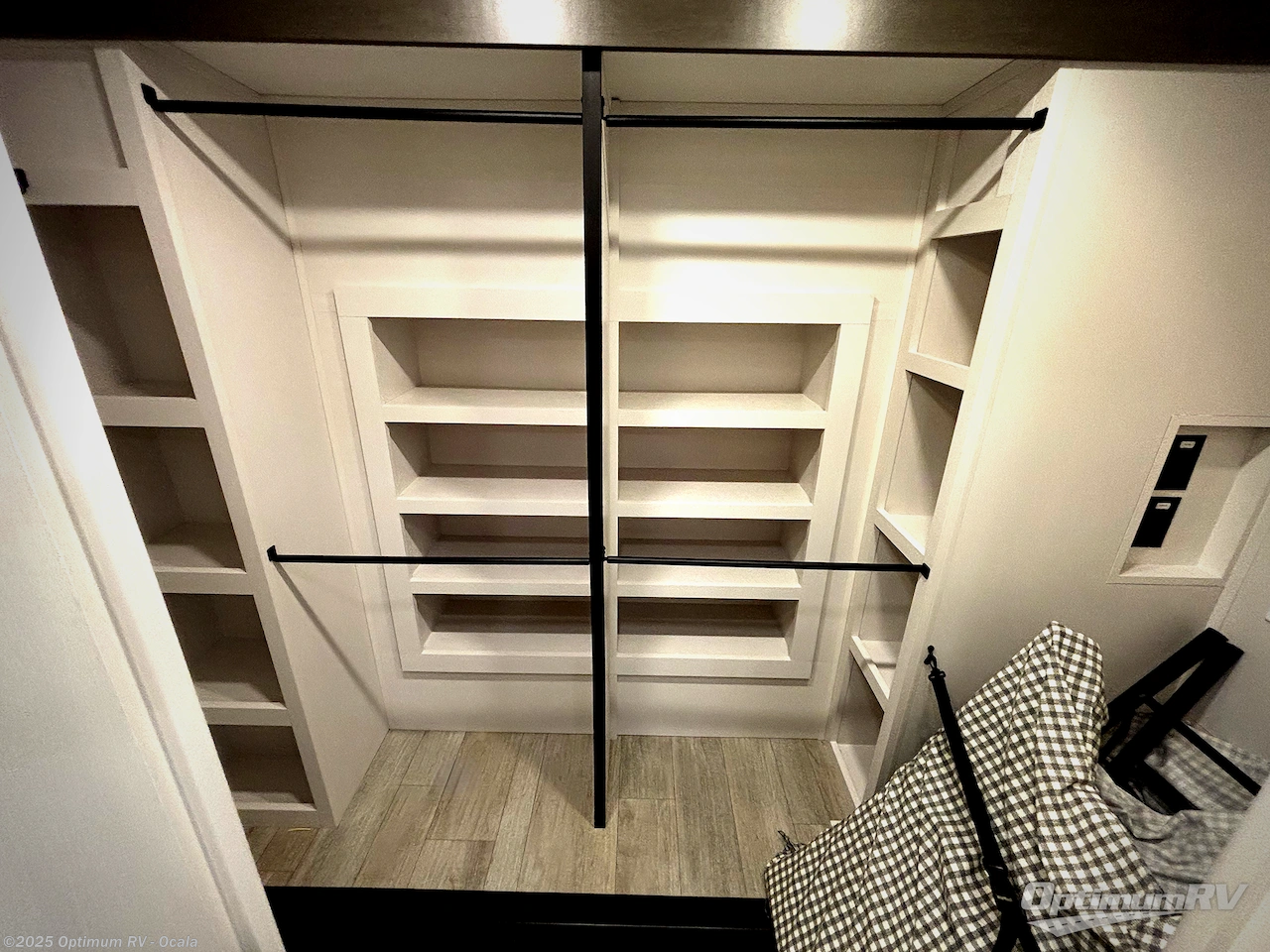 Starting from the back, this impressive 39RK features a rear kitchen designed in a convenient U-shape for easy accessibility and efficient meal prep. The kitchen is fully equipped with plenty of overhead cabinets, a convection microwave with an air fryer, a 24" range, and a pull-out pantry, perfect for the chef on the trip to cook in comfort. Across the kitchen, the large slide-out houses a 21-cu. ft. refrigerator and a second pantry with shelves, providing even more space to store groceries, snacks, and coffee essentials. The nearby desk/coffee bar and roll-out table create an inviting area to enjoy meals or unwind with a cup of coffee. The living area offers a spacious 100" L-shaped sofa and a theater seat facing the TV and fireplace, making it an ideal spot for relaxing or hosting movie nights. Moving forward, you’ll find a convenient half bathroom with linen shelves for added storage and accessibility. At the front, the private bedroom features a 72" x 80" king bed in a slide-out with a dresser across for ample storage. Finally, the full bathroom at the very front includes a 30" x 61" shower with a seat for comfort, a large sink, and a walk-in closet that provides generous space for all your clothing and gear.