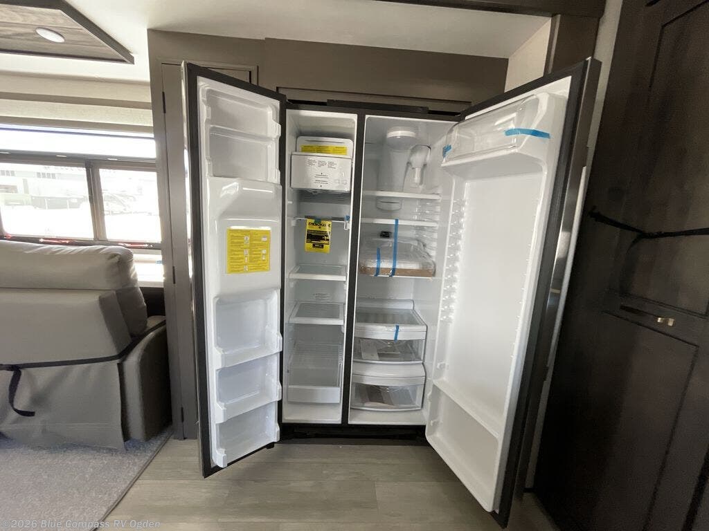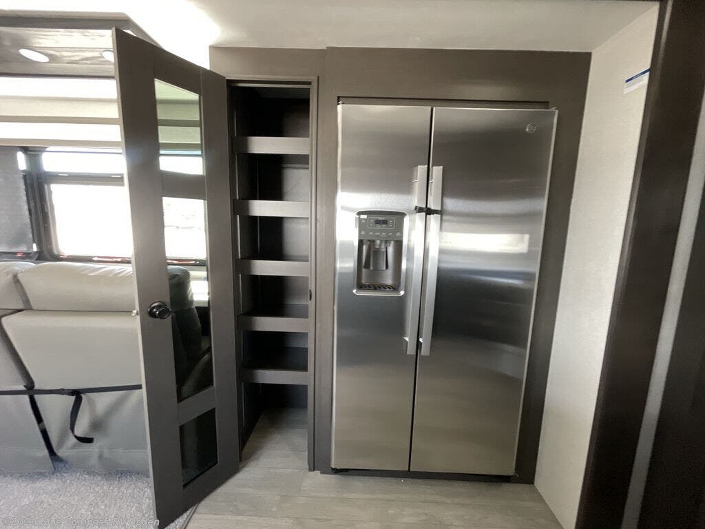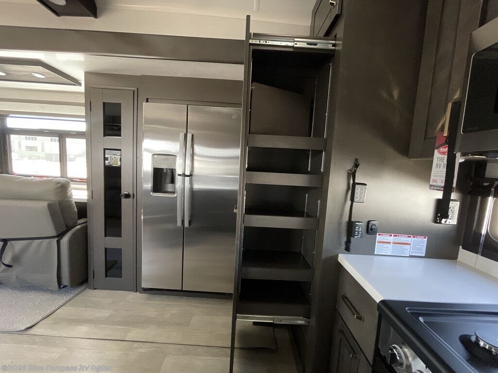 Starting from the back, this impressive 39RK features a rear kitchen designed in a convenient U-shape for easy accessibility and efficient meal prep. The kitchen is fully equipped with plenty of overhead cabinets, a convection microwave with an air fryer, a 24" range, and a pull-out pantry, perfect for the chef on the trip to cook in comfort. Across the kitchen, the large slide-out houses a 21-cu. ft. refrigerator and a second pantry with shelves, providing even more space to store groceries, snacks, and coffee essentials. The nearby desk/coffee bar and roll-out table create an inviting area to enjoy meals or unwind with a cup of coffee. The living area offers a spacious 100" L-shaped sofa and a theater seat facing the TV and fireplace, making it an ideal spot for relaxing or hosting movie nights. Moving forward, you’ll find a convenient half bathroom with linen shelves for added storage and accessibility. At the front, the private bedroom features a 72" x 80" king bed in a slide-out with a dresser across for ample storage. Finally, the full bathroom at the very front includes a 30" x 61" shower with a seat for comfort, a large sink, and a walk-in closet that provides generous space for all your clothing and gear.