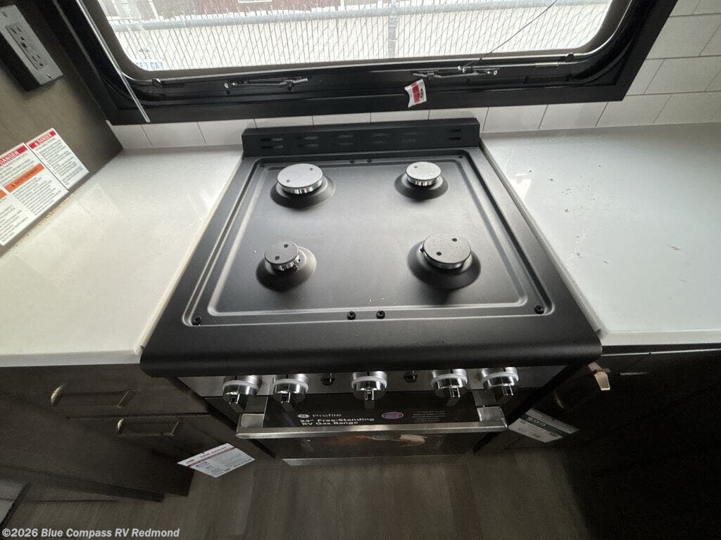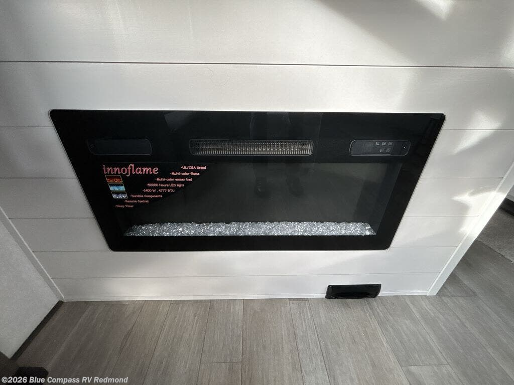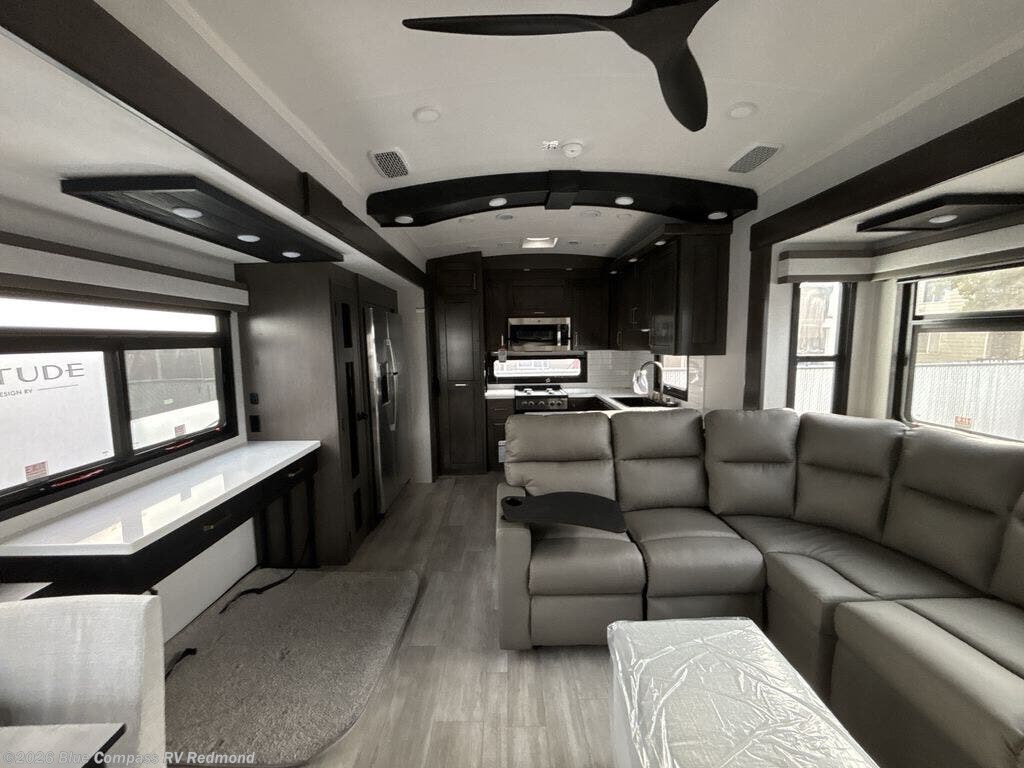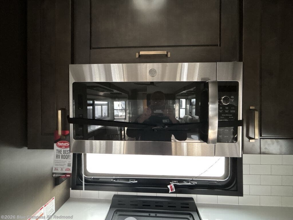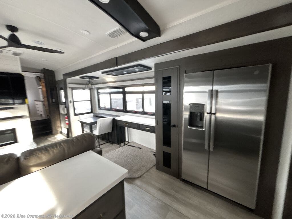 Starting from the back, this impressive 39RK features a rear kitchen designed in a convenient U-shape for easy accessibility and efficient meal prep. The kitchen is fully equipped with plenty of overhead cabinets, a convection microwave with an air fryer, a 24" range, and a pull-out pantry, perfect for the chef on the trip to cook in comfort. Across the kitchen, the large slide-out houses a 21-cu. ft. refrigerator and a second pantry with shelves, providing even more space to store groceries, snacks, and coffee essentials. The nearby desk/coffee bar and roll-out table create an inviting area to enjoy meals or unwind with a cup of coffee. The living area offers a spacious 100" L-shaped sofa and a theater seat facing the TV and fireplace, making it an ideal spot for relaxing or hosting movie nights. Moving forward, you’ll find a convenient half bathroom with linen shelves for added storage and accessibility. At the front, the private bedroom features a 72" x 80" king bed in a slide-out with a dresser across for ample storage. Finally, the full bathroom at the very front includes a 30" x 61" shower with a seat for comfort, a large sink, and a walk-in closet that provides generous space for all your clothing and gear.