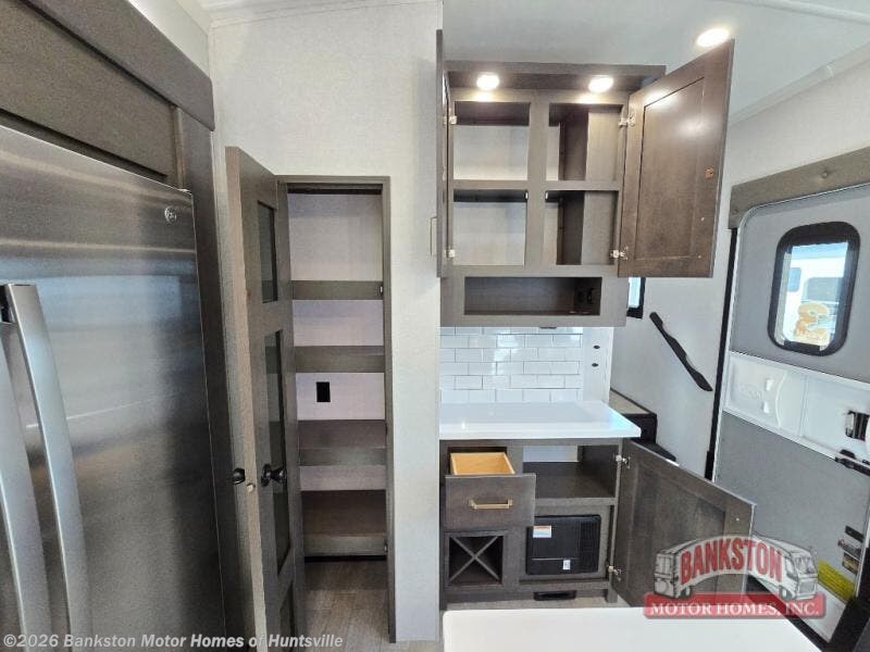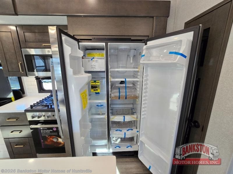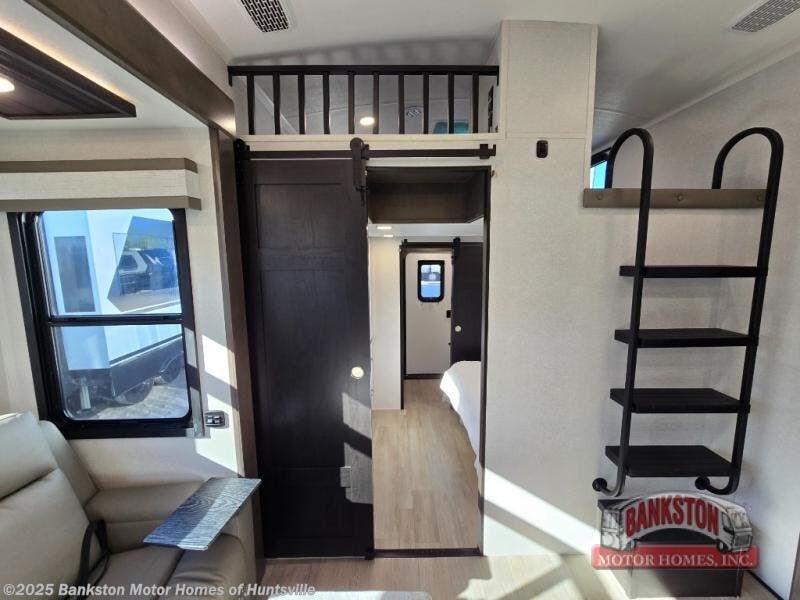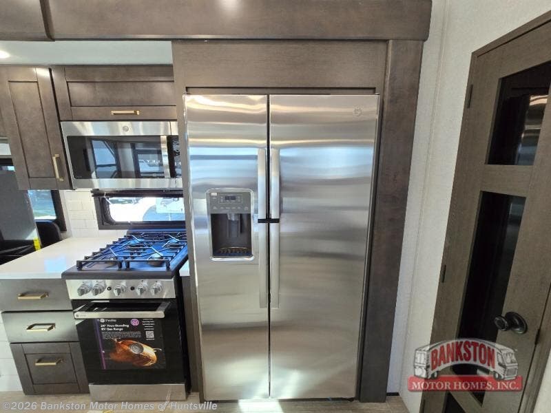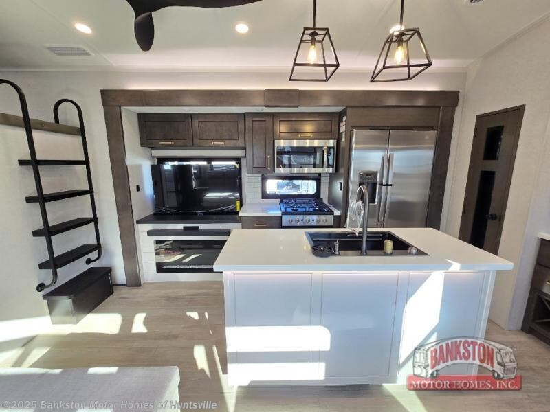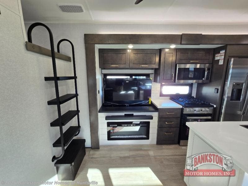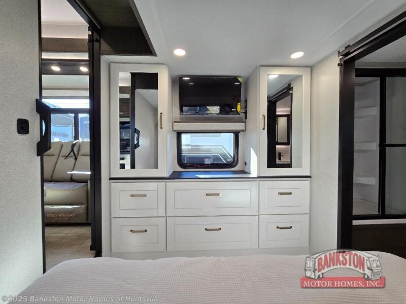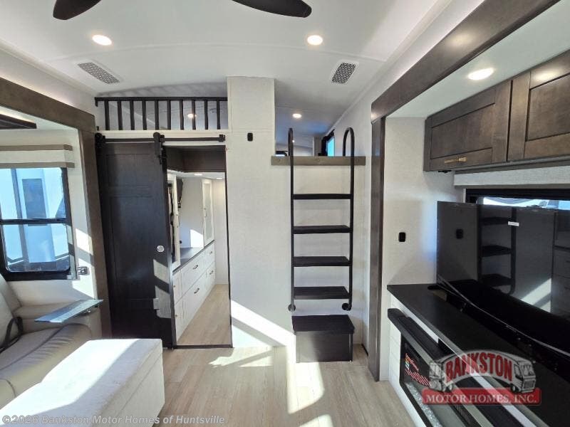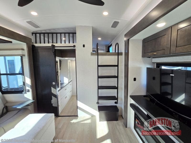 At the front of the 40DB fifth wheel, you’ll find the inviting front bedroom featuring a spacious 72" x 80" king bed, perfect for a restful night’s sleep. This room also includes a wardrobe and a flip-up dresser with a TV above, providing plenty of storage for clothing and essentials. Moving down the hall, one of two full bathrooms offers a 36" x 48" shower with a built-in seat for added accessibility, along with linen shelves for extra storage. At the center of the trailer, the main living area opens up with dual opposing slides for maximum comfort and room to move. One slide houses a 21-cu. ft. residential refrigerator and a 30" space-saving convection microwave with a built-in air fryer, while the central kitchen island includes a sink and pull-out cutting board, everything you need to prepare meals on the go. Across the way, the opposite slide features a roll-out table and theater seating, creating the perfect space to dine and relax after a long day. At the rear, the second bedroom includes a 60" x 80" queen bed in a slide-out with two wardrobes opposite for ample storage, plus a private full bathroom complete with a tub/shower combo and its own exterior exit for added convenience. Above it all, the loft provides three 30" x 80" bed mats and a loft cabinet, offering extra-sleeping space or additional storage for the whole family’s adventures.