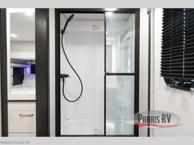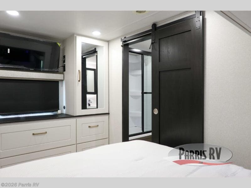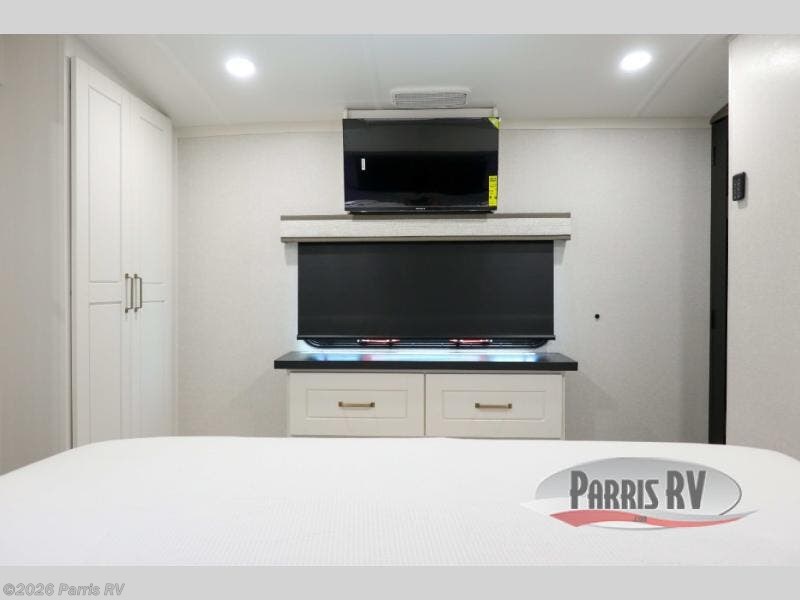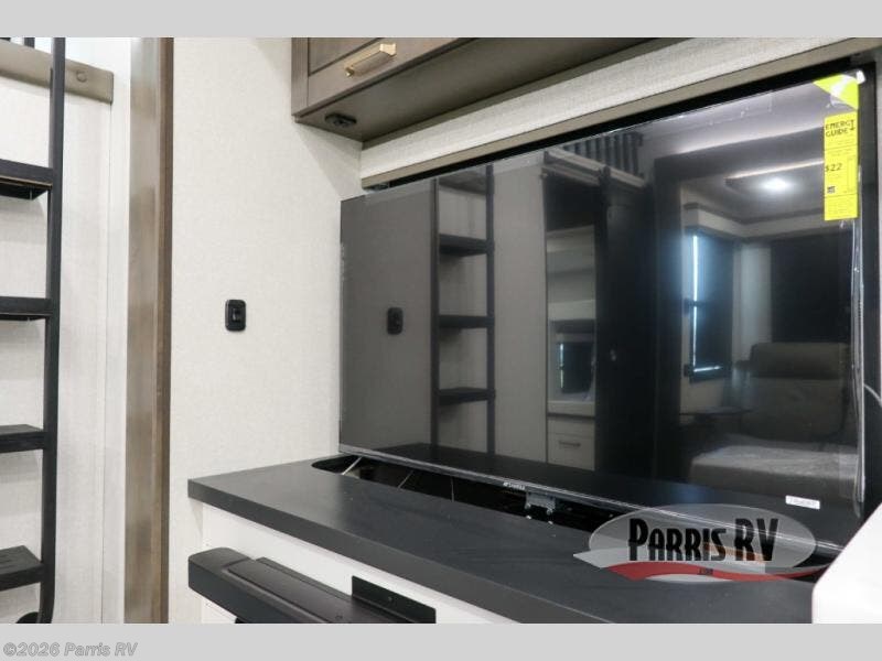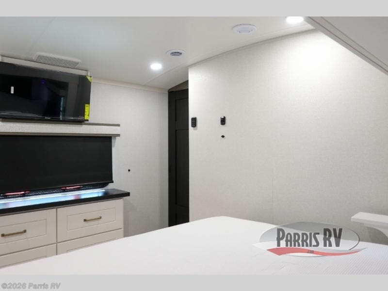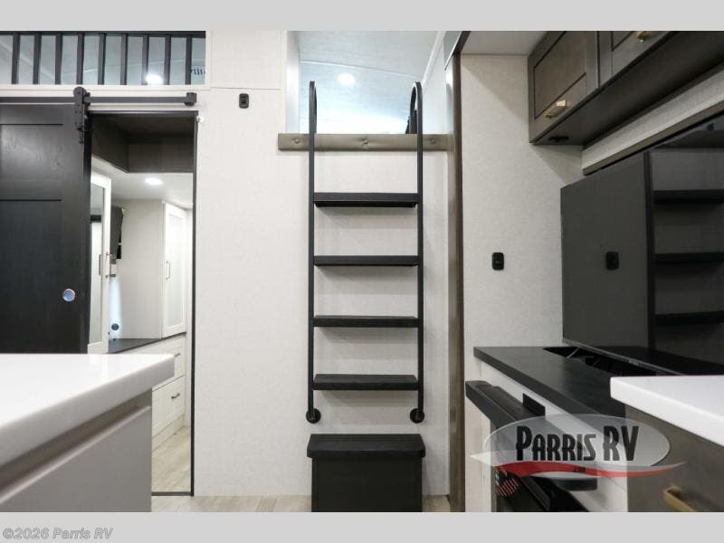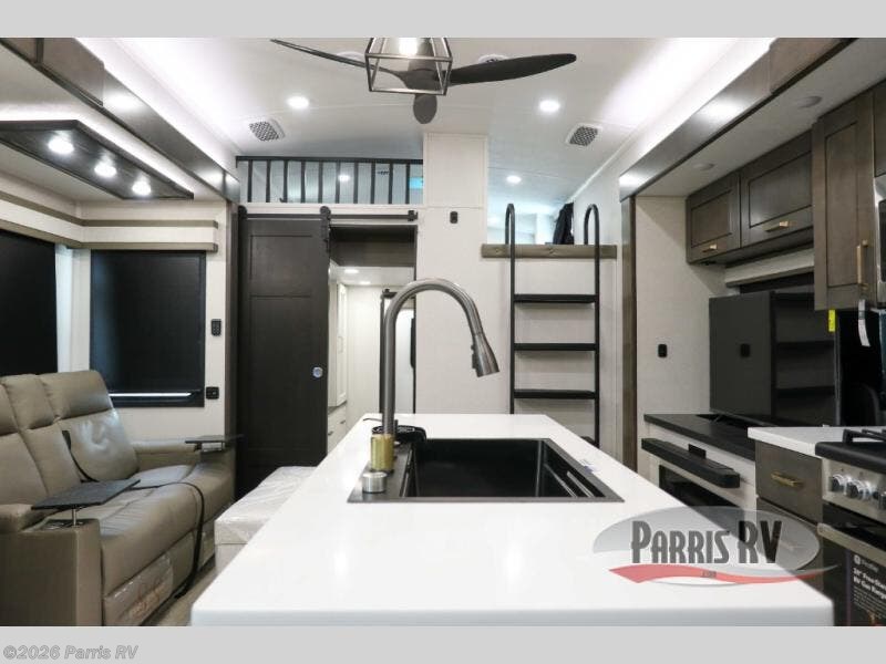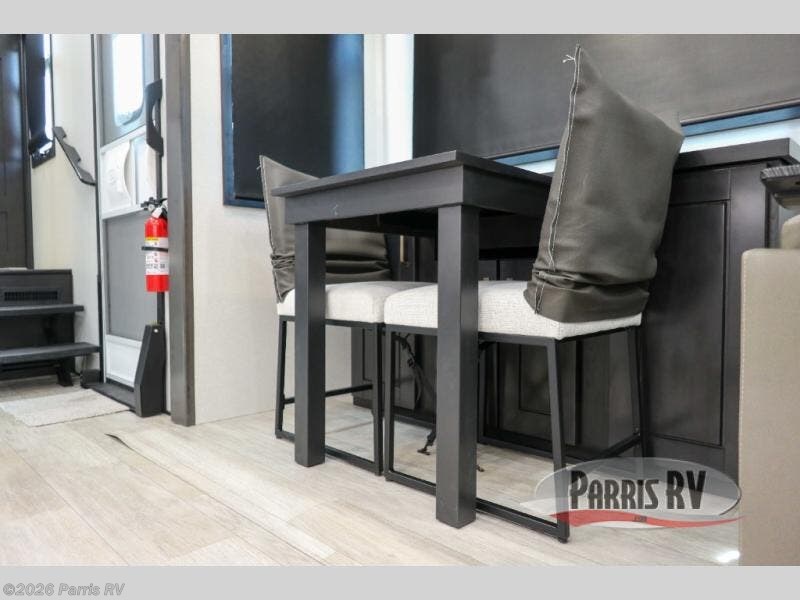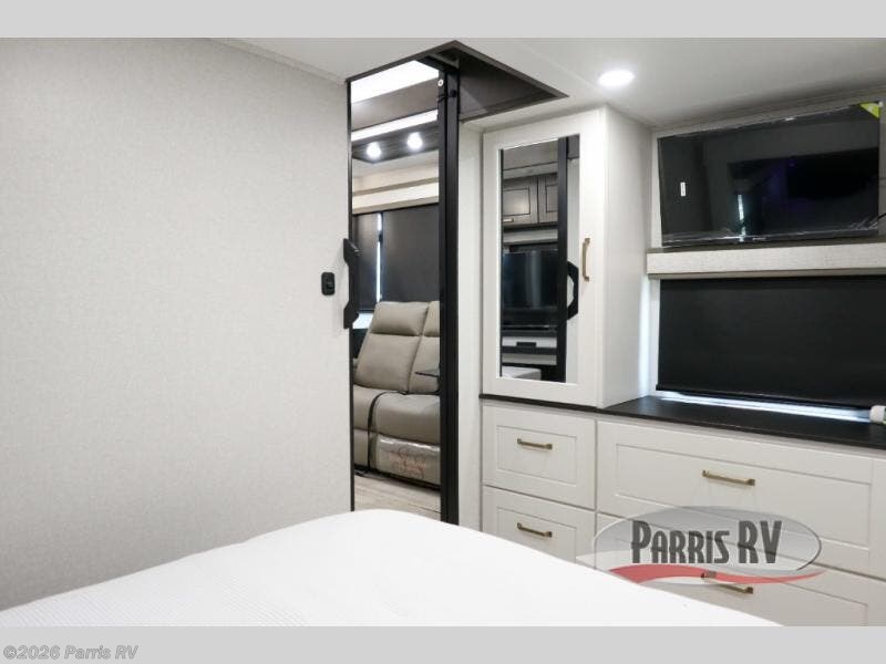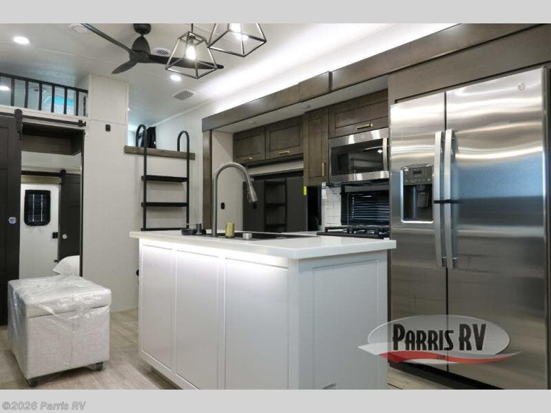 At the front of the 40DB fifth wheel, you’ll find the inviting front bedroom featuring a spacious 72" x 80" king bed, perfect for a restful night’s sleep. This room also includes a wardrobe and a flip-up dresser with a TV above, providing plenty of storage for clothing and essentials. Moving down the hall, one of two full bathrooms offers a 36" x 48" shower with a built-in seat for added accessibility, along with linen shelves for extra storage. At the center of the trailer, the main living area opens up with dual opposing slides for maximum comfort and room to move. One slide houses a 21-cu. ft. residential refrigerator and a 30" space-saving convection microwave with a built-in air fryer, while the central kitchen island includes a sink and pull-out cutting board, everything you need to prepare meals on the go. Across the way, the opposite slide features a roll-out table and theater seating, creating the perfect space to dine and relax after a long day. At the rear, the second bedroom includes a 60" x 80" queen bed in a slide-out with two wardrobes opposite for ample storage, plus a private full bathroom complete with a tub/shower combo and its own exterior exit for added convenience. Above it all, the loft provides three 30" x 80" bed mats and a loft cabinet, offering extra-sleeping space or additional storage for the whole family’s adventures.