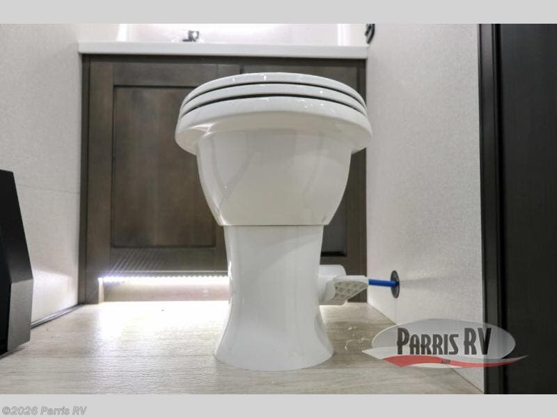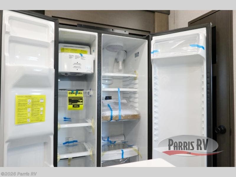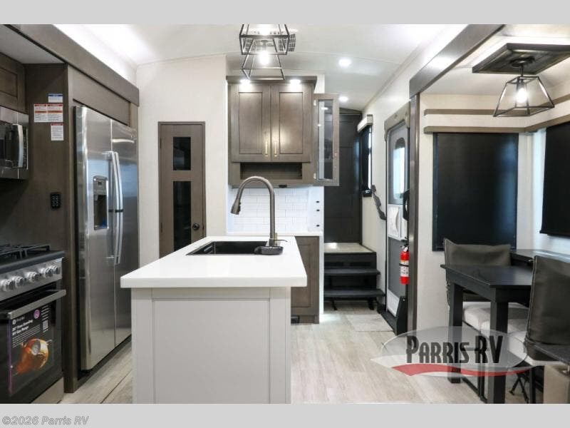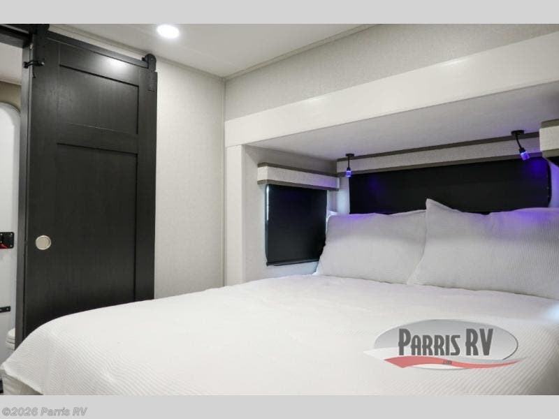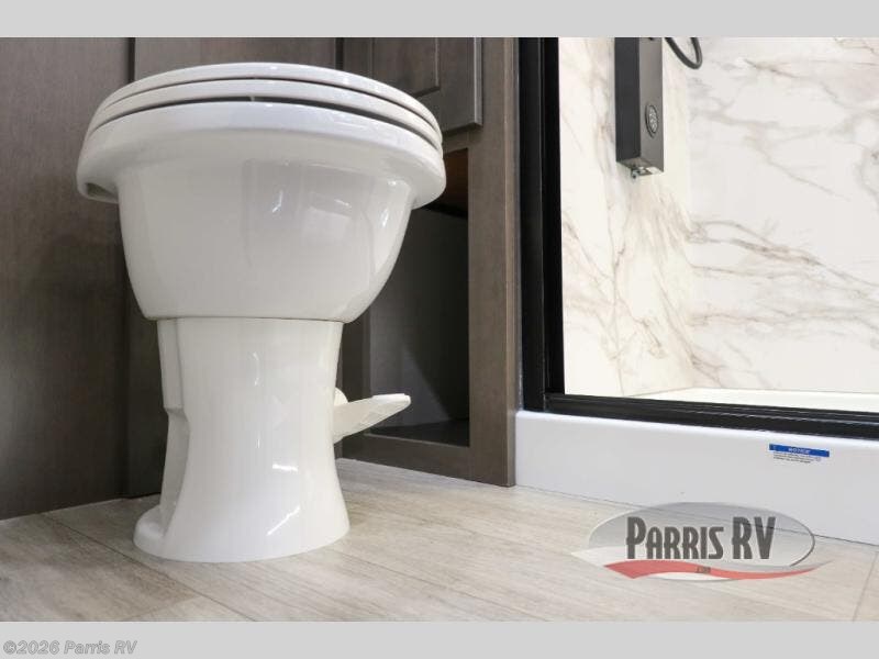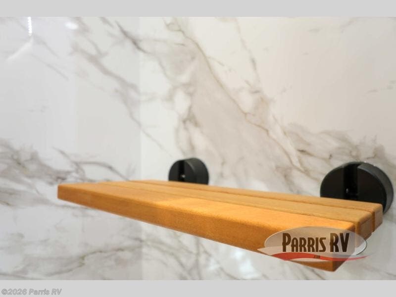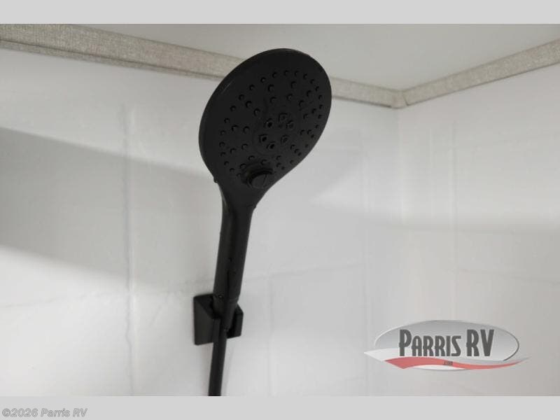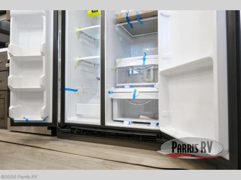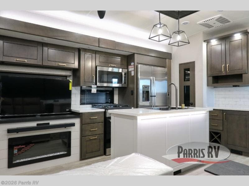 At the front of the 40DB fifth wheel, you’ll find the inviting front bedroom featuring a spacious 72" x 80" king bed, perfect for a restful night’s sleep. This room also includes a wardrobe and a flip-up dresser with a TV above, providing plenty of storage for clothing and essentials. Moving down the hall, one of two full bathrooms offers a 36" x 48" shower with a built-in seat for added accessibility, along with linen shelves for extra storage. At the center of the trailer, the main living area opens up with dual opposing slides for maximum comfort and room to move. One slide houses a 21-cu. ft. residential refrigerator and a 30" space-saving convection microwave with a built-in air fryer, while the central kitchen island includes a sink and pull-out cutting board, everything you need to prepare meals on the go. Across the way, the opposite slide features a roll-out table and theater seating, creating the perfect space to dine and relax after a long day. At the rear, the second bedroom includes a 60" x 80" queen bed in a slide-out with two wardrobes opposite for ample storage, plus a private full bathroom complete with a tub/shower combo and its own exterior exit for added convenience. Above it all, the loft provides three 30" x 80" bed mats and a loft cabinet, offering extra-sleeping space or additional storage for the whole family’s adventures.
