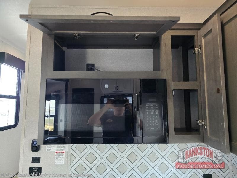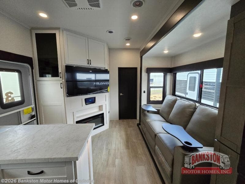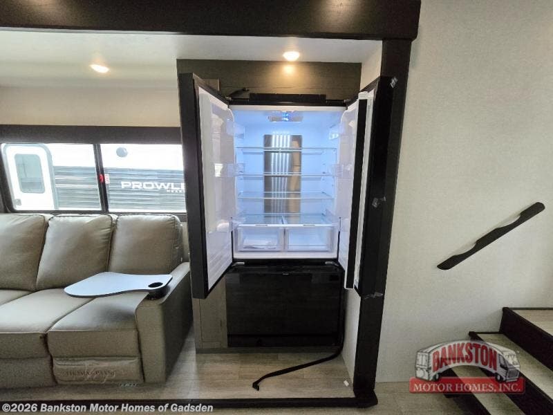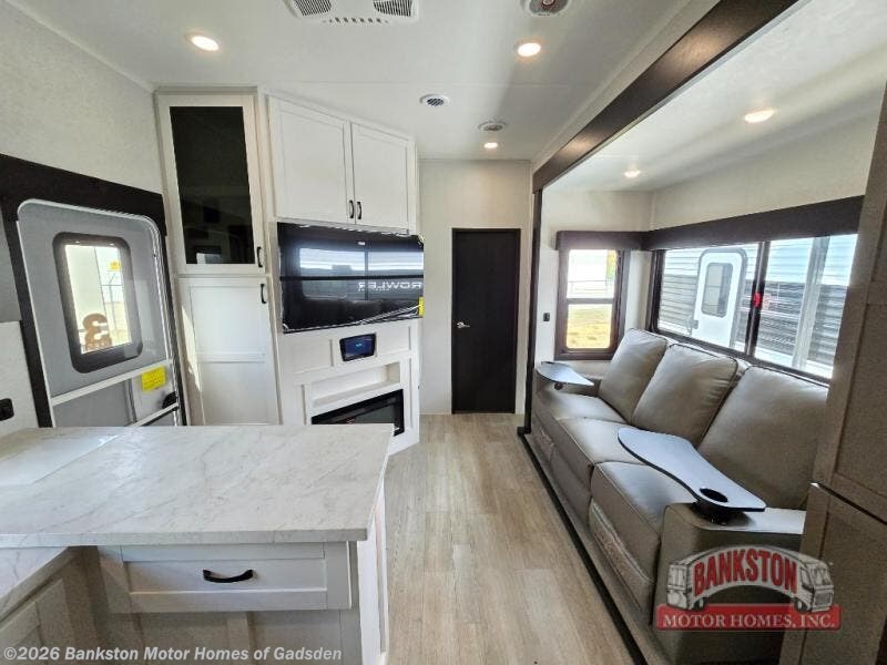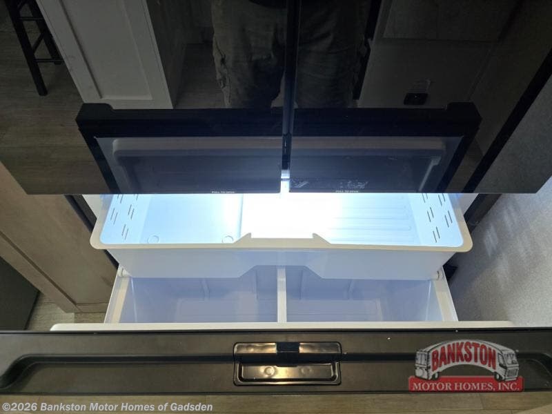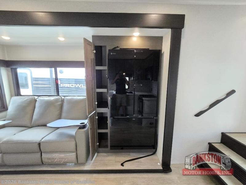 Have a good night's sleep on the road in the front bedroom, featuring an Olympic queen bed, a wardrobe, a shelf, overhead cabinets, and drawers. This is the perfect spot to recharge after a long day of adventure. The 11' garage is a game-changer, featuring a Happi Jack power bunk for easy loading and unloading of your toys. The cargo table is perfect for working on projects or storing gear. The kitchen is fully equipped with three pantries, overhead cabinets, microwave, a sink, and a refrigerator, making meal prep and cooking so easy! The sofa is the perfect spot to unwind, the entertainment center provides endless hours of fun, and the full bathroom and half bath provide convenient spaces for freshening up, making it ideal for families or groups.