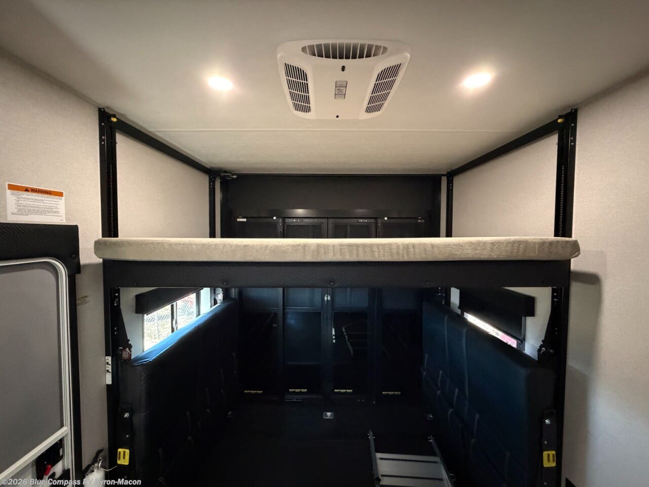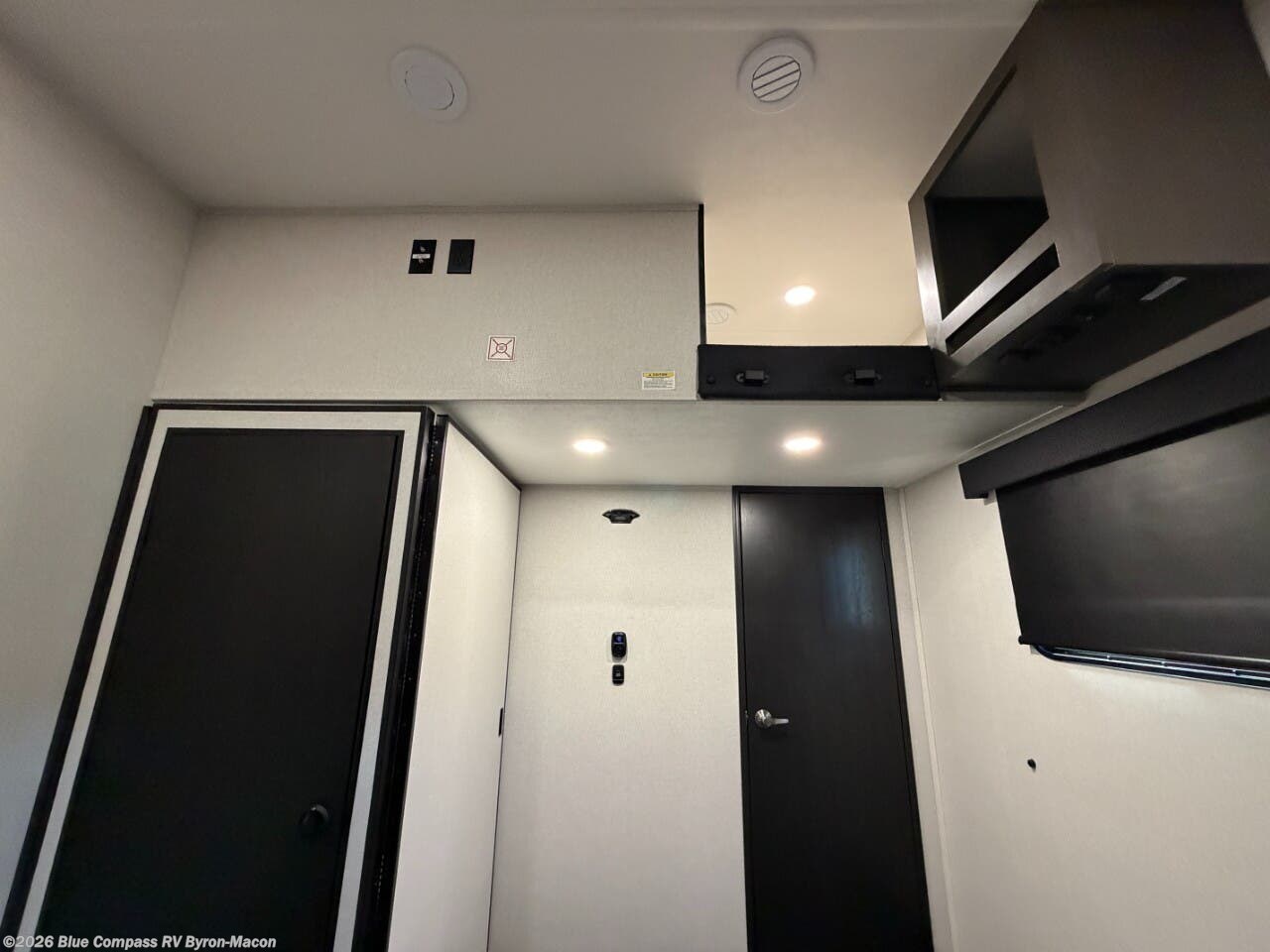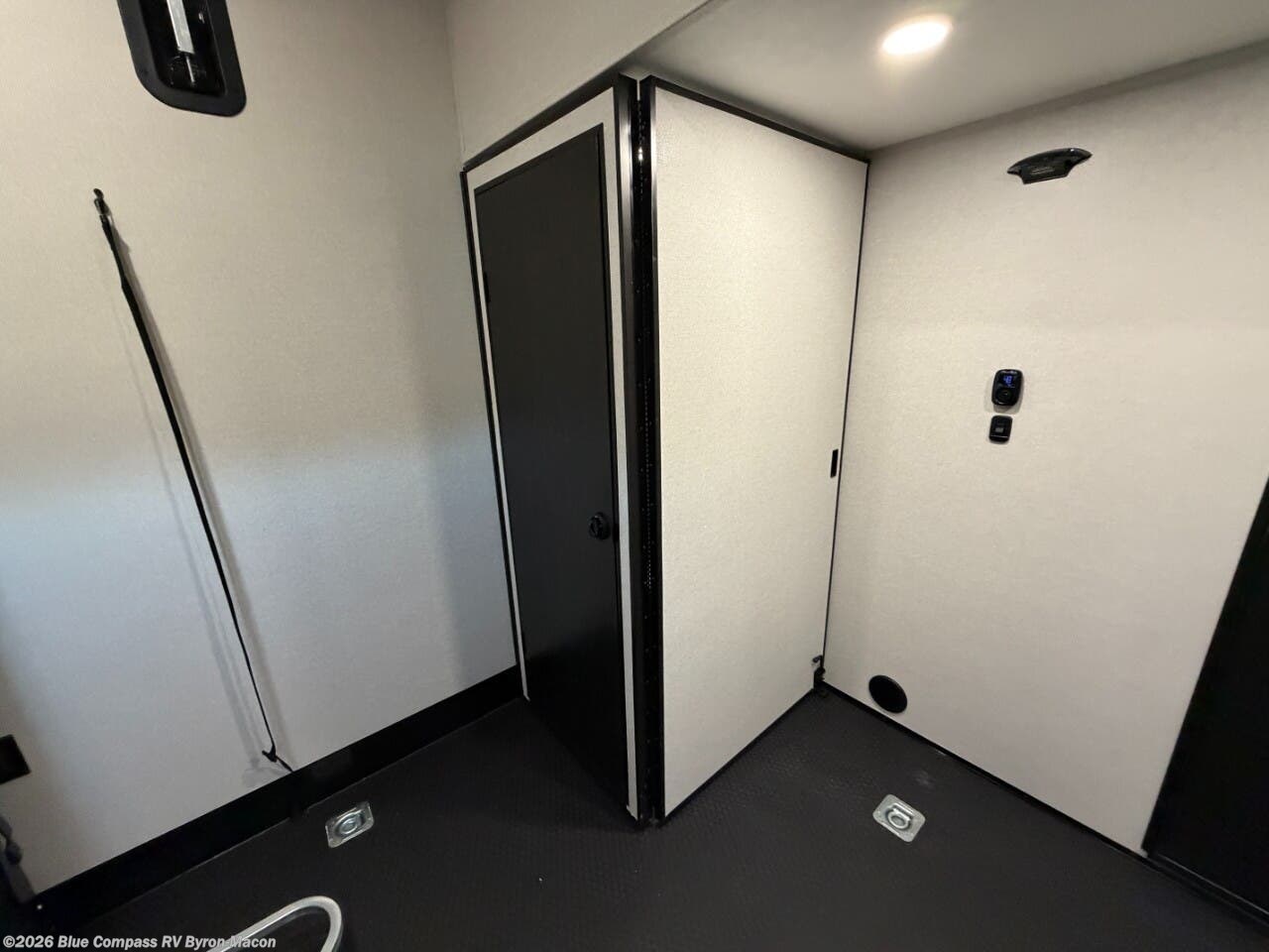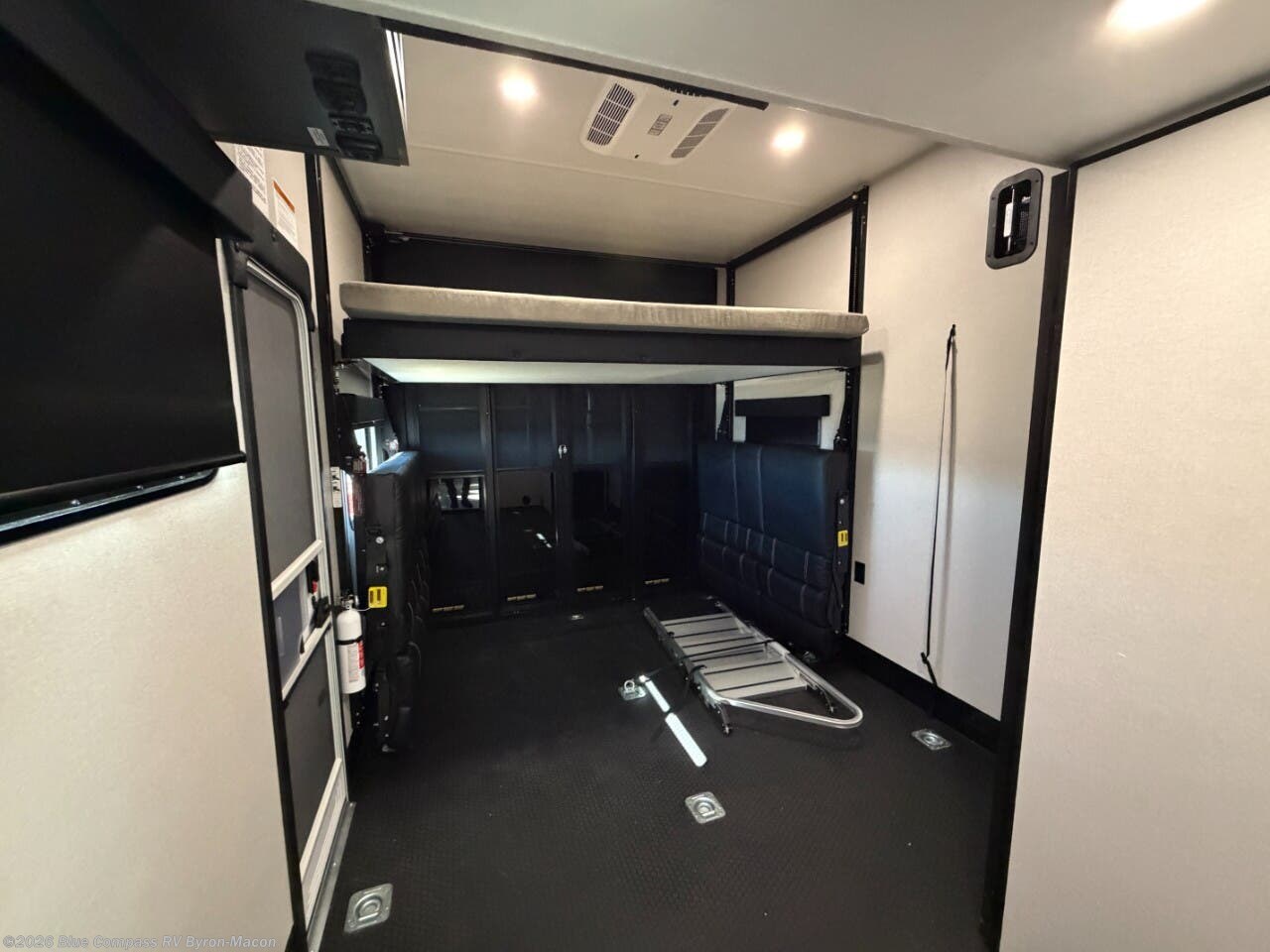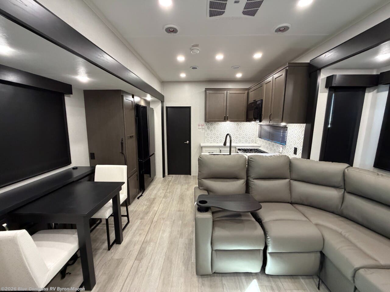 The 13' 6" garage is the perfect space for your toys, with enough room for your ATV, motorcycle, or other gear. Plus, the electric queen bed provides a comfortable spot to rest after a long day. The overhead loft with storage provides additional space for your gear, keeping it out of the way but still accessible. The kitchen is fully equipped with a microwave, sink, overhead cabinets, pantry, and coffee bar. The L-shaped sofa provides ample seating for relaxation, and the TV is perfectly positioned for viewing. The full bathroom is a welcome convenience, providing a private space to freshen up. Also, the front bedroom is a luxurious retreat, featuring a king bed, a walk-in closet, and drawers, and on the exterior, the two entry/exit doors provide easy access to the outside, making it perfect for loading and unloading your gear.