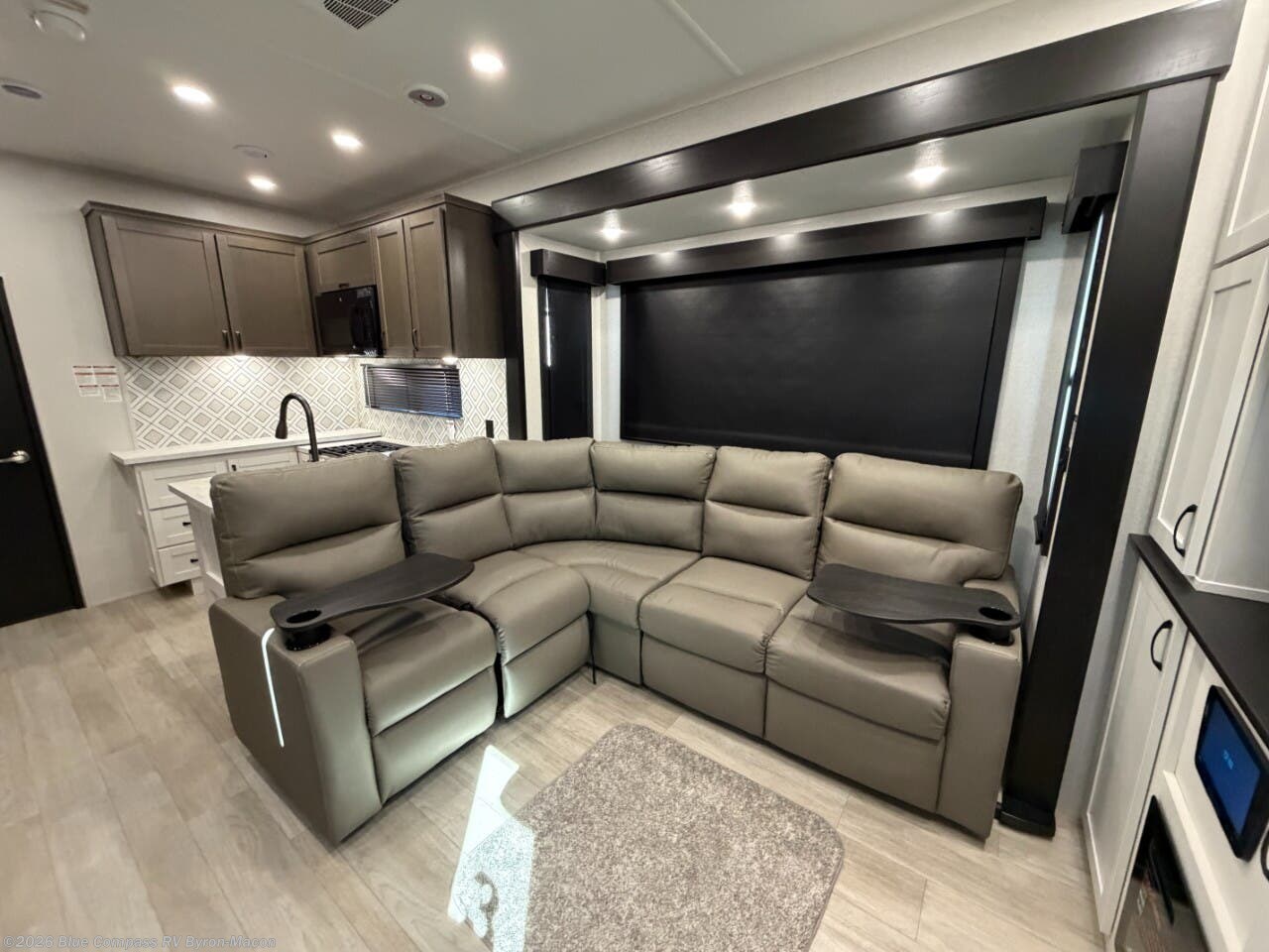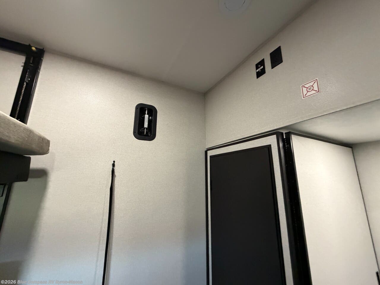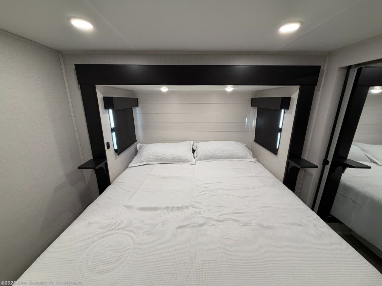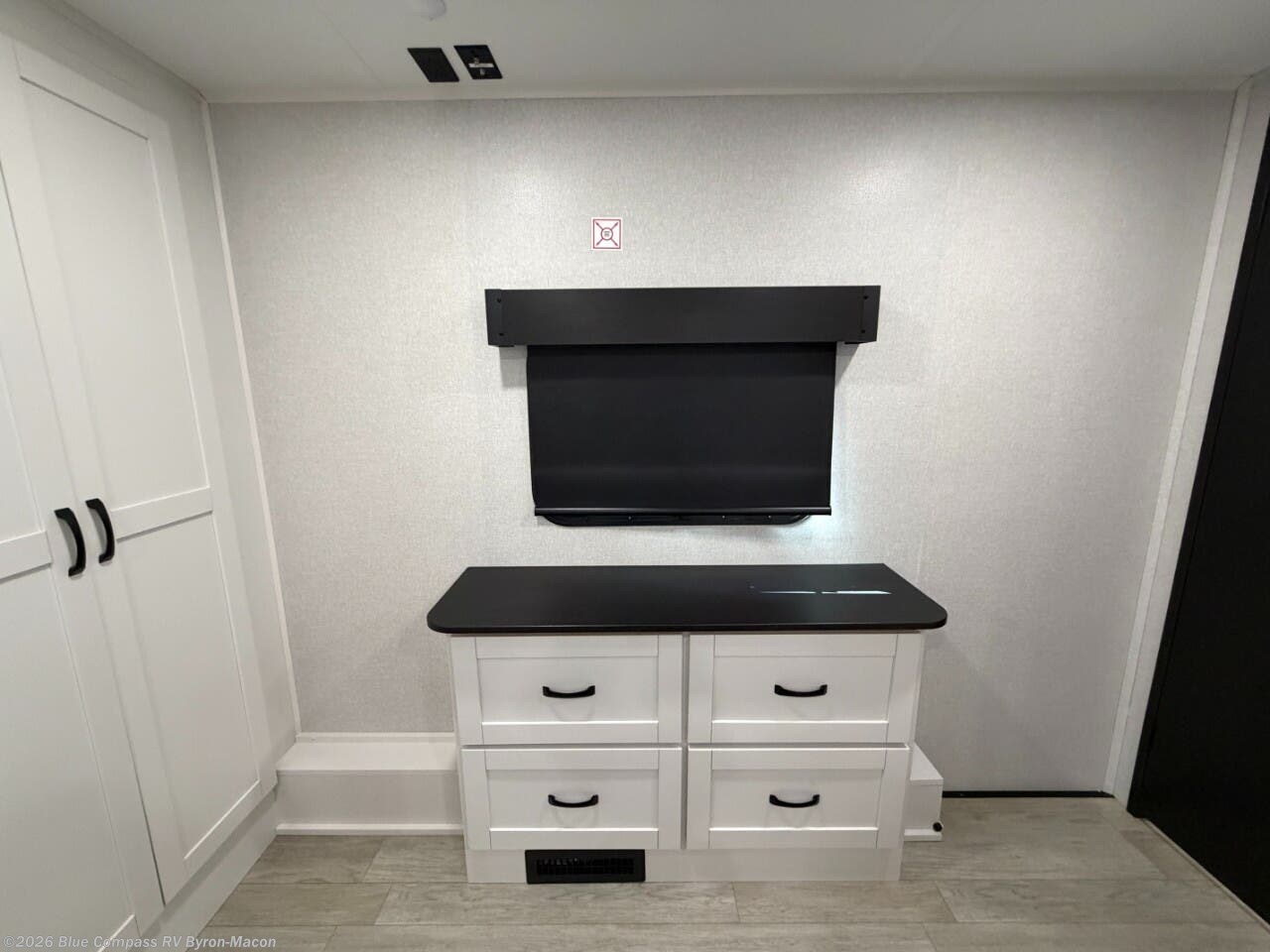 The 13' 6" garage is the perfect space for your toys, with enough room for your ATV, motorcycle, or other gear. Plus, the electric queen bed provides a comfortable spot to rest after a long day. The overhead loft with storage provides additional space for your gear, keeping it out of the way but still accessible. The kitchen is fully equipped with a microwave, sink, overhead cabinets, pantry, and coffee bar. The L-shaped sofa provides ample seating for relaxation, and the TV is perfectly positioned for viewing. The full bathroom is a welcome convenience, providing a private space to freshen up. Also, the front bedroom is a luxurious retreat, featuring a king bed, a walk-in closet, and drawers, and on the exterior, the two entry/exit doors provide easy access to the outside, making it perfect for loading and unloading your gear.