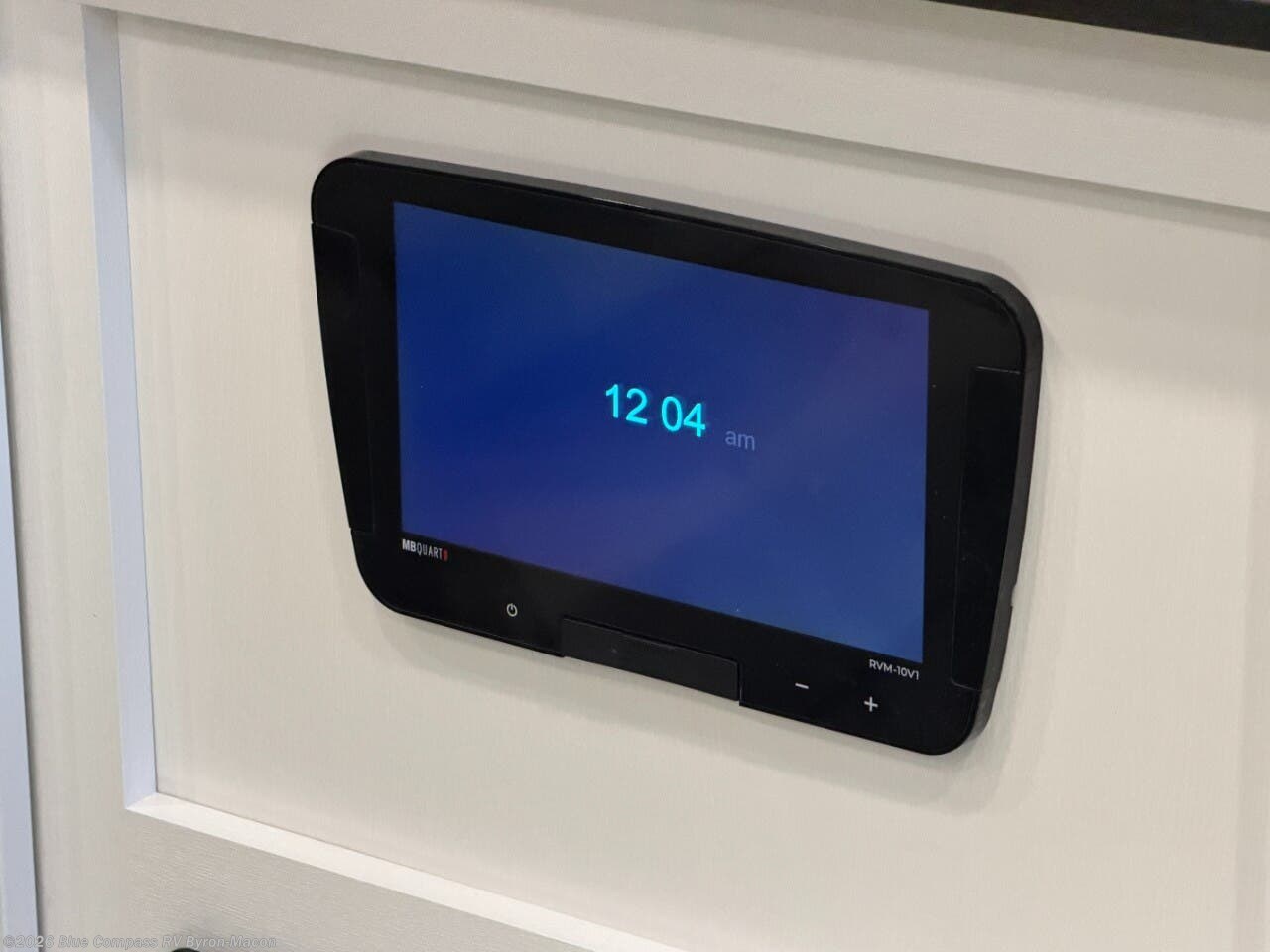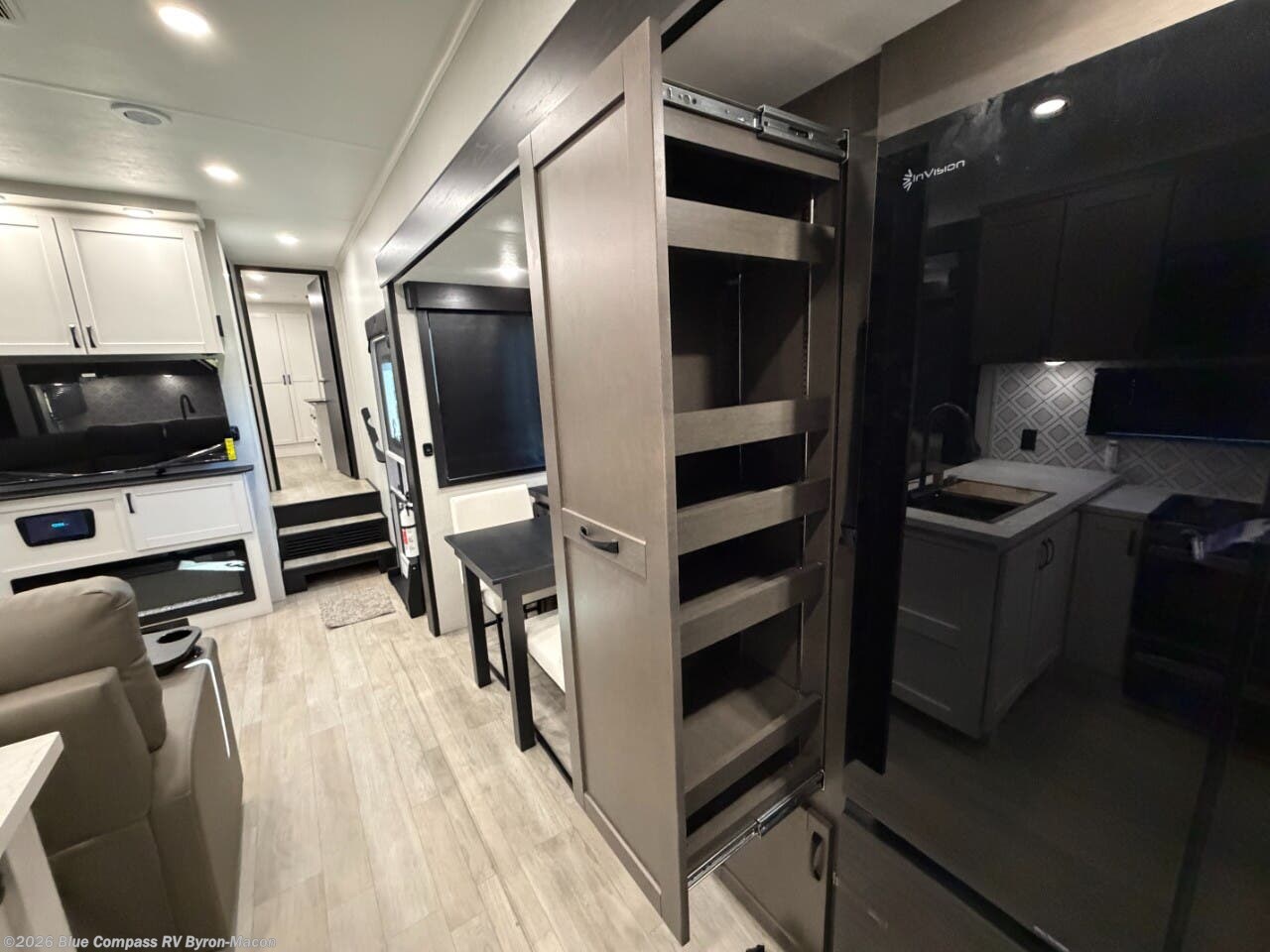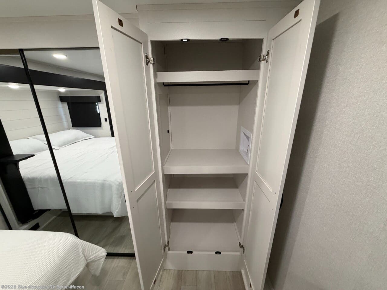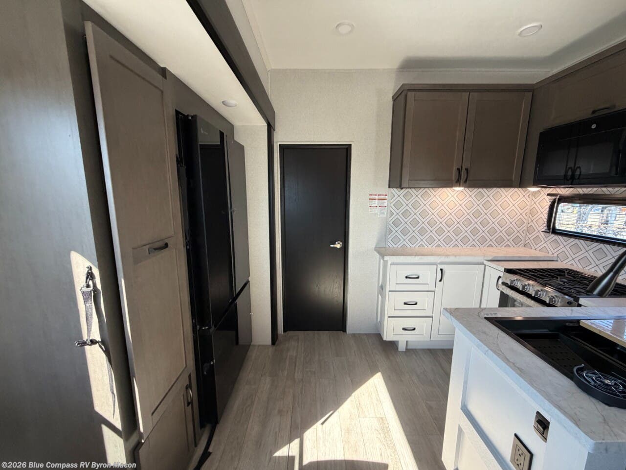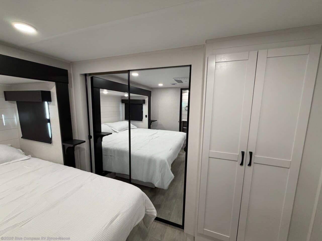 The 13' 6" garage is the perfect space for your toys, with enough room for your ATV, motorcycle, or other gear. Plus, the electric queen bed provides a comfortable spot to rest after a long day. The overhead loft with storage provides additional space for your gear, keeping it out of the way but still accessible. The kitchen is fully equipped with a microwave, sink, overhead cabinets, pantry, and coffee bar. The L-shaped sofa provides ample seating for relaxation, and the TV is perfectly positioned for viewing. The full bathroom is a welcome convenience, providing a private space to freshen up. Also, the front bedroom is a luxurious retreat, featuring a king bed, a walk-in closet, and drawers, and on the exterior, the two entry/exit doors provide easy access to the outside, making it perfect for loading and unloading your gear.