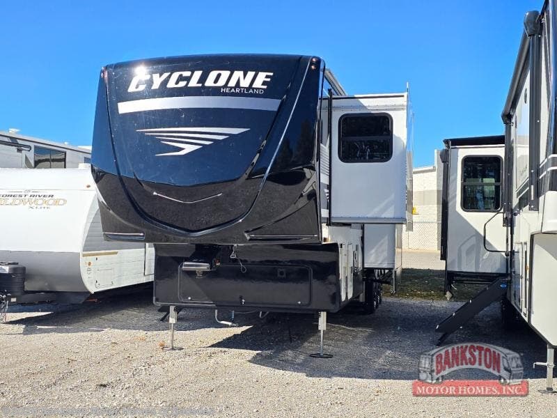 Satisfy your wanderlust with a Heartland Cyclone fifth wheel toy hauler! You won't have to sacrifice any luxury either, with indulgent features like the ducted, fully enclosed, and heated underbelly provides added protection and warmth. Inside, the LED interior lighting throughout ensures that every corner of your RV is bright and inviting, and the bathroom skylight brings in natural light and fresh air, creating a welcoming and refreshing space. Plus, the central command center with built-in tank monitoring keeps you informed and in control, making it easy to manage your resources. Also, the Premium Exterior Package includes diverse features such as Dexter axles with ABS and tow assist with sway mitigation, and the Keyed-Alike lock system ensures that all your locks are keyed the same, providing added security and convenience. Come find the perfect model for you today!