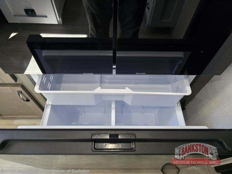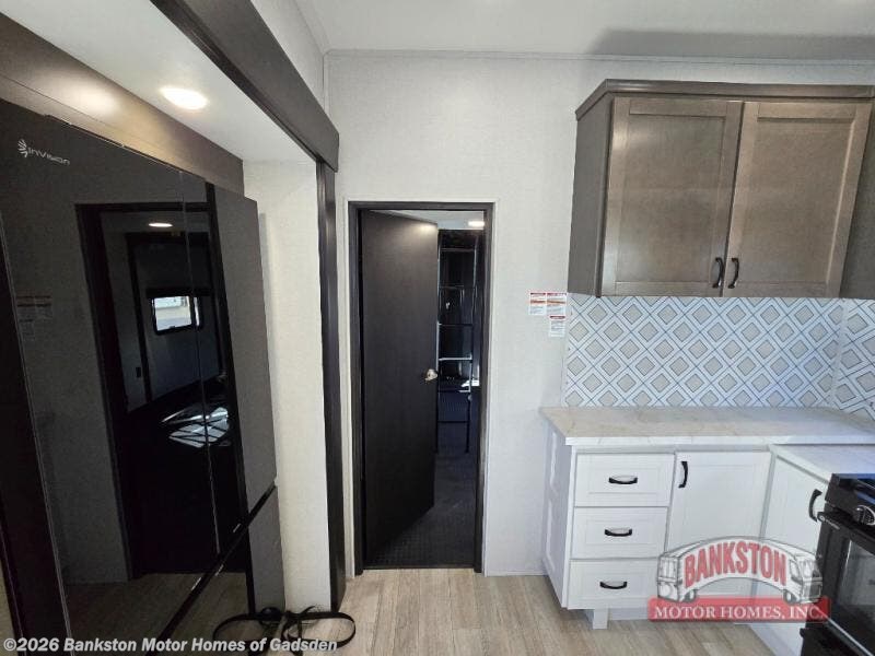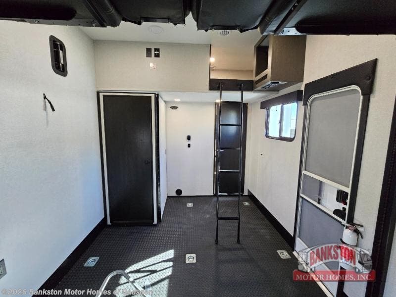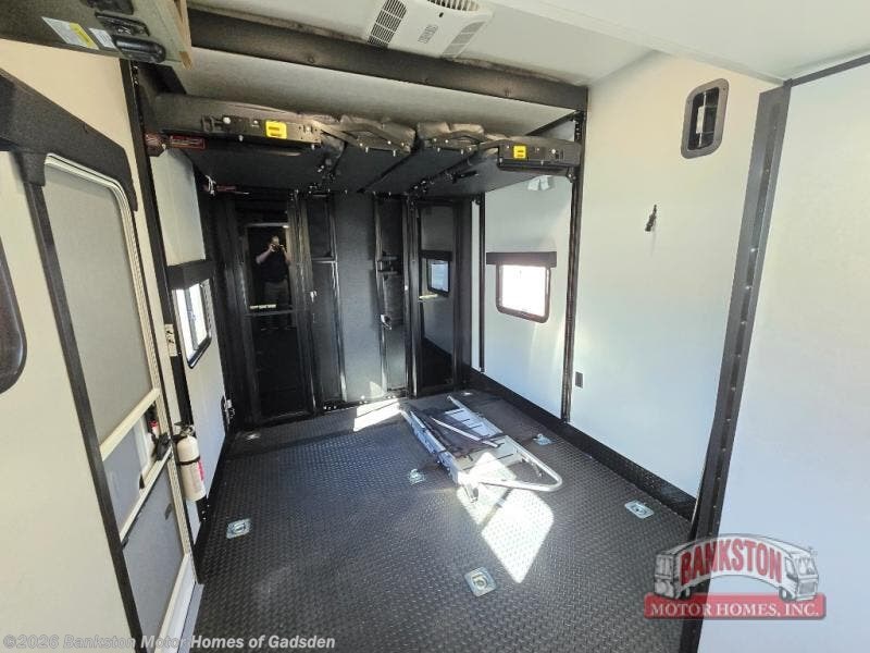 The 13' 6" garage is the perfect space for your toys, with enough room for your ATV, motorcycle, or other gear. Plus, the electric queen bed provides a comfortable spot to rest after a long day. The overhead loft with storage provides additional space for your gear, keeping it out of the way but still accessible. The kitchen is fully equipped with a microwave, sink, overhead cabinets, pantry, and coffee bar. The L-shaped sofa provides ample seating for relaxation, and the TV is perfectly positioned for viewing. The full bathroom is a welcome convenience, providing a private space to freshen up. Also, the front bedroom is a luxurious retreat, featuring a king bed, a walk-in closet, and drawers, and on the exterior, the two entry/exit doors provide easy access to the outside, making it perfect for loading and unloading your gear.