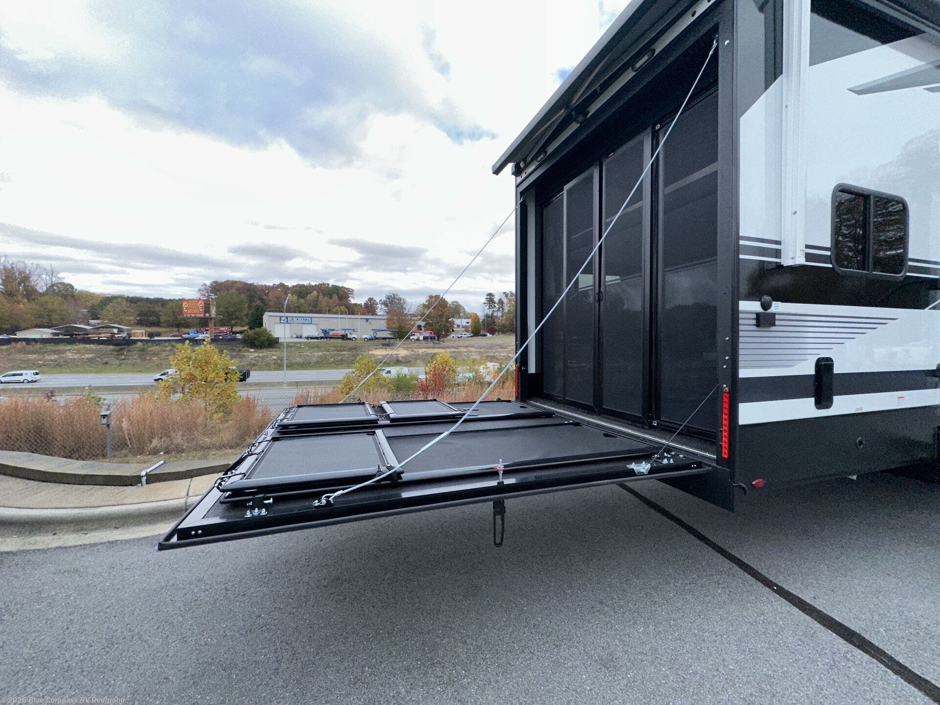 The 13' 6" garage is the perfect space for your toys, with enough room for your ATV, motorcycle, or other gear. Plus, the electric queen bed provides a comfortable spot to rest after a long day. The overhead loft with storage provides additional space for your gear, keeping it out of the way but still accessible. The kitchen is fully equipped with a microwave, sink, overhead cabinets, pantry, and coffee bar. The L-shaped sofa provides ample seating for relaxation, and the TV is perfectly positioned for viewing. The full bathroom is a welcome convenience, providing a private space to freshen up. Also, the front bedroom is a luxurious retreat, featuring a king bed, a walk-in closet, and drawers, and on the exterior, the two entry/exit doors provide easy access to the outside, making it perfect for loading and unloading your gear.