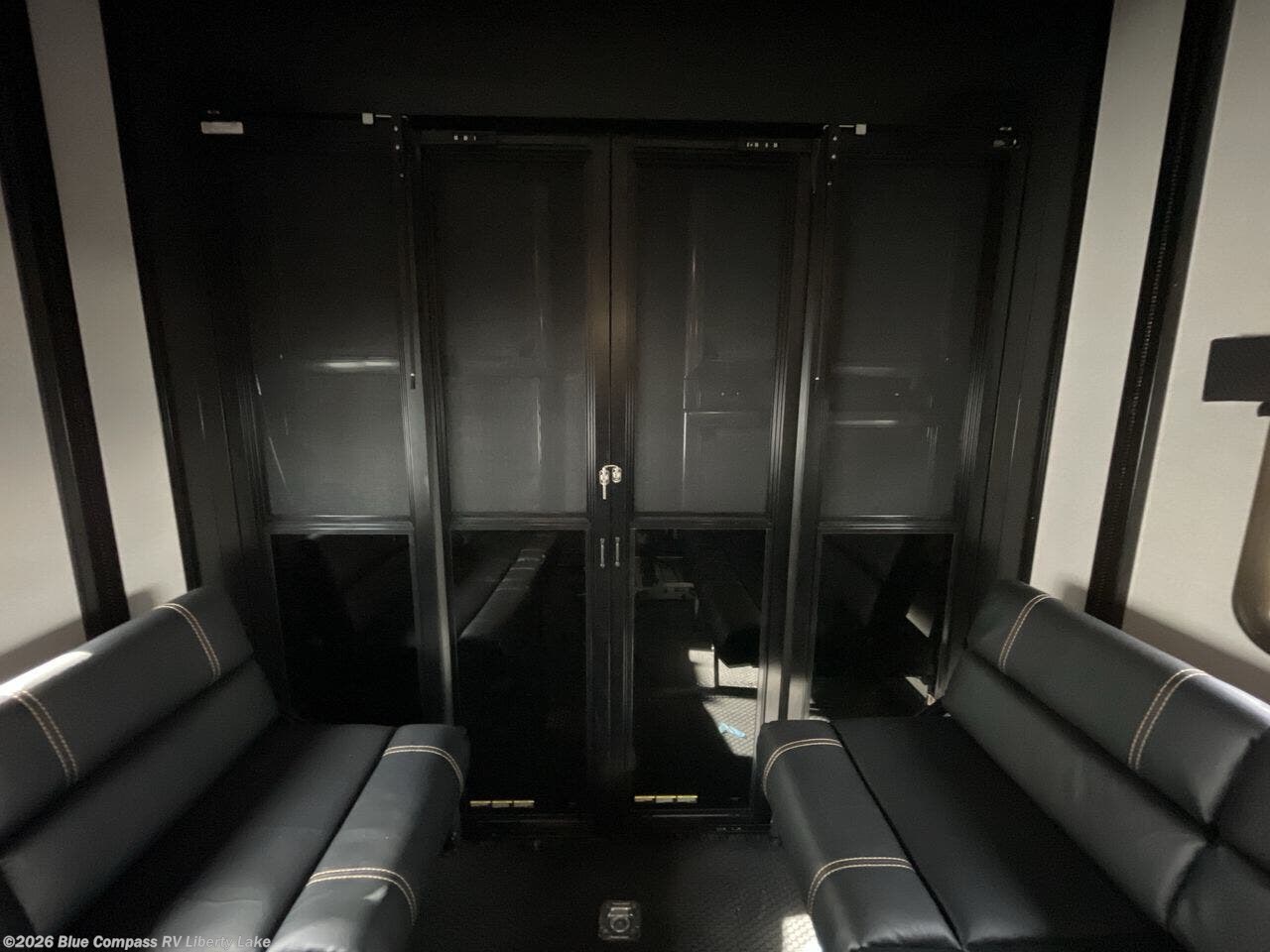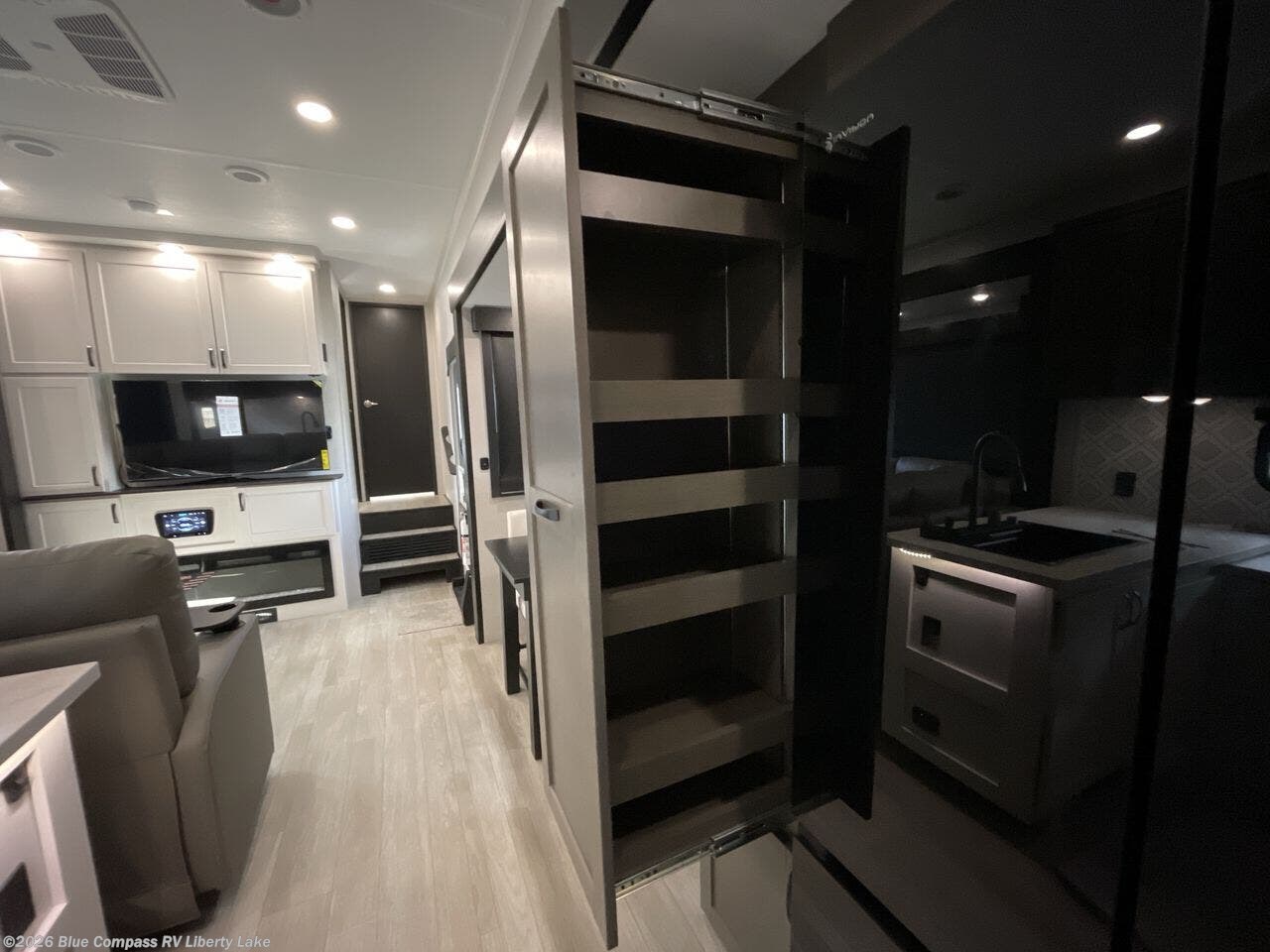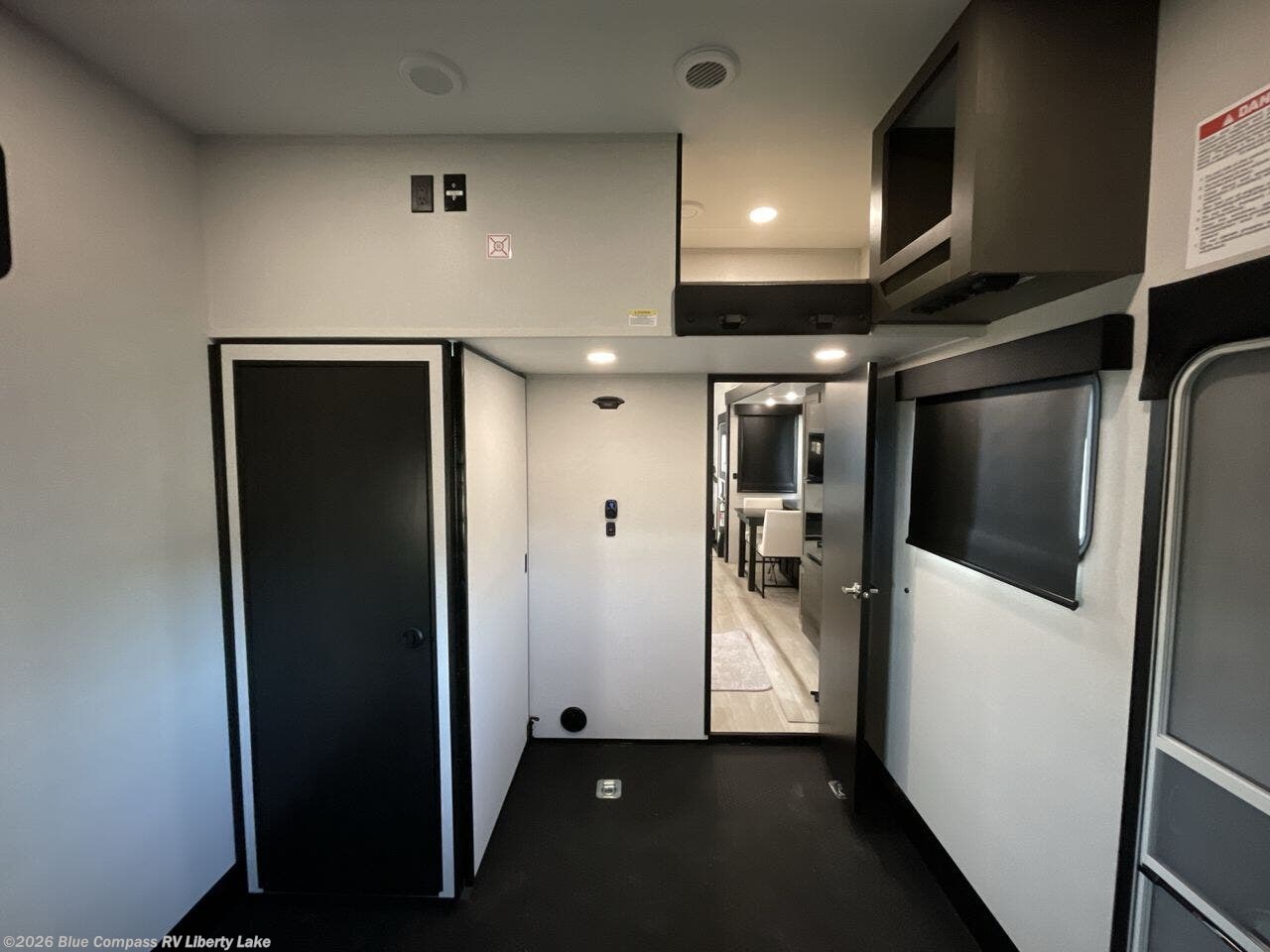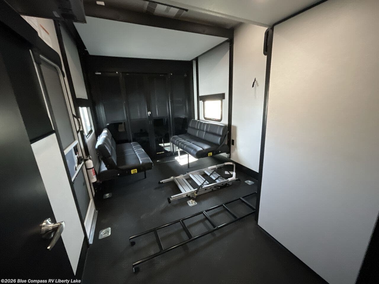 The 13' 6" garage is the perfect space for your toys, with enough room for your ATV, motorcycle, or other gear. Plus, the electric queen bed provides a comfortable spot to rest after a long day. The overhead loft with storage provides additional space for your gear, keeping it out of the way but still accessible. The kitchen is fully equipped with a microwave, sink, overhead cabinets, pantry, and coffee bar. The L-shaped sofa provides ample seating for relaxation, and the TV is perfectly positioned for viewing. The full bathroom is a welcome convenience, providing a private space to freshen up. Also, the front bedroom is a luxurious retreat, featuring a king bed, a walk-in closet, and drawers, and on the exterior, the two entry/exit doors provide easy access to the outside, making it perfect for loading and unloading your gear.