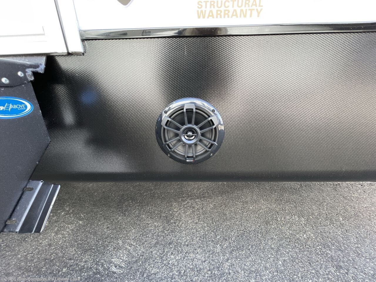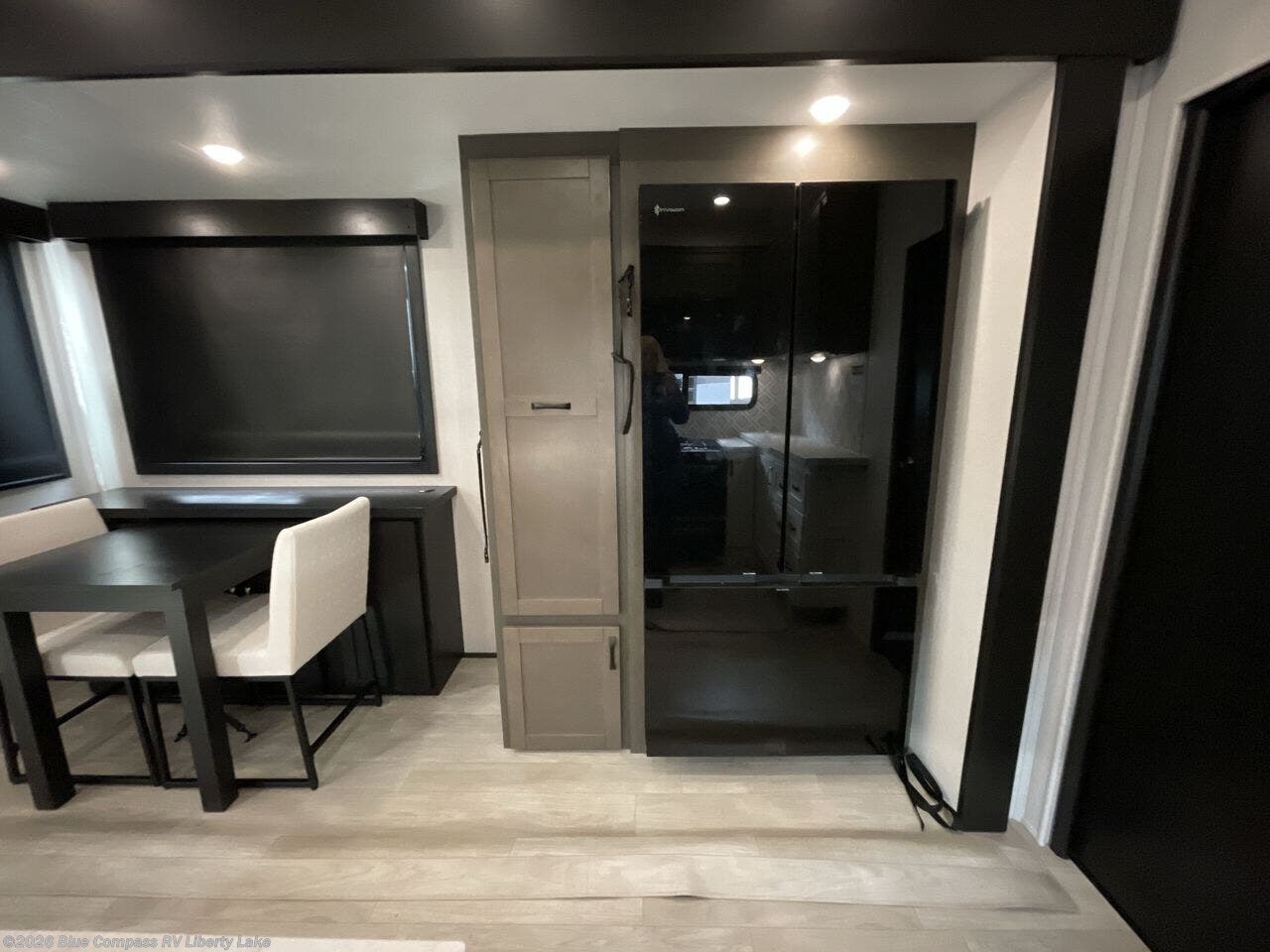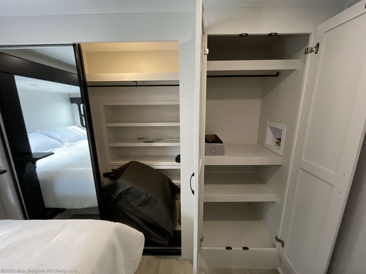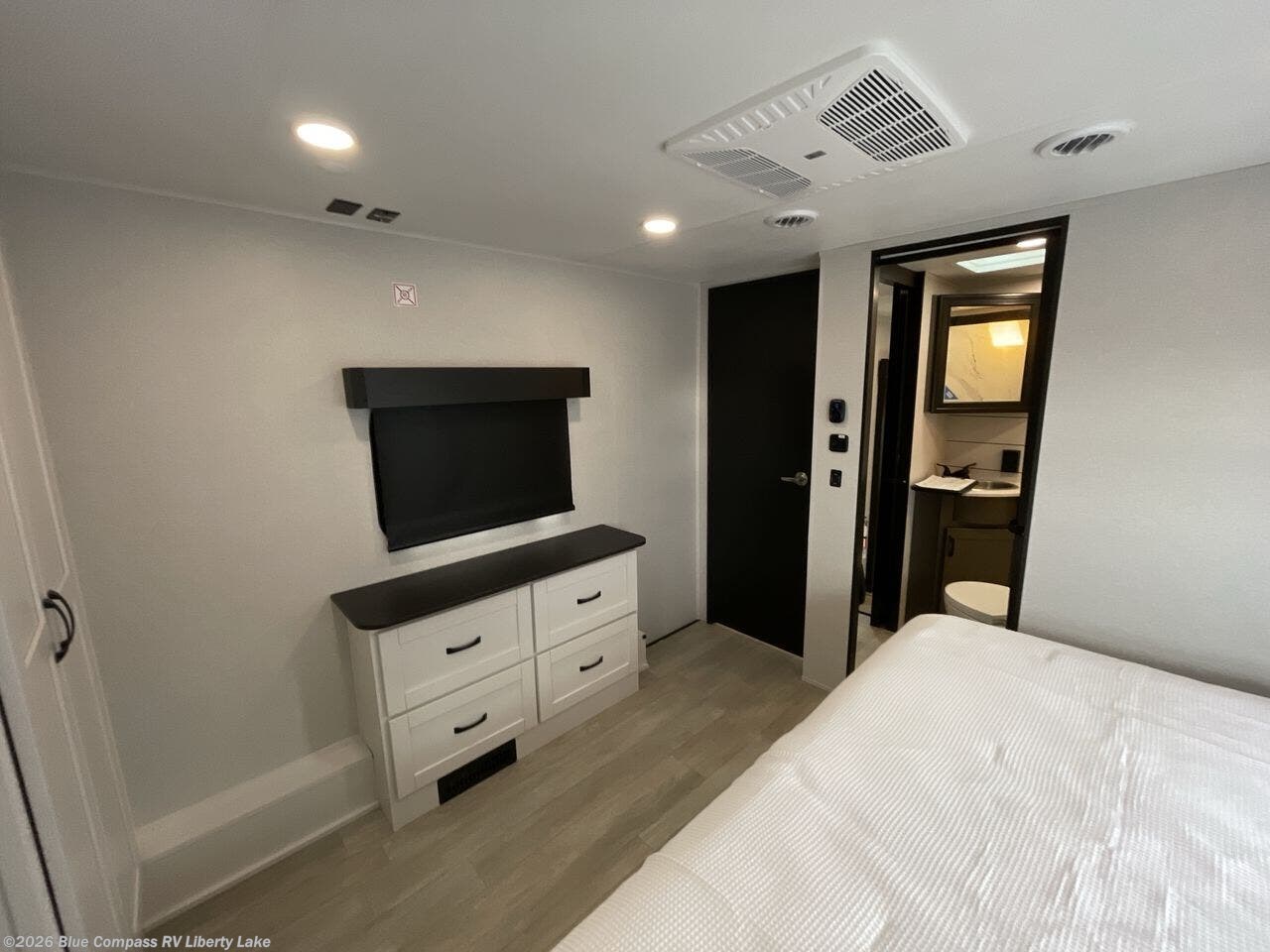 The 13' 6" garage is the perfect space for your toys, with enough room for your ATV, motorcycle, or other gear. Plus, the electric queen bed provides a comfortable spot to rest after a long day. The overhead loft with storage provides additional space for your gear, keeping it out of the way but still accessible. The kitchen is fully equipped with a microwave, sink, overhead cabinets, pantry, and coffee bar. The L-shaped sofa provides ample seating for relaxation, and the TV is perfectly positioned for viewing. The full bathroom is a welcome convenience, providing a private space to freshen up. Also, the front bedroom is a luxurious retreat, featuring a king bed, a walk-in closet, and drawers, and on the exterior, the two entry/exit doors provide easy access to the outside, making it perfect for loading and unloading your gear.