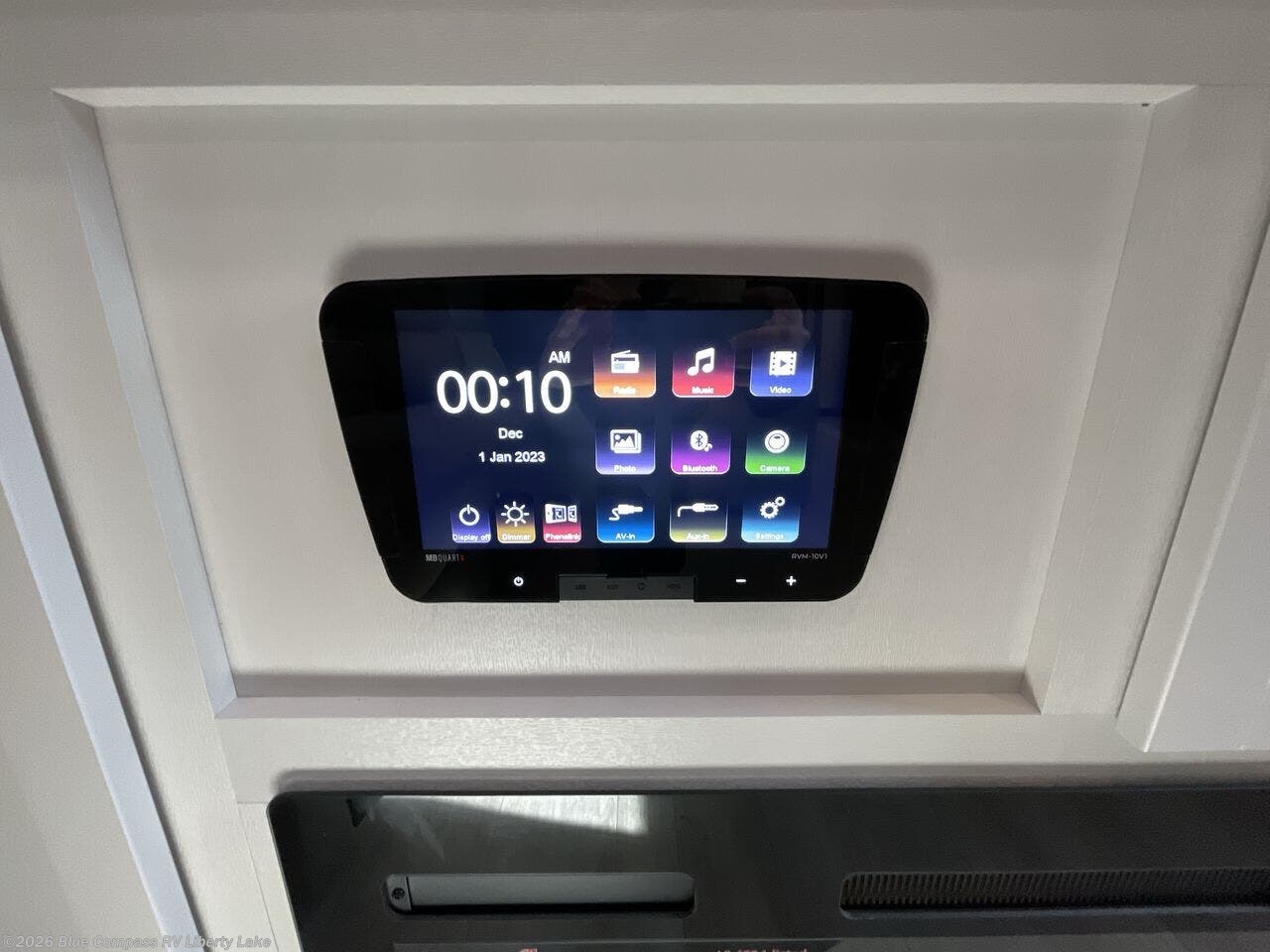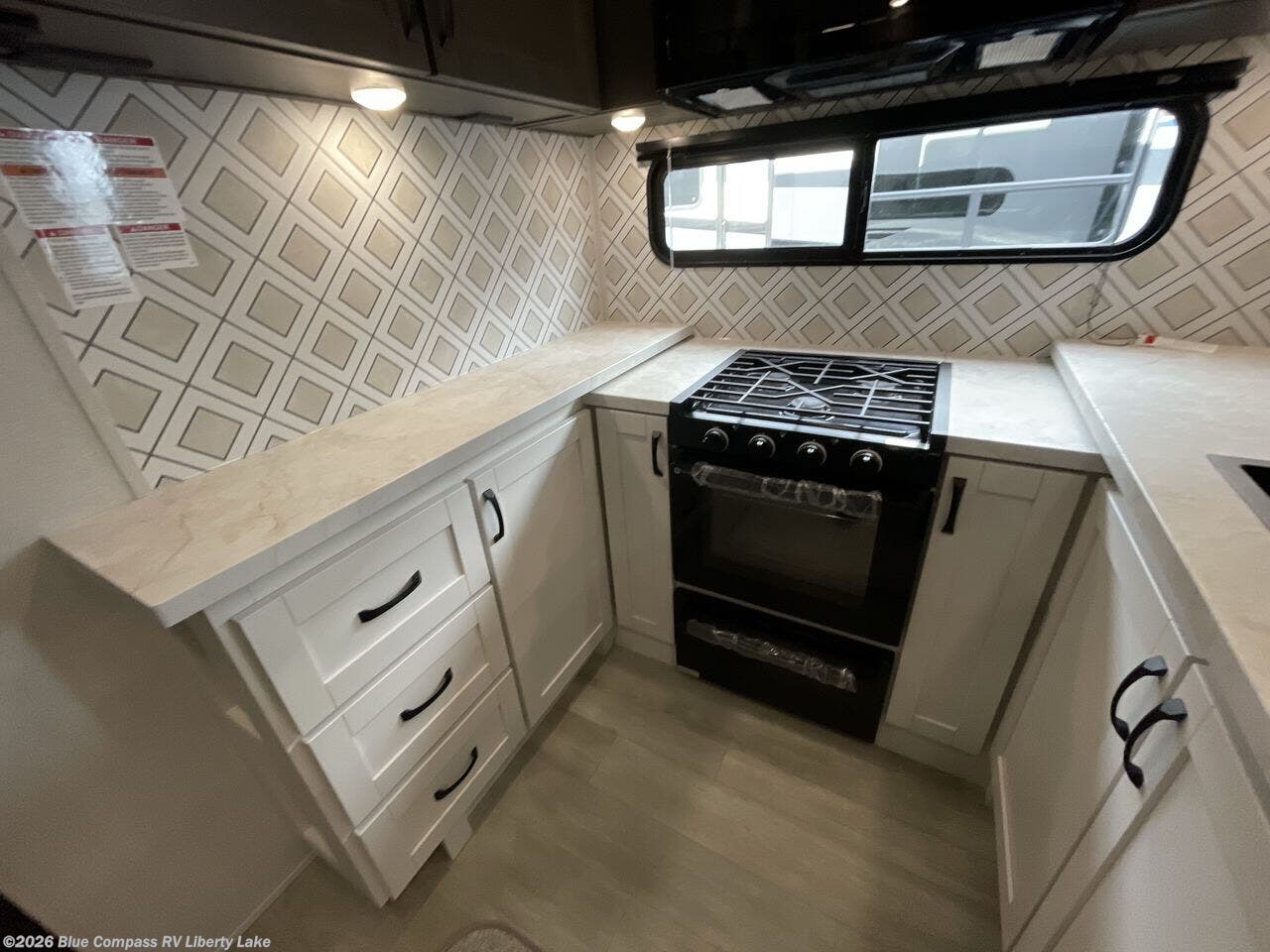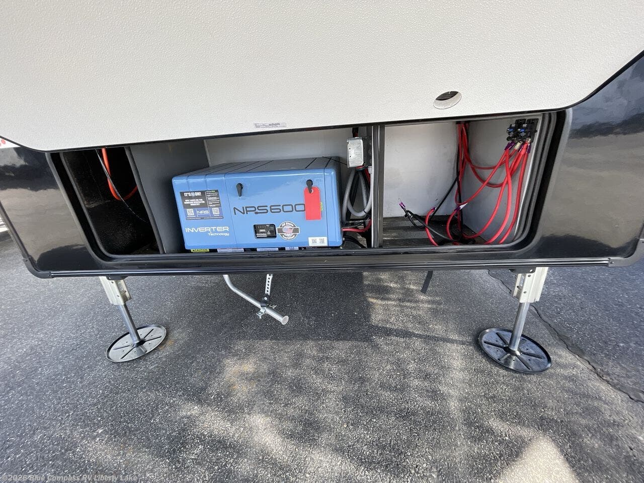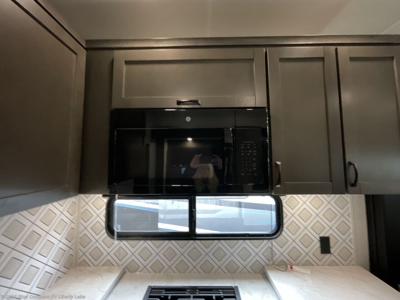 The 13' 6" garage is the perfect space for your toys, with enough room for your ATV, motorcycle, or other gear. Plus, the electric queen bed provides a comfortable spot to rest after a long day. The overhead loft with storage provides additional space for your gear, keeping it out of the way but still accessible. The kitchen is fully equipped with a microwave, sink, overhead cabinets, pantry, and coffee bar. The L-shaped sofa provides ample seating for relaxation, and the TV is perfectly positioned for viewing. The full bathroom is a welcome convenience, providing a private space to freshen up. Also, the front bedroom is a luxurious retreat, featuring a king bed, a walk-in closet, and drawers, and on the exterior, the two entry/exit doors provide easy access to the outside, making it perfect for loading and unloading your gear.