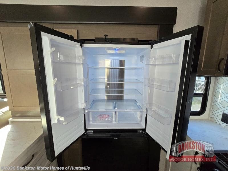 Get on the road with this toy hauler fifth wheel! The 14' garage is a playground for your toys, offering ample space for your ATV, motorcycle, or other gear. The loft above provides additional storage and an electric queen bed for a comfortable rest. The living room is a haven for relaxation, featuring an L-shaped sofa and a theater-style seat perfect for enjoying your favorite shows or movies on the TV. The kitchen is a culinary delight, equipped with a 12V refrigerator, microwave, overhead cabinets, and ample countertop space. The credenza with roll-out table is perfect for meal prep or serving, and the full bathroom provides a private space to freshen up, while the half bath option in the garage gives you more options. The cherry on top is that the front bedroom is a regal retreat, featuring a king bed, drawers, and a spacious walk-in closet.