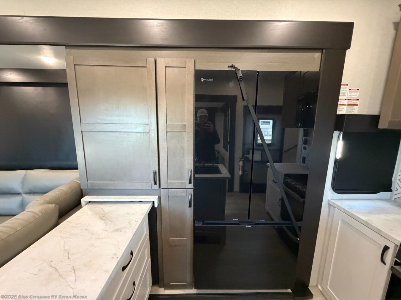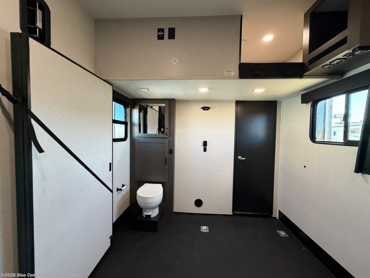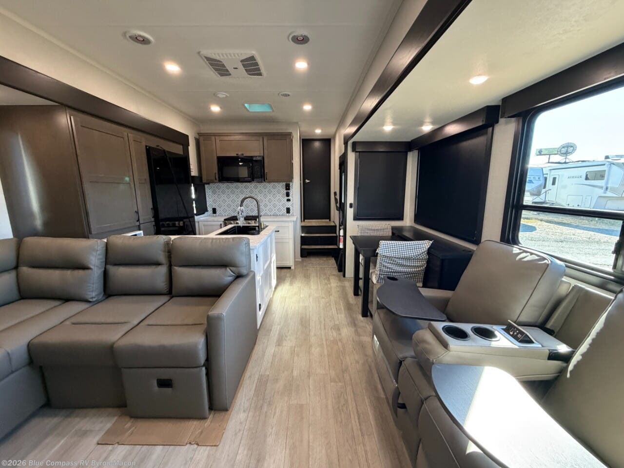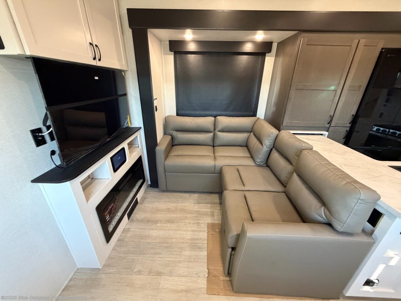 Get on the road with this toy hauler fifth wheel! The 14' garage is a playground for your toys, offering ample space for your ATV, motorcycle, or other gear. The loft above provides additional storage and an electric queen bed for a comfortable rest. The living room is a haven for relaxation, featuring an L-shaped sofa and a theater-style seat perfect for enjoying your favorite shows or movies on the TV. The kitchen is a culinary delight, equipped with a 12V refrigerator, microwave, overhead cabinets, and ample countertop space. The credenza with roll-out table is perfect for meal prep or serving, and the full bathroom provides a private space to freshen up, while the half bath option in the garage gives you more options. The cherry on top is that the front bedroom is a regal retreat, featuring a king bed, drawers, and a spacious walk-in closet.