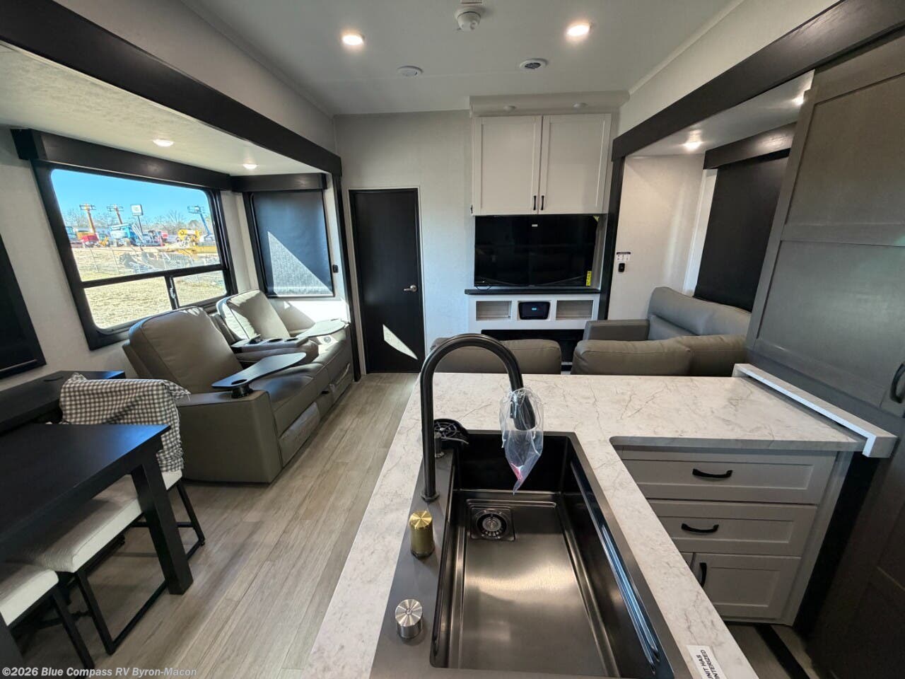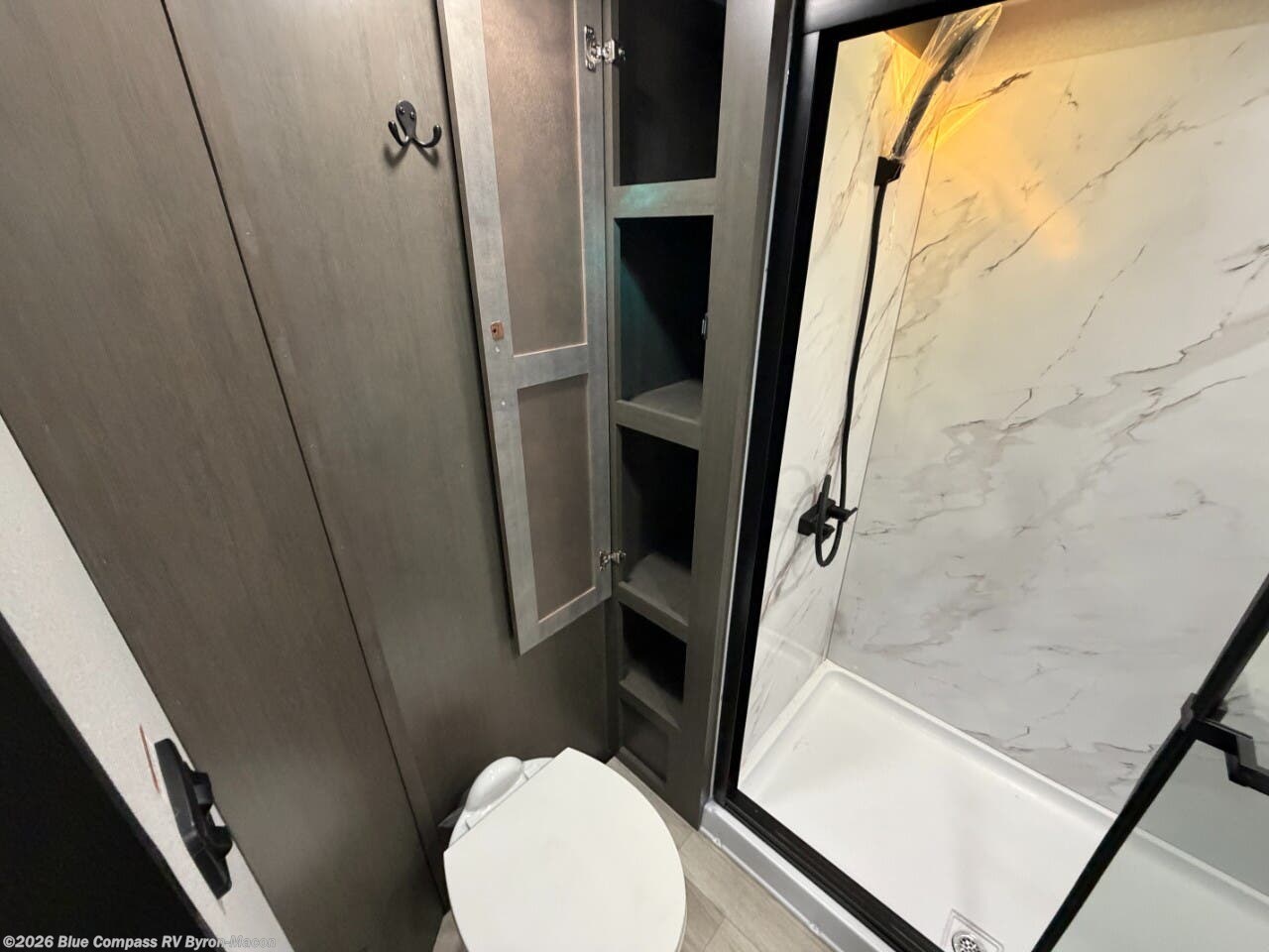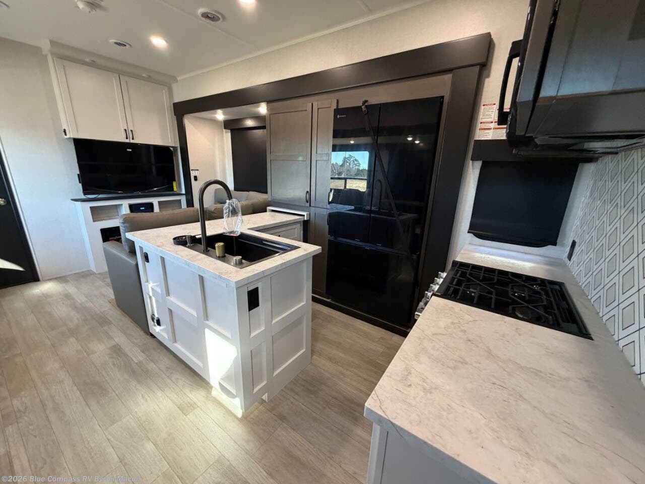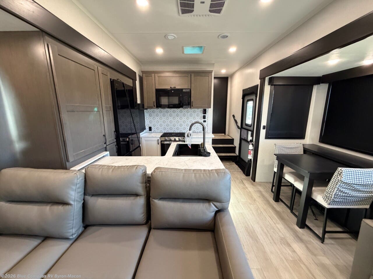 Get on the road with this toy hauler fifth wheel! The 14' garage is a playground for your toys, offering ample space for your ATV, motorcycle, or other gear. The loft above provides additional storage and an electric queen bed for a comfortable rest. The living room is a haven for relaxation, featuring an L-shaped sofa and a theater-style seat perfect for enjoying your favorite shows or movies on the TV. The kitchen is a culinary delight, equipped with a 12V refrigerator, microwave, overhead cabinets, and ample countertop space. The credenza with roll-out table is perfect for meal prep or serving, and the full bathroom provides a private space to freshen up, while the half bath option in the garage gives you more options. The cherry on top is that the front bedroom is a regal retreat, featuring a king bed, drawers, and a spacious walk-in closet.