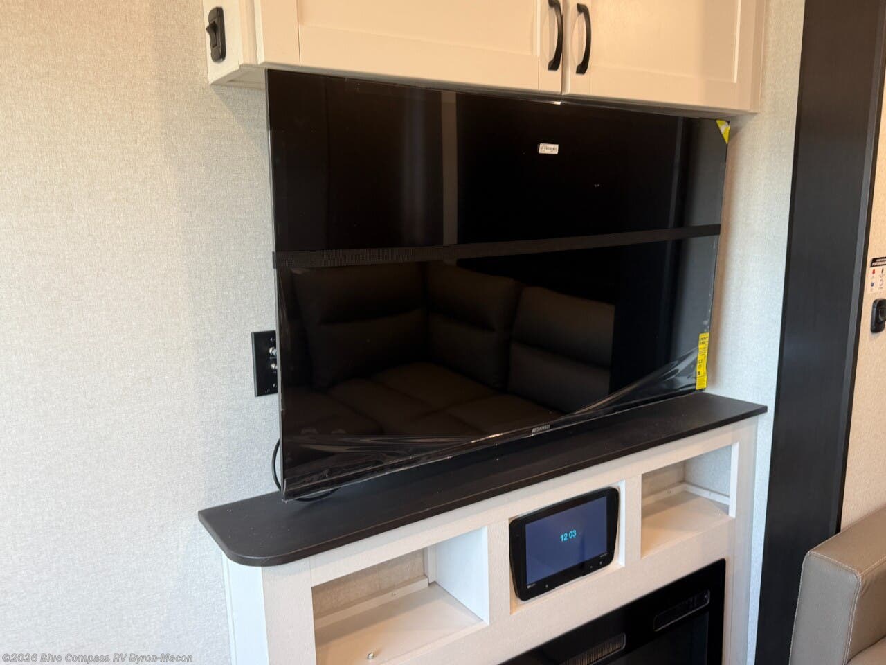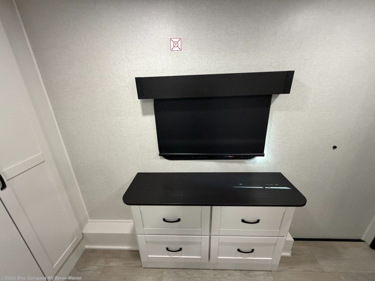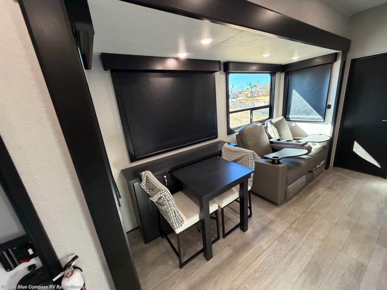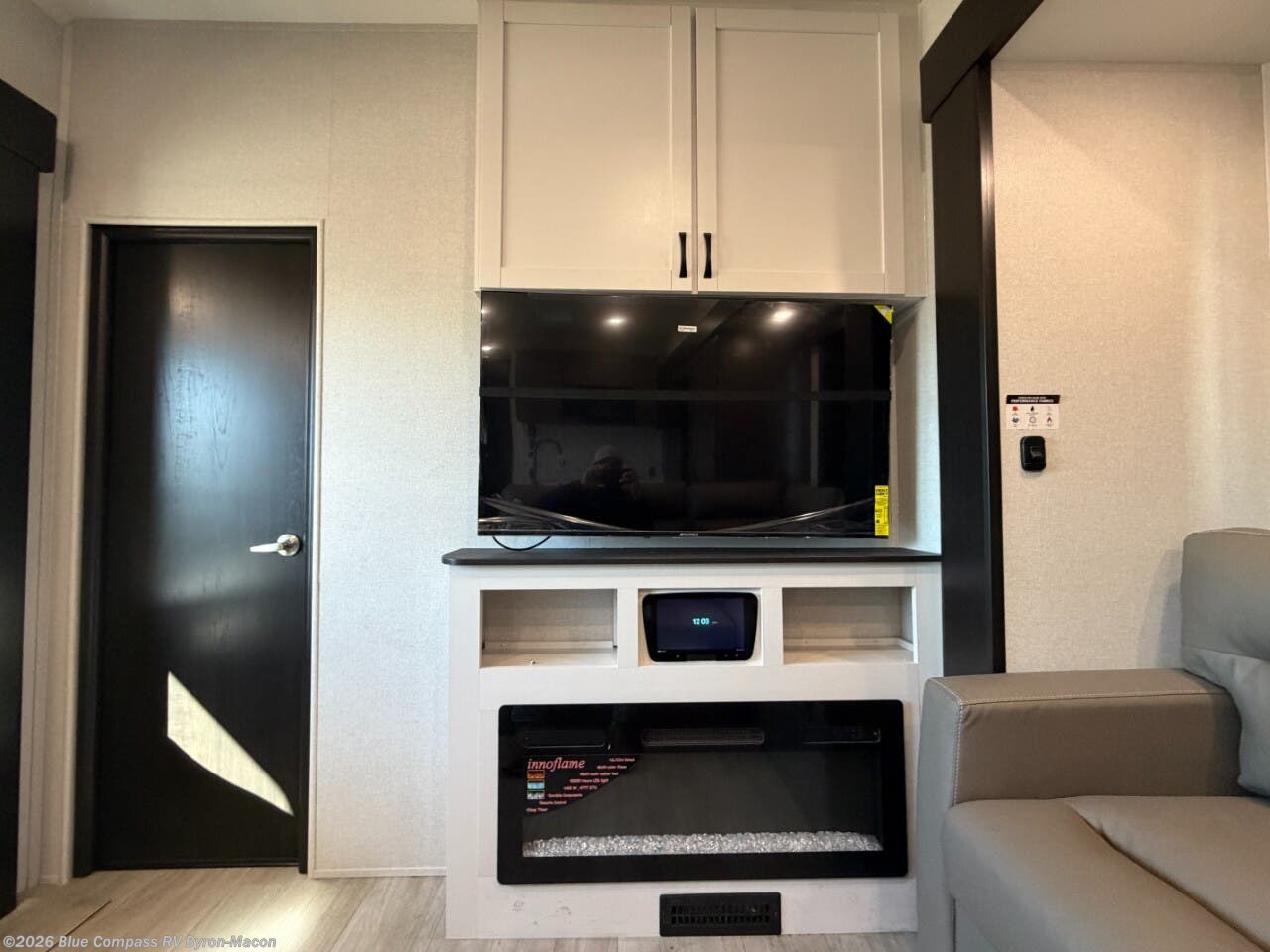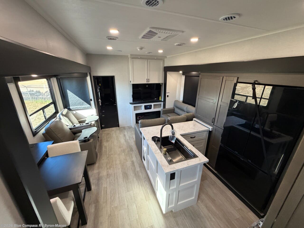 Get on the road with this toy hauler fifth wheel! The 14' garage is a playground for your toys, offering ample space for your ATV, motorcycle, or other gear. The loft above provides additional storage and an electric queen bed for a comfortable rest. The living room is a haven for relaxation, featuring an L-shaped sofa and a theater-style seat perfect for enjoying your favorite shows or movies on the TV. The kitchen is a culinary delight, equipped with a 12V refrigerator, microwave, overhead cabinets, and ample countertop space. The credenza with roll-out table is perfect for meal prep or serving, and the full bathroom provides a private space to freshen up, while the half bath option in the garage gives you more options. The cherry on top is that the front bedroom is a regal retreat, featuring a king bed, drawers, and a spacious walk-in closet.