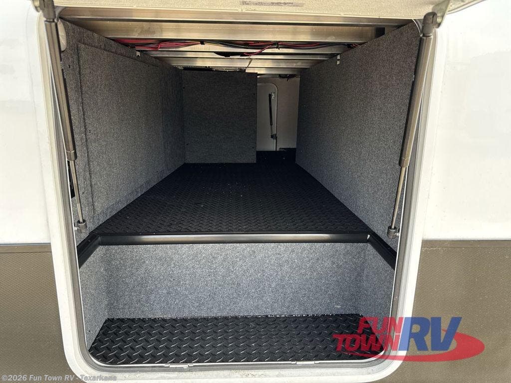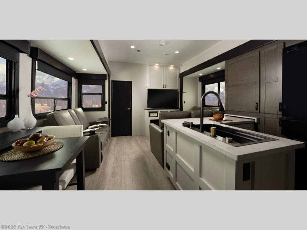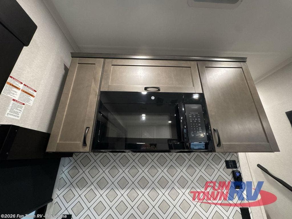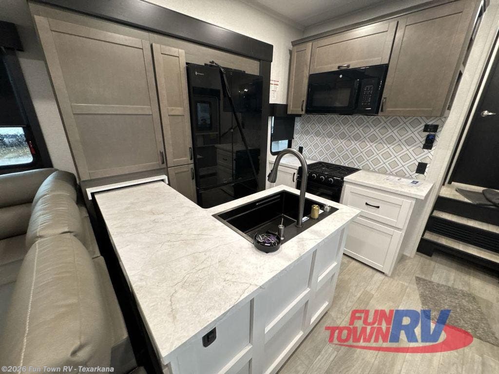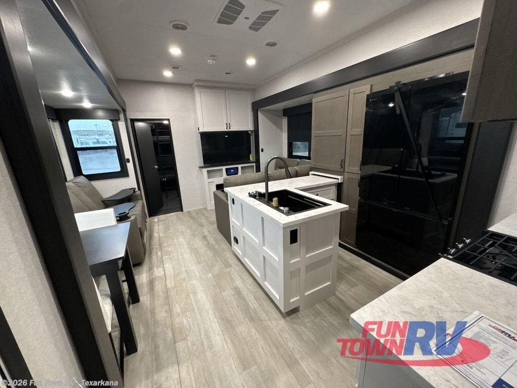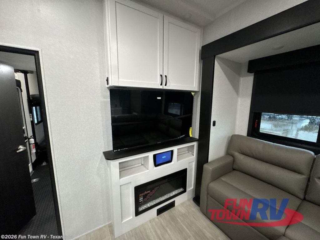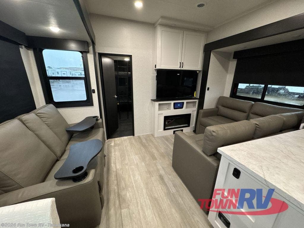 Get on the road with this toy hauler fifth wheel! The 14' garage is a playground for your toys, offering ample space for your ATV, motorcycle, or other gear. The loft above provides additional storage and an electric queen bed for a comfortable rest. The living room is a haven for relaxation, featuring an L-shaped sofa and a theater-style seat perfect for enjoying your favorite shows or movies on the TV. The kitchen is a culinary delight, equipped with a 12V refrigerator, microwave, overhead cabinets, and ample countertop space. The credenza with roll-out table is perfect for meal prep or serving, and the full bathroom provides a private space to freshen up, while the half bath option in the garage gives you more options. The cherry on top is that the front bedroom is a regal retreat, featuring a king bed, drawers, and a spacious walk-in closet.