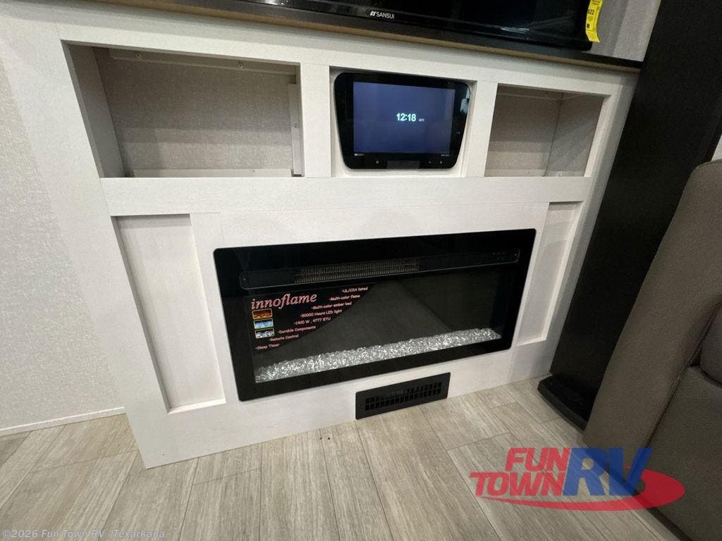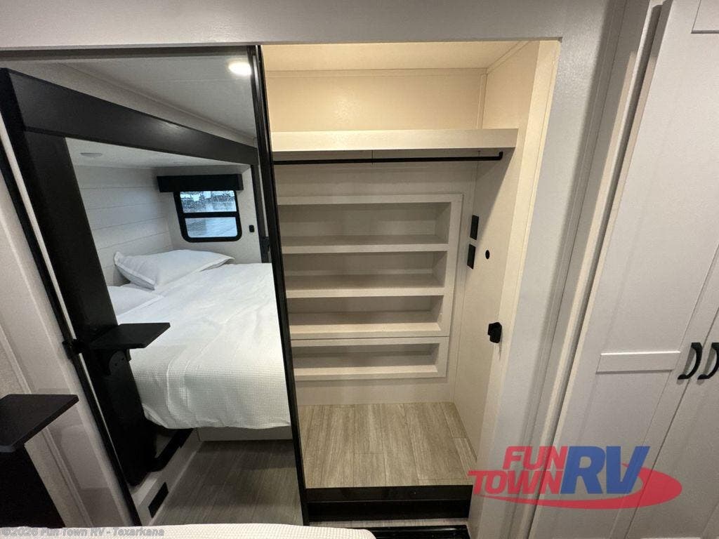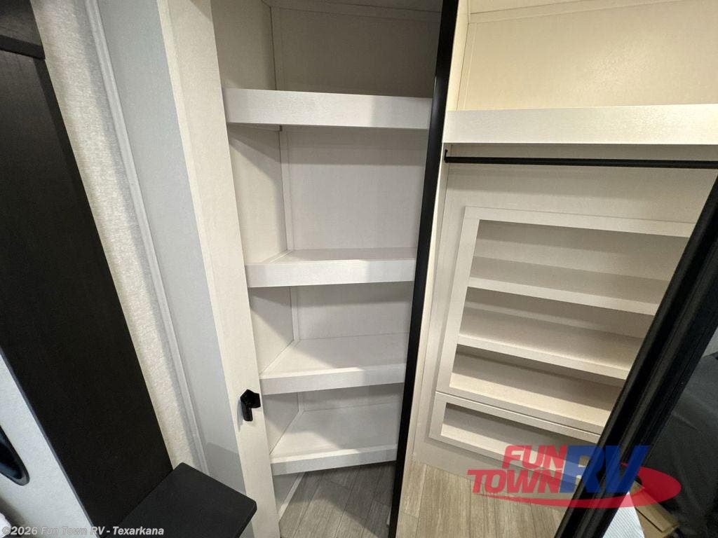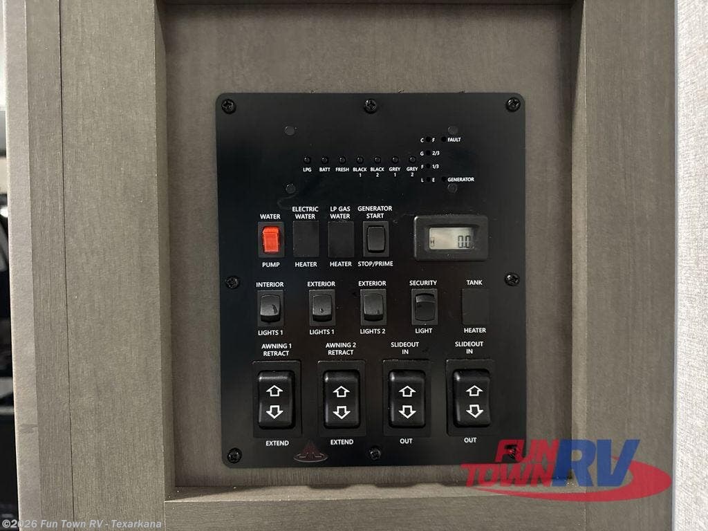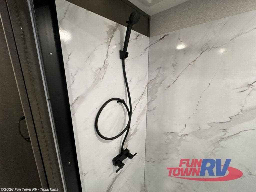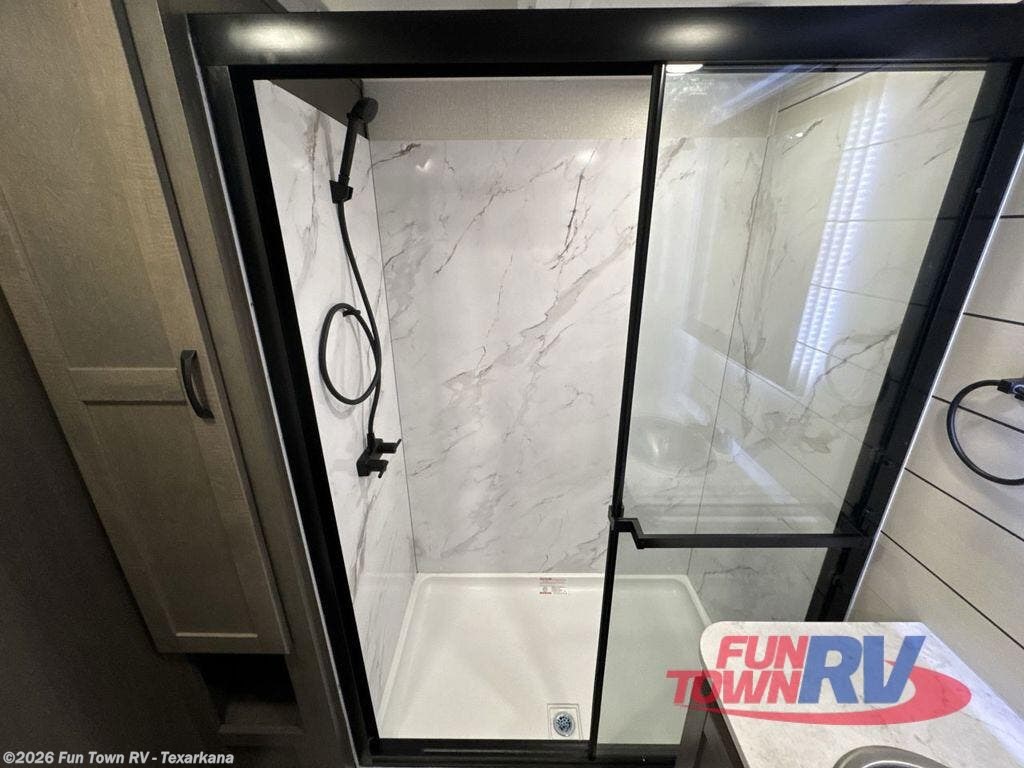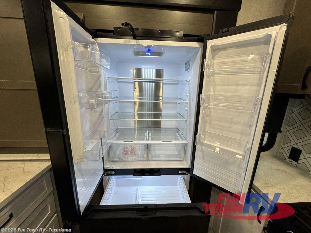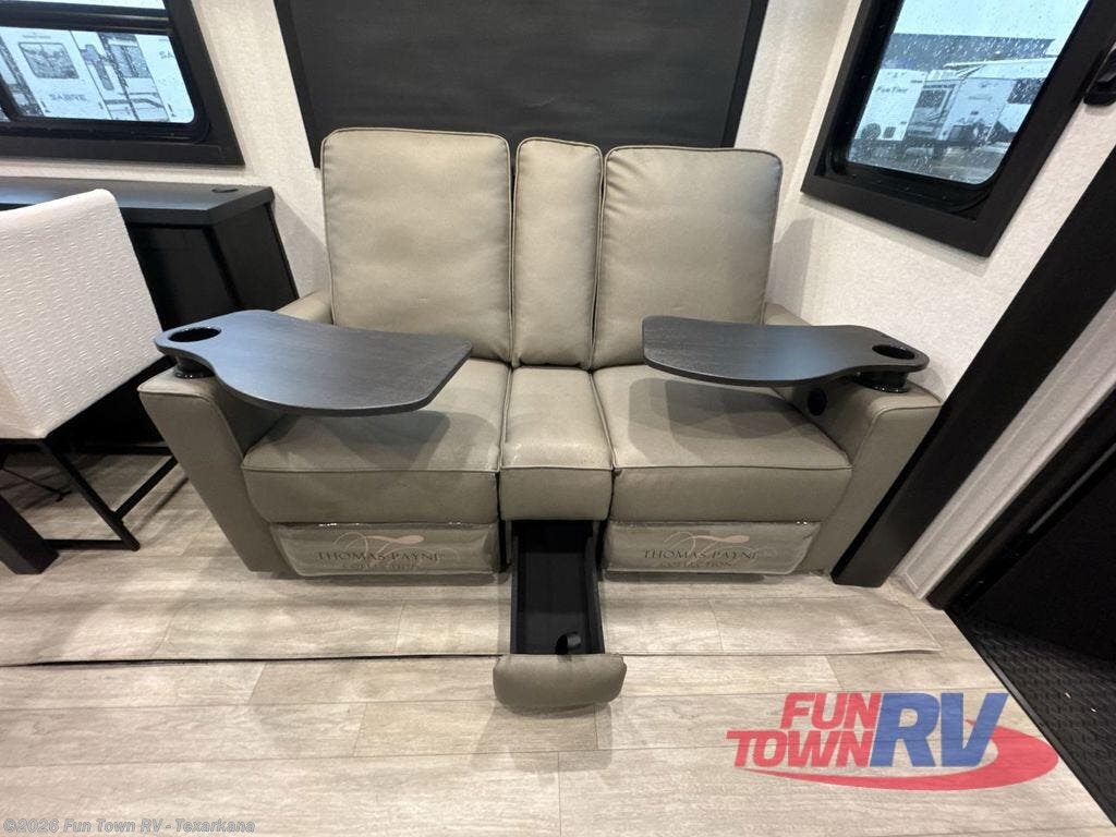 Get on the road with this toy hauler fifth wheel! The 14' garage is a playground for your toys, offering ample space for your ATV, motorcycle, or other gear. The loft above provides additional storage and an electric queen bed for a comfortable rest. The living room is a haven for relaxation, featuring an L-shaped sofa and a theater-style seat perfect for enjoying your favorite shows or movies on the TV. The kitchen is a culinary delight, equipped with a 12V refrigerator, microwave, overhead cabinets, and ample countertop space. The credenza with roll-out table is perfect for meal prep or serving, and the full bathroom provides a private space to freshen up, while the half bath option in the garage gives you more options. The cherry on top is that the front bedroom is a regal retreat, featuring a king bed, drawers, and a spacious walk-in closet.