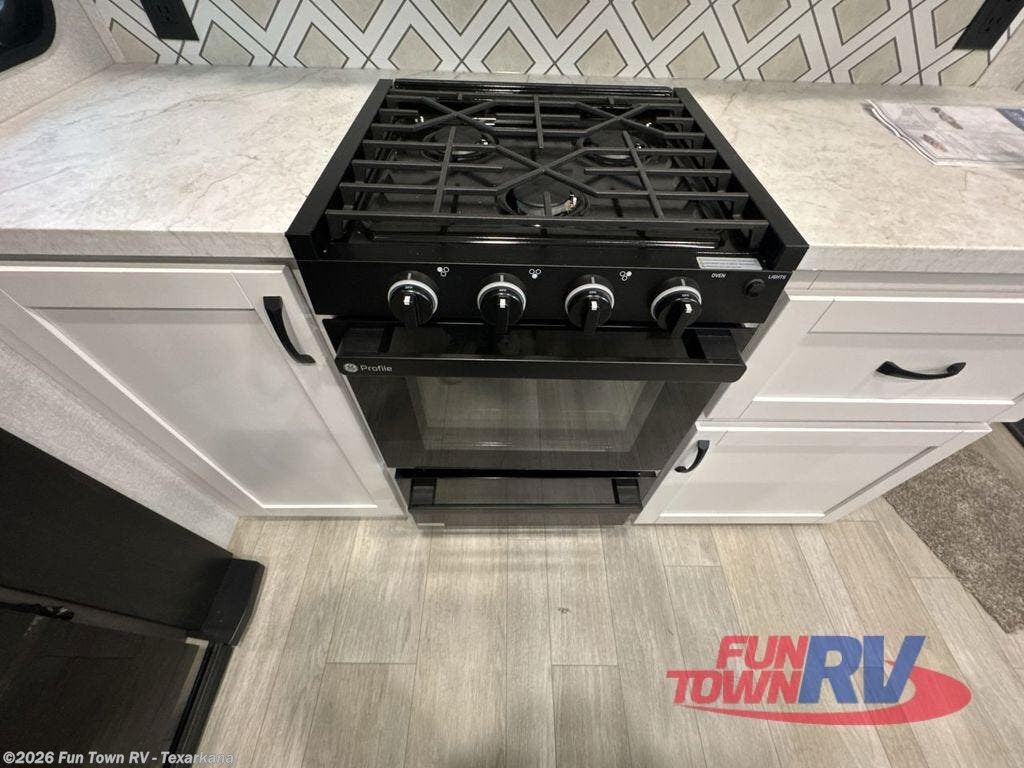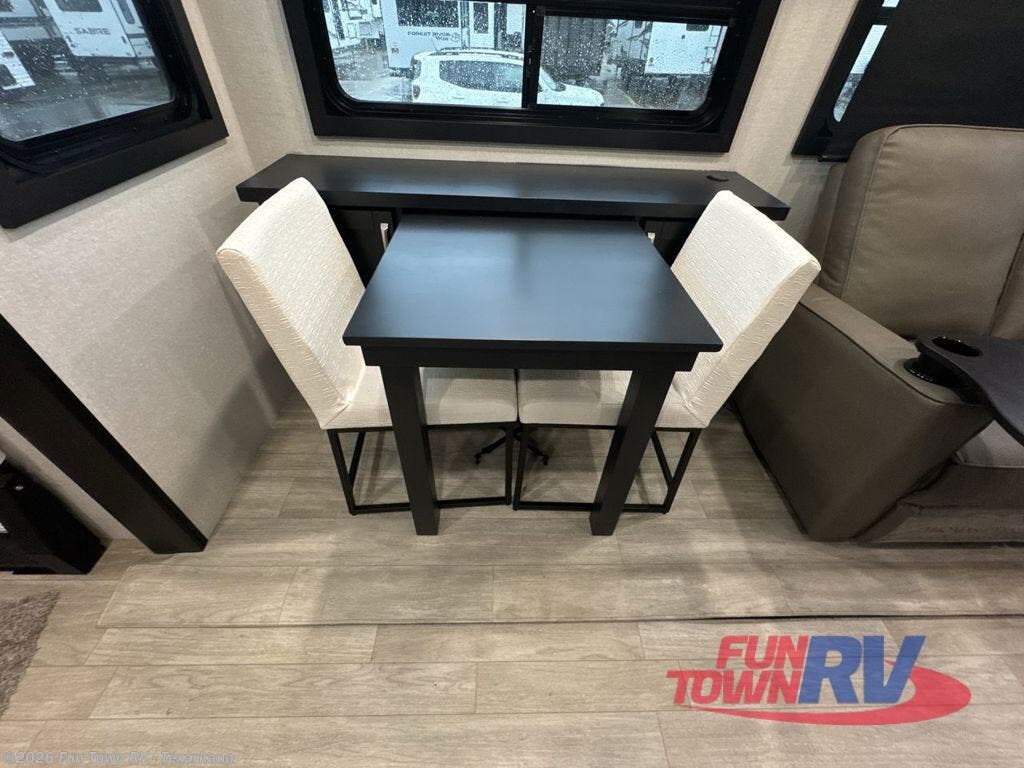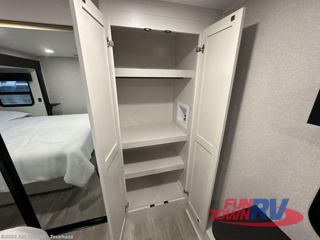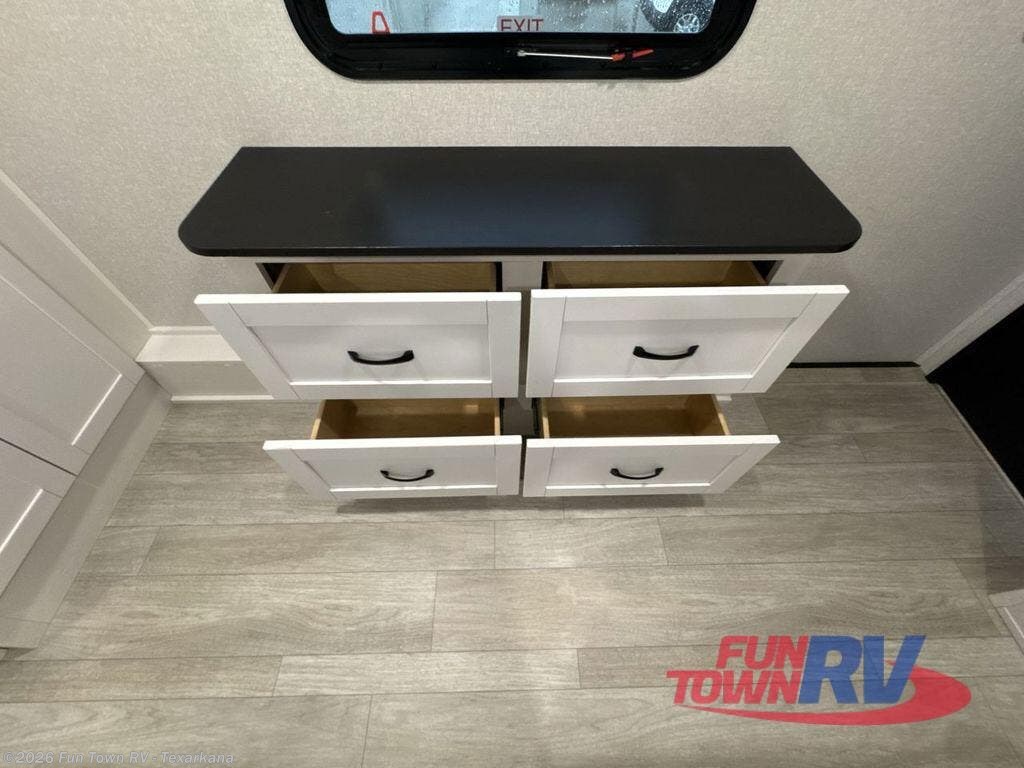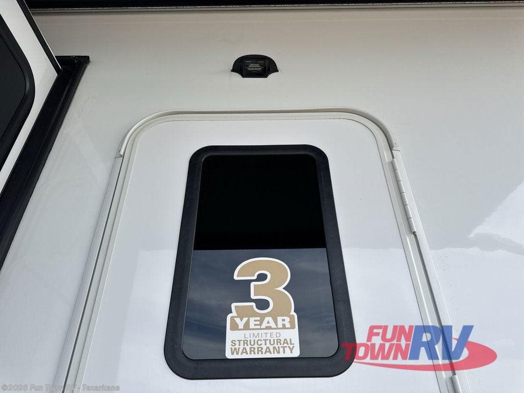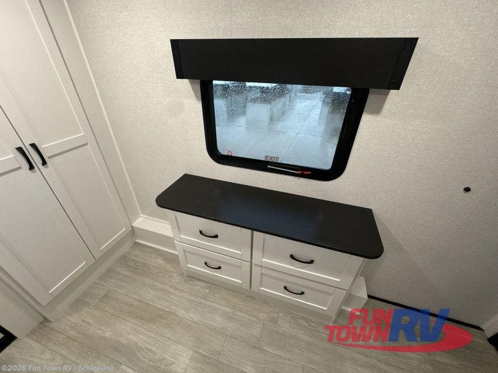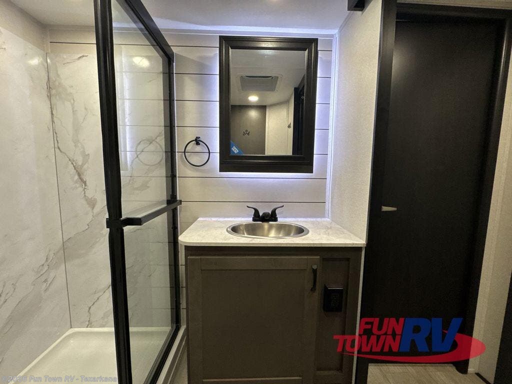 Get on the road with this toy hauler fifth wheel! The 14' garage is a playground for your toys, offering ample space for your ATV, motorcycle, or other gear. The loft above provides additional storage and an electric queen bed for a comfortable rest. The living room is a haven for relaxation, featuring an L-shaped sofa and a theater-style seat perfect for enjoying your favorite shows or movies on the TV. The kitchen is a culinary delight, equipped with a 12V refrigerator, microwave, overhead cabinets, and ample countertop space. The credenza with roll-out table is perfect for meal prep or serving, and the full bathroom provides a private space to freshen up, while the half bath option in the garage gives you more options. The cherry on top is that the front bedroom is a regal retreat, featuring a king bed, drawers, and a spacious walk-in closet.