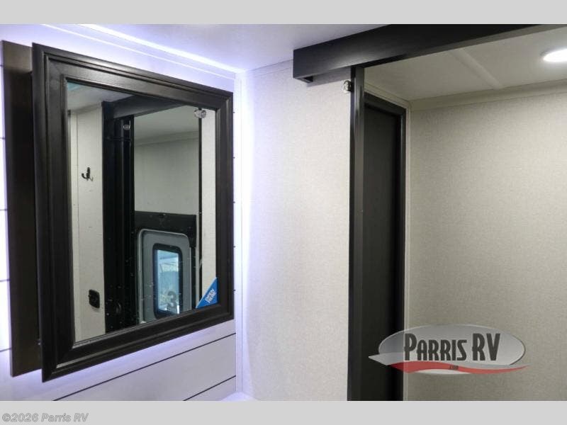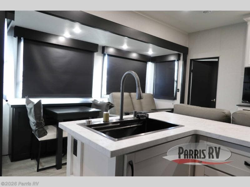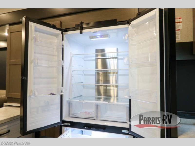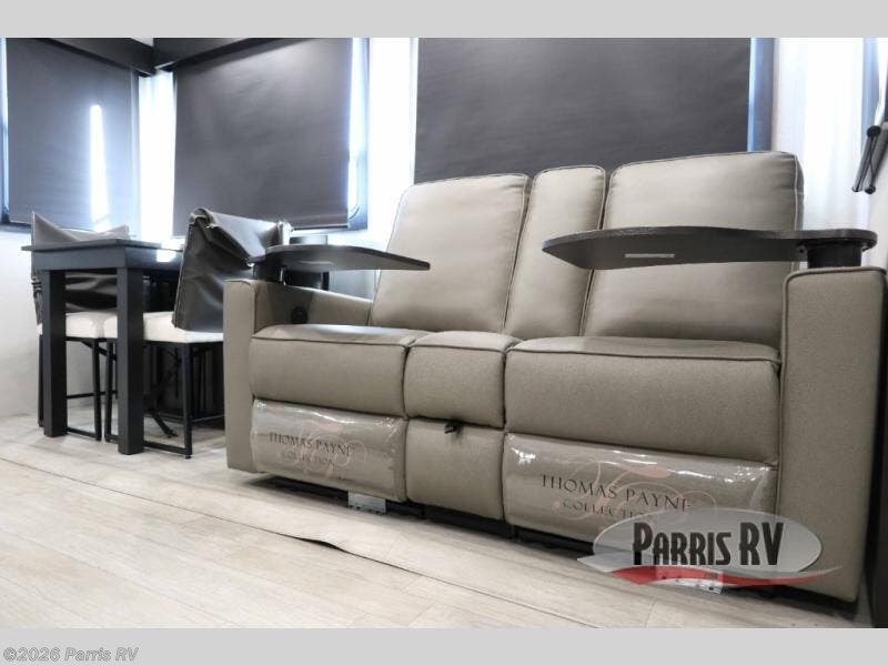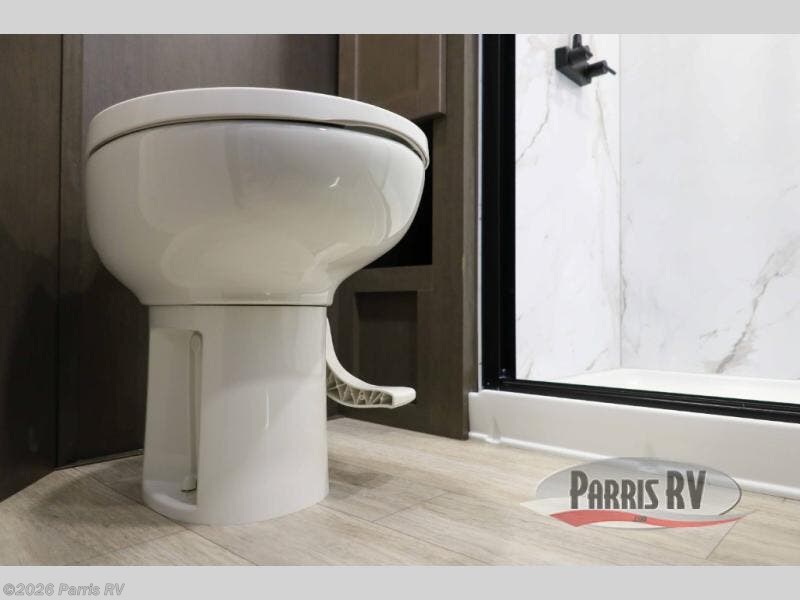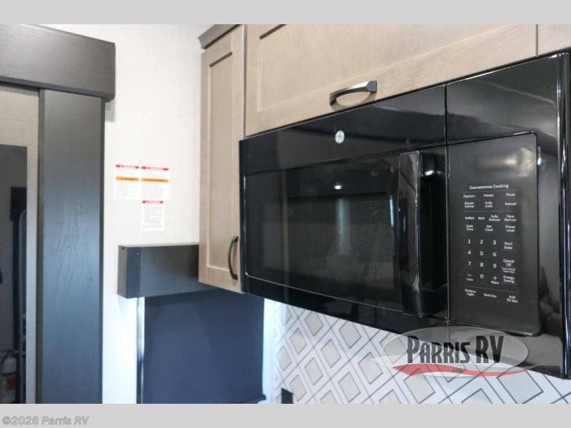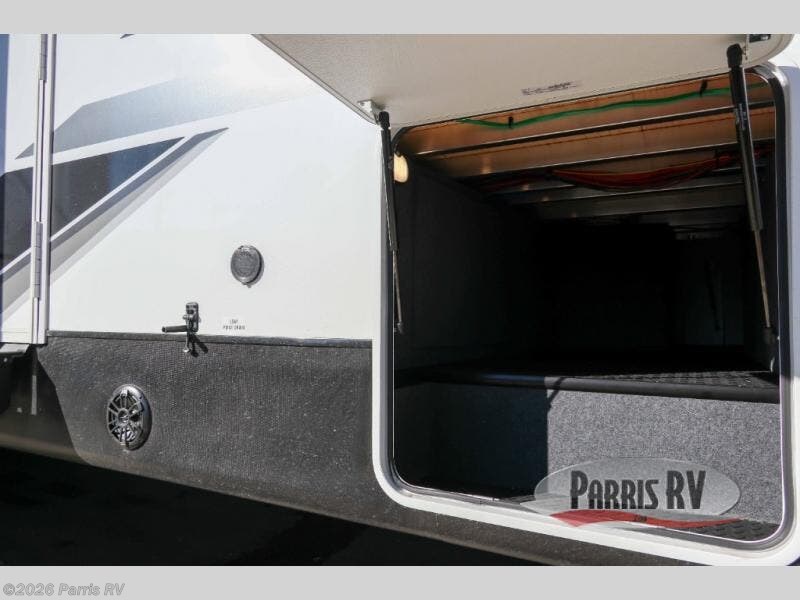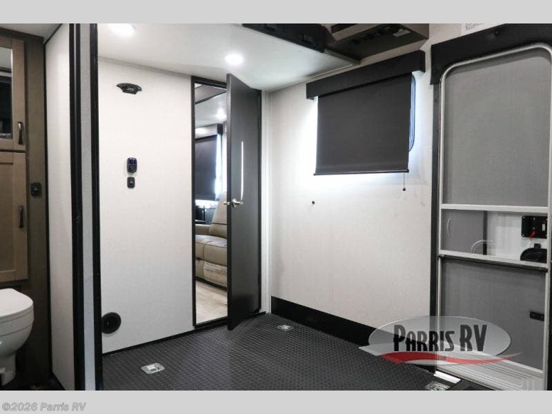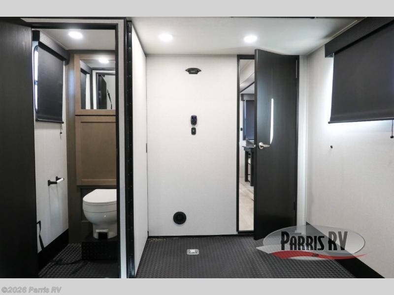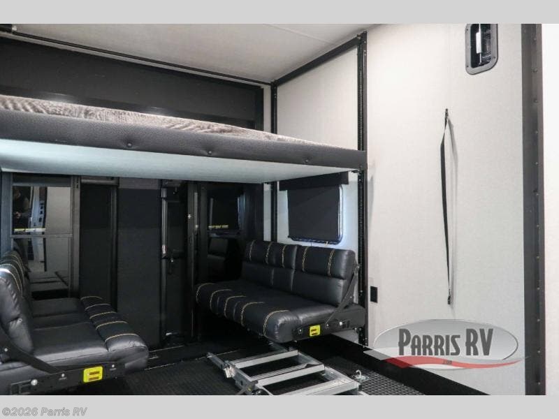 Get on the road with this toy hauler fifth wheel! The 14' garage is a playground for your toys, offering ample space for your ATV, motorcycle, or other gear. The loft above provides additional storage and an electric queen bed for a comfortable rest. The living room is a haven for relaxation, featuring an L-shaped sofa and a theater-style seat perfect for enjoying your favorite shows or movies on the TV. The kitchen is a culinary delight, equipped with a 12V refrigerator, microwave, overhead cabinets, and ample countertop space. The credenza with roll-out table is perfect for meal prep or serving, and the full bathroom provides a private space to freshen up, while the half bath option in the garage gives you more options. The cherry on top is that the front bedroom is a regal retreat, featuring a king bed, drawers, and a spacious walk-in closet.
