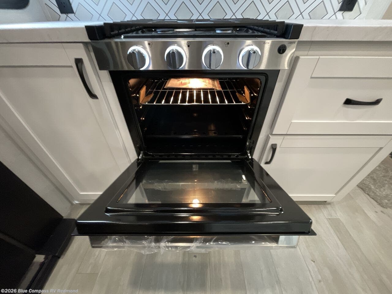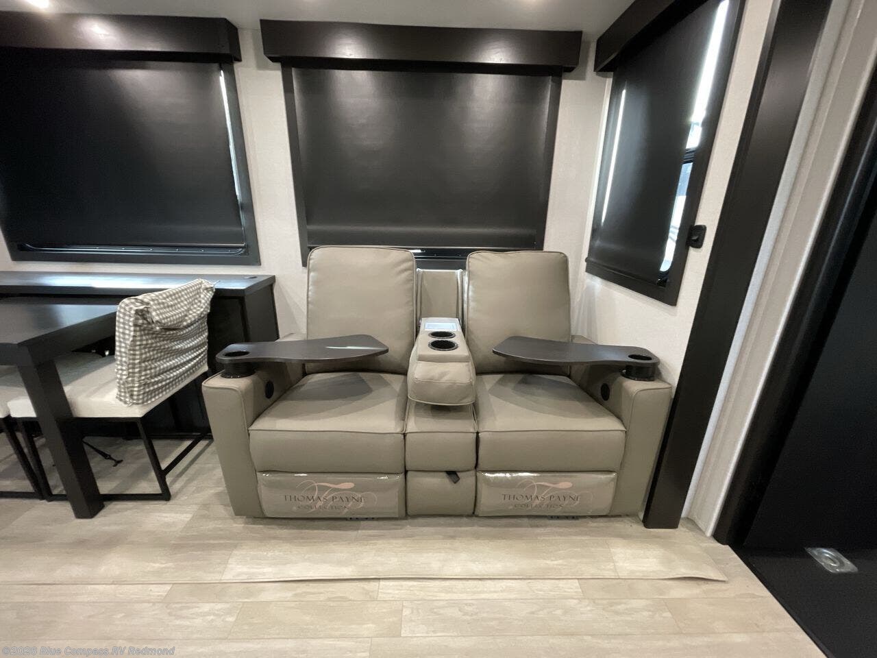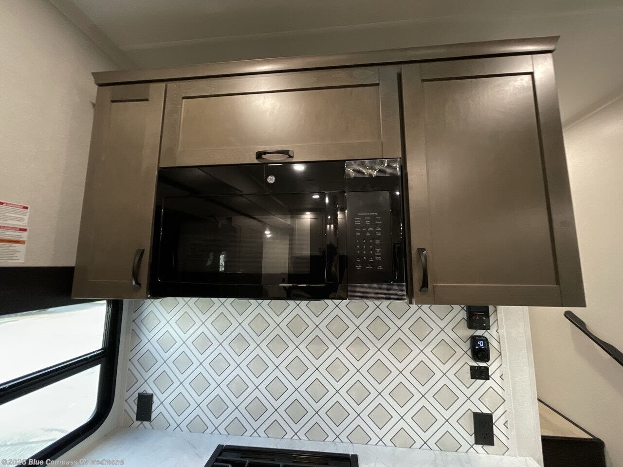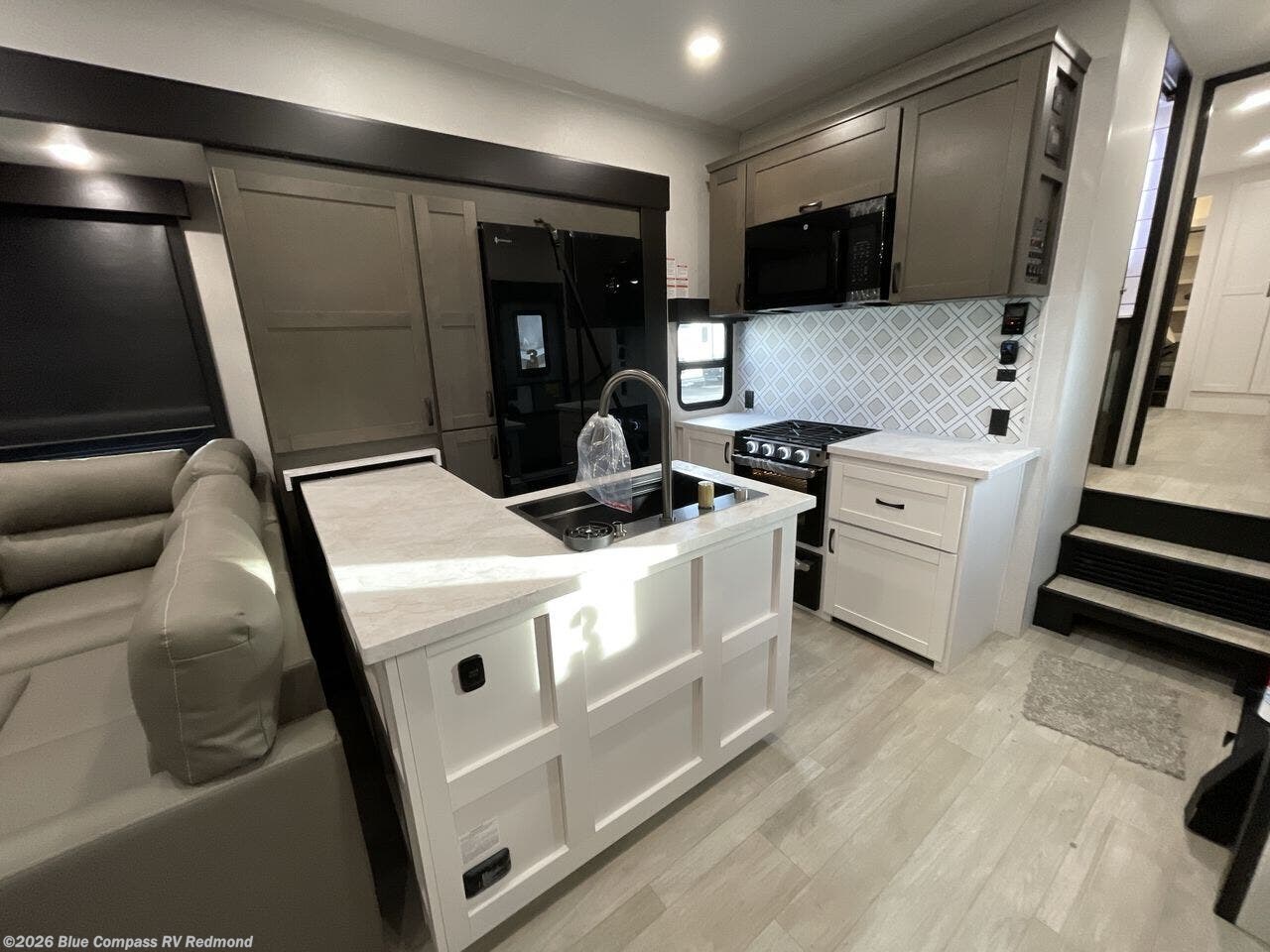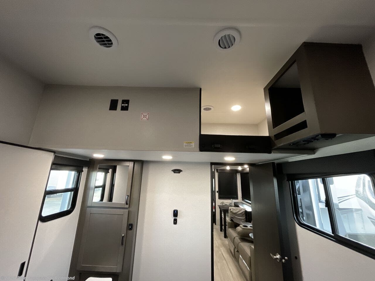 Get on the road with this toy hauler fifth wheel! The 14' garage is a playground for your toys, offering ample space for your ATV, motorcycle, or other gear. The loft above provides additional storage and an electric queen bed for a comfortable rest. The living room is a haven for relaxation, featuring an L-shaped sofa and a theater-style seat perfect for enjoying your favorite shows or movies on the TV. The kitchen is a culinary delight, equipped with a 12V refrigerator, microwave, overhead cabinets, and ample countertop space. The credenza with roll-out table is perfect for meal prep or serving, and the full bathroom provides a private space to freshen up, while the half bath option in the garage gives you more options. The cherry on top is that the front bedroom is a regal retreat, featuring a king bed, drawers, and a spacious walk-in closet.
